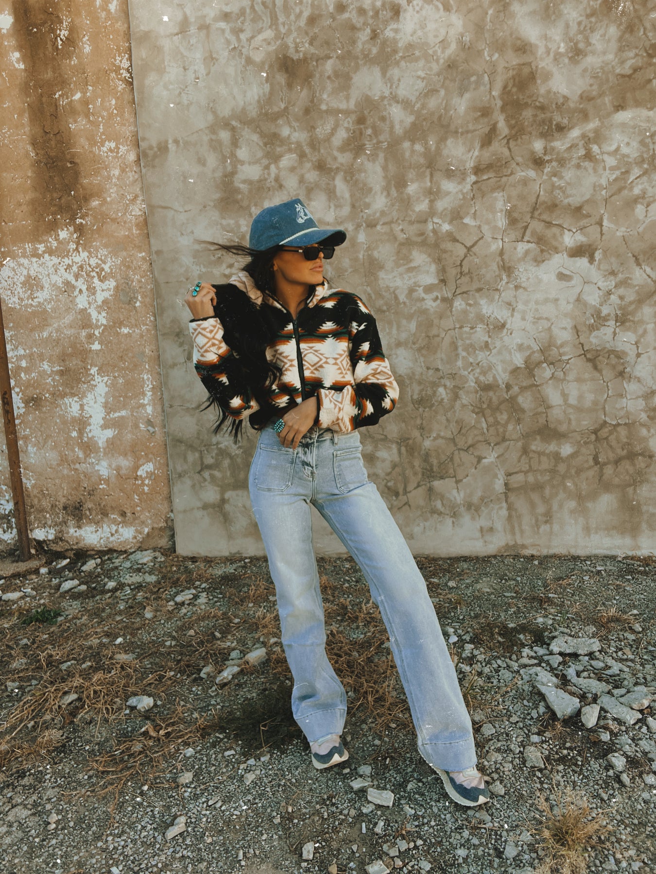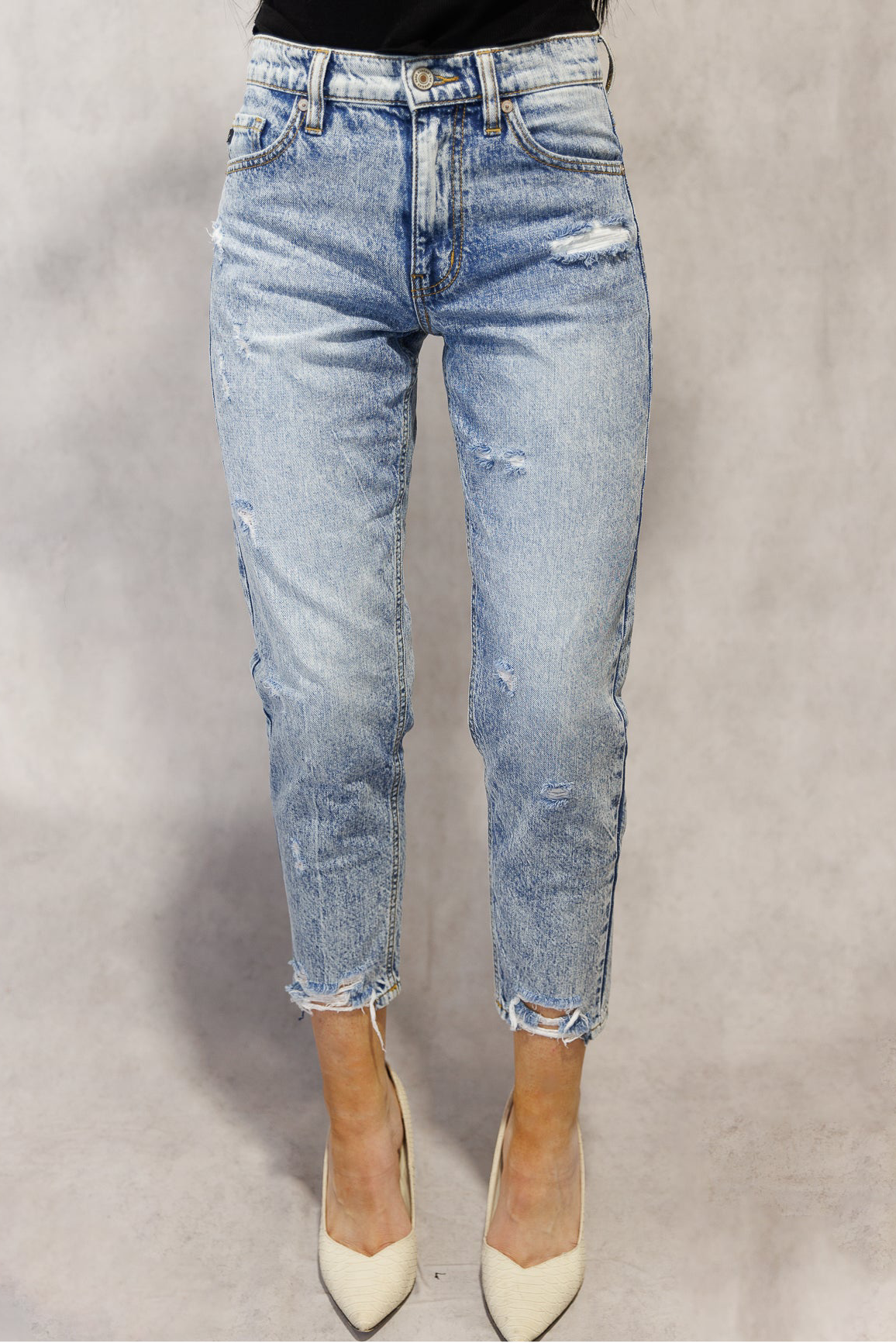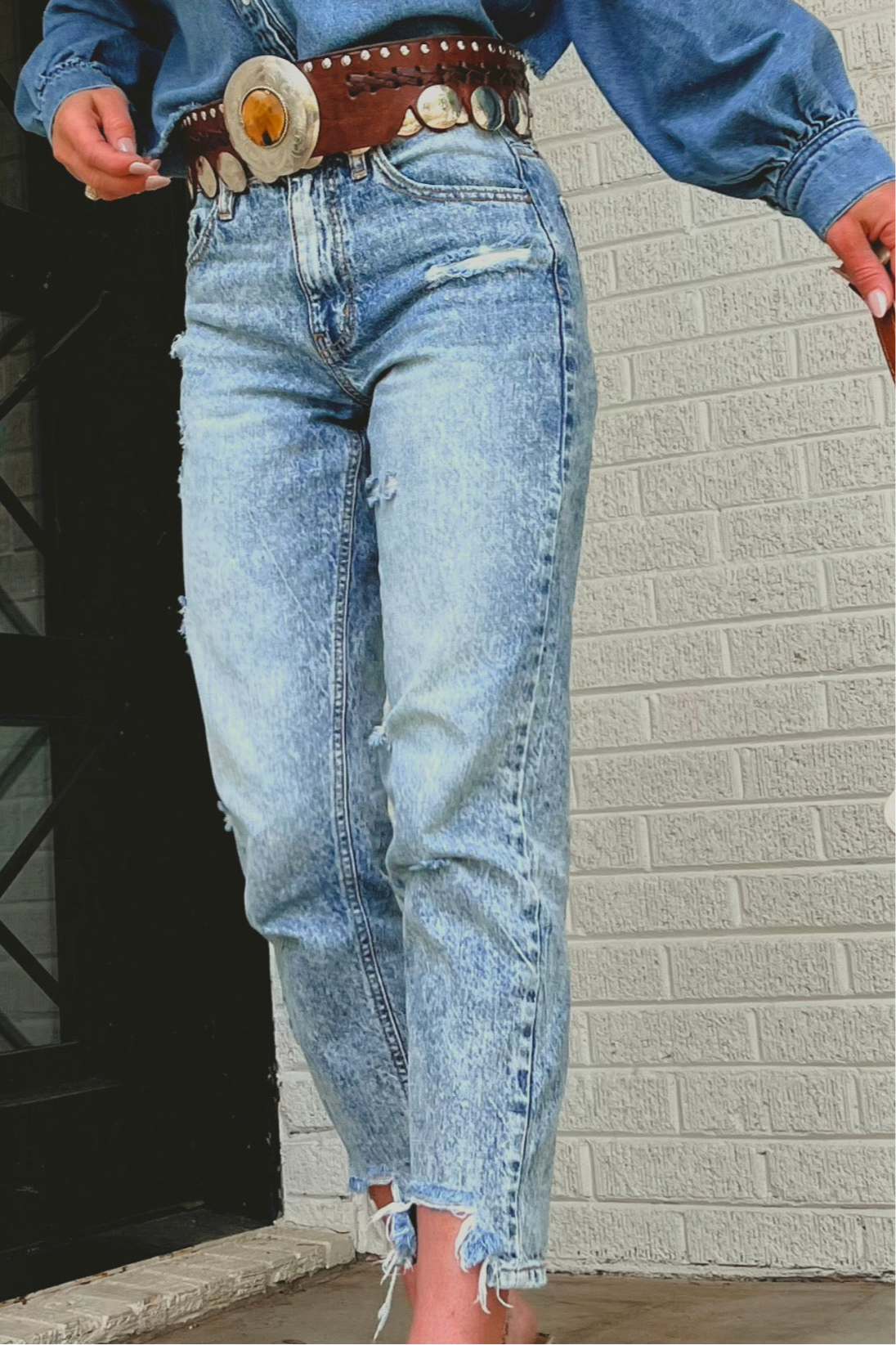 Ultra high rise, 90's style wide leg flare jean with distressing and all the fun details. For our girls that are fans of non-stretch denim, these will be a fav of yours.