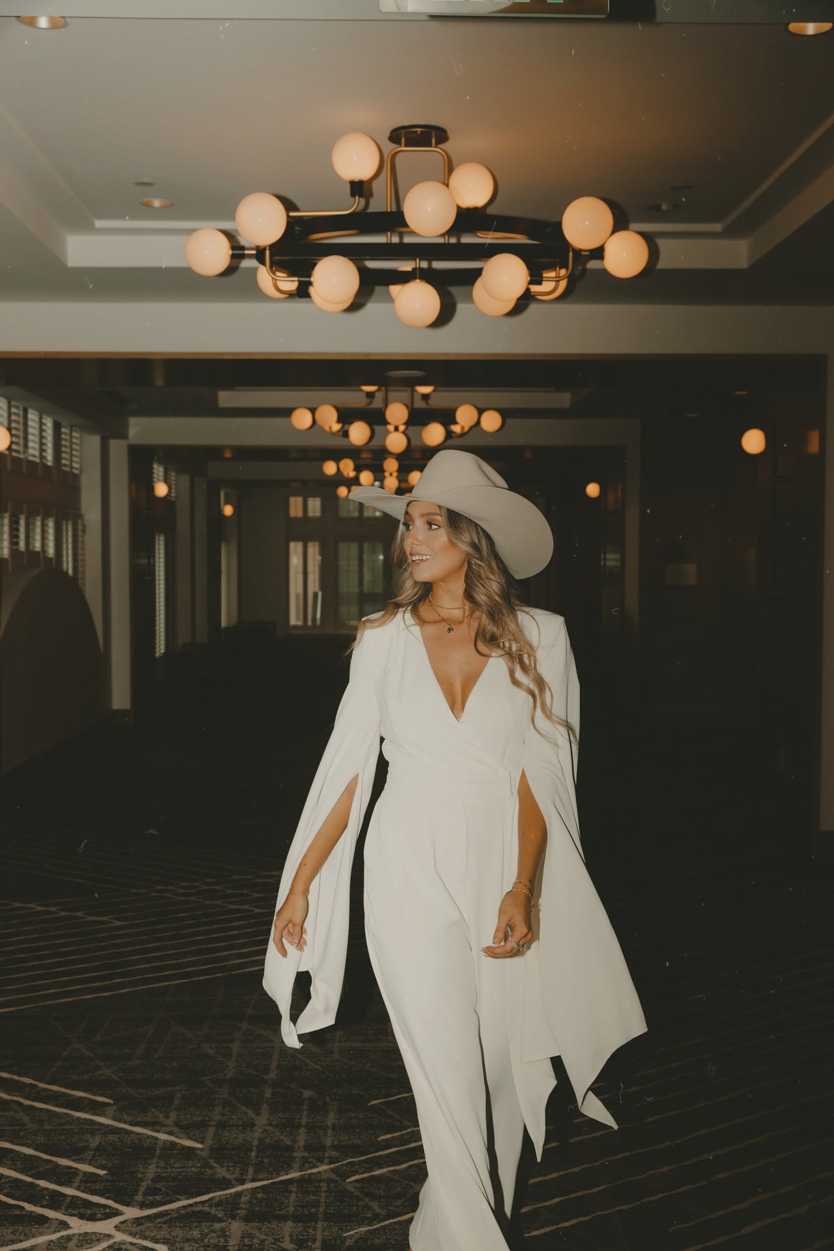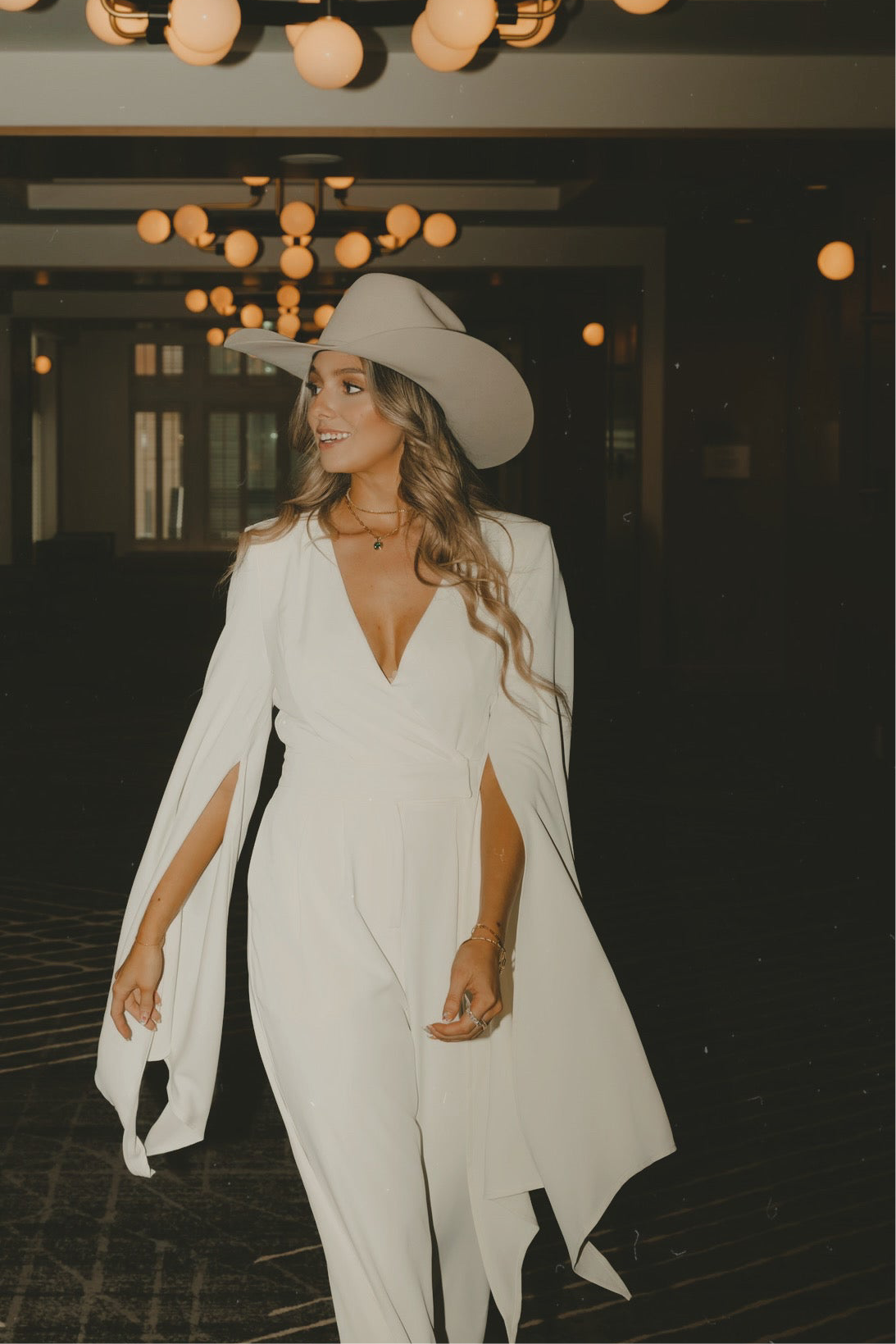 Turn heads in this pleated jumpsuit, designed with an elegant flyaway sleeve and a daring deep V-neckline. Flowing fabric meets a flattering silhouette for that perfect mix of polished and bold—made for NFR nights, dinner dates, or anywhere you want to bring a little Western luxe.