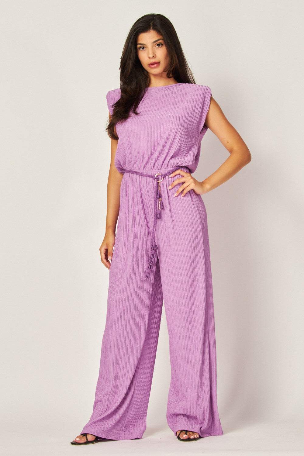 With it's allover crinkled plisse motif, this stunning jumpsuit makes quite the entrance. Features a tie belt waist, back keyhole detail, mock neckline, shoulder pads and wide-leg silhouette.
