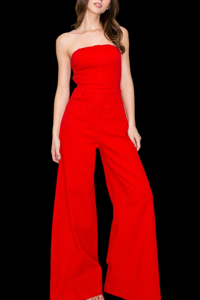 This strapless denim romper features a wide-leg fit, smocked back for stretch and comfort, and a hidden zipper detail. Structured yet easy—made for sunny days and standout moments.