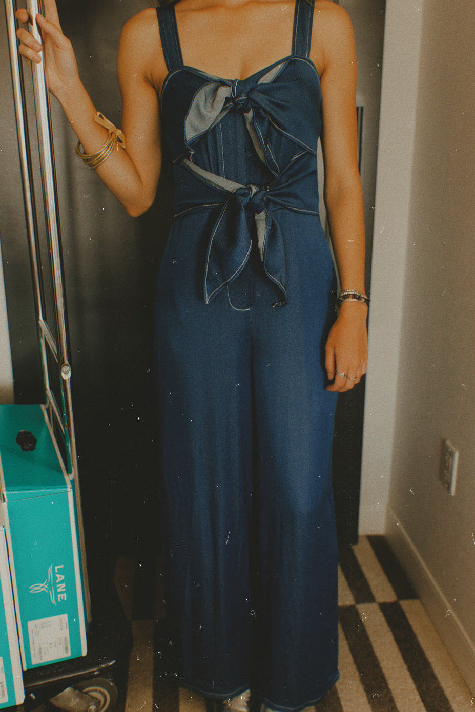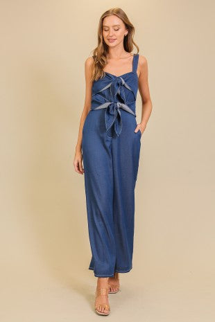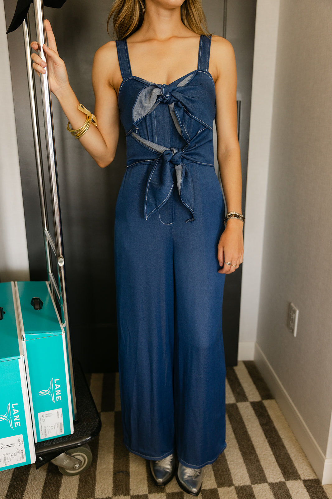 Make a statement with this stunning indigo wide-leg jumpsuit that perfectly blends modern sophistication with playful detail. Crafted in a rich-denim look fabric, this piece features three bold tie closures for a trendy twist and custom fit. The structured bodice with wide straps ensures support and style, while the full-length wide-leg silhouette gives a sleek and elongating effect. Whether you are dressing up for a brunch date or heading out for a chic night out on the town, this jumpsuit will turn heads.