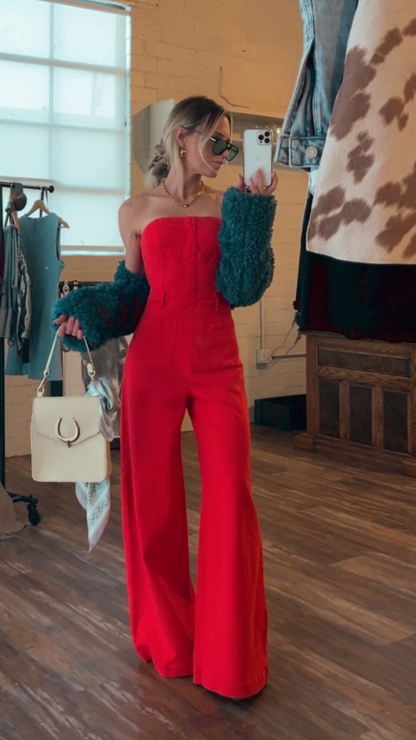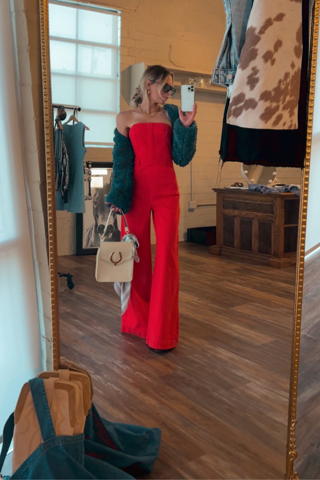 Make a bold statement in our Kelly Green Strapless Denim Jumpsuit. Featuring a flattering strapless fit, dramatic wide-leg sleeve detail, and vibrant denim fabric, this piece is made to stand out at NFR and beyond. Style it with boots and bold accessories for a head-turning Western look.