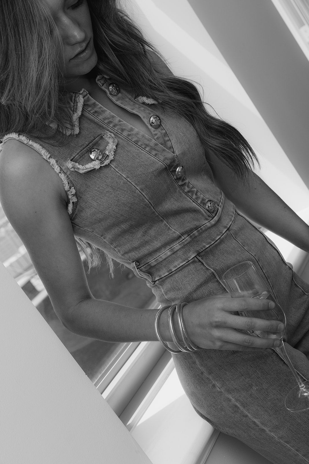 This washed denim romper features a sleeveless cut and button-up front for a clean, structured look that still feels laid-back. Perfect for welcome parties, bridal brunches, or styled up for a weekend getaway—it’s denim, but elevated