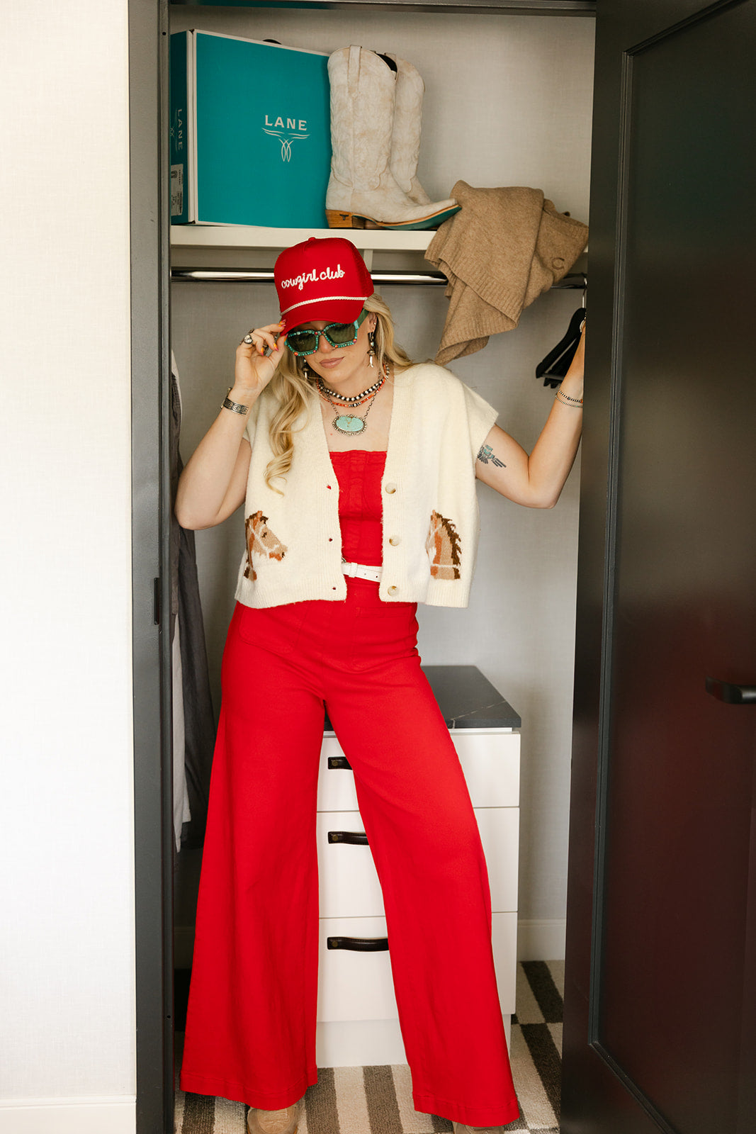 Turn up the heat in our Lane Denim Jumpsuit. Designed with a bold silhouette and dramatic wide-leg sleeve detail, this vibrant piece brings serious rodeo glam. Just add boots and a statement belt for an unforgettable NFR look.