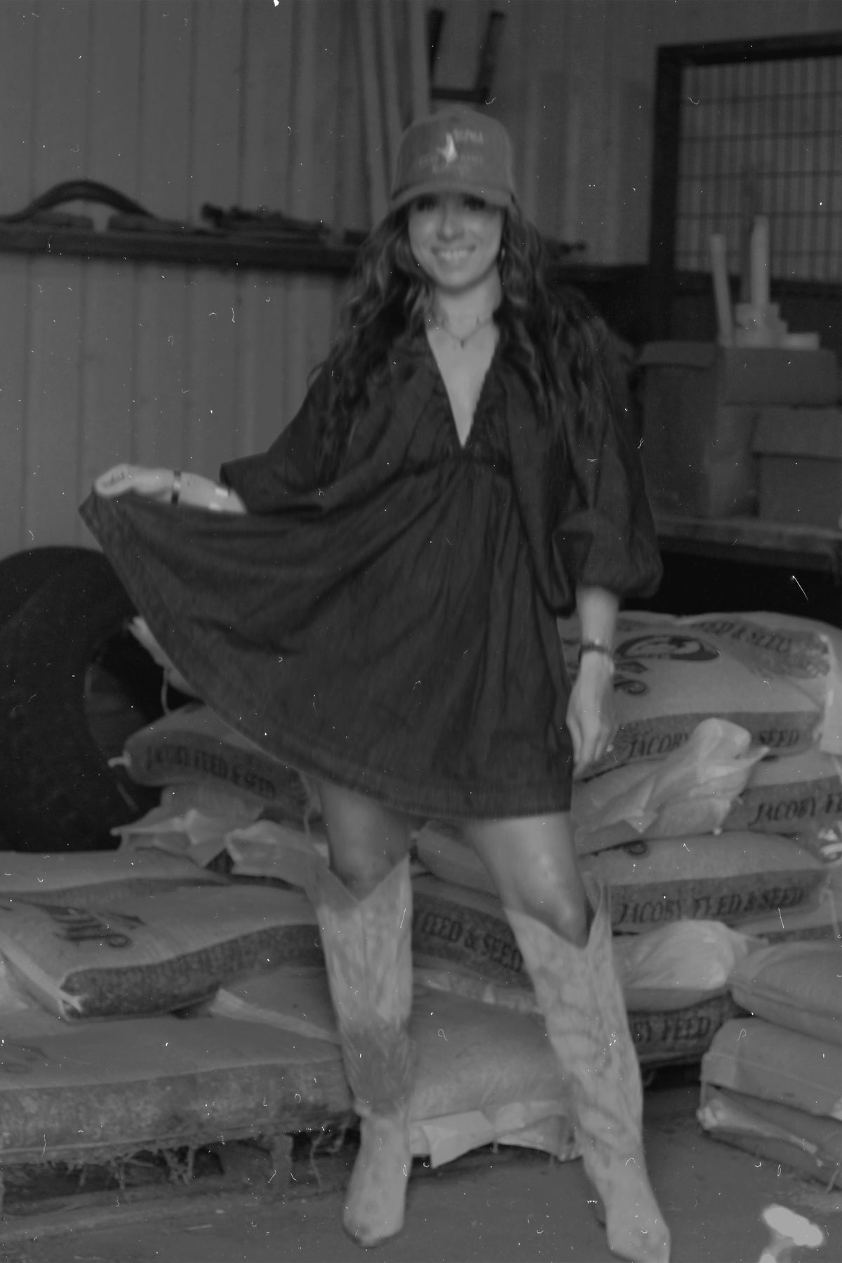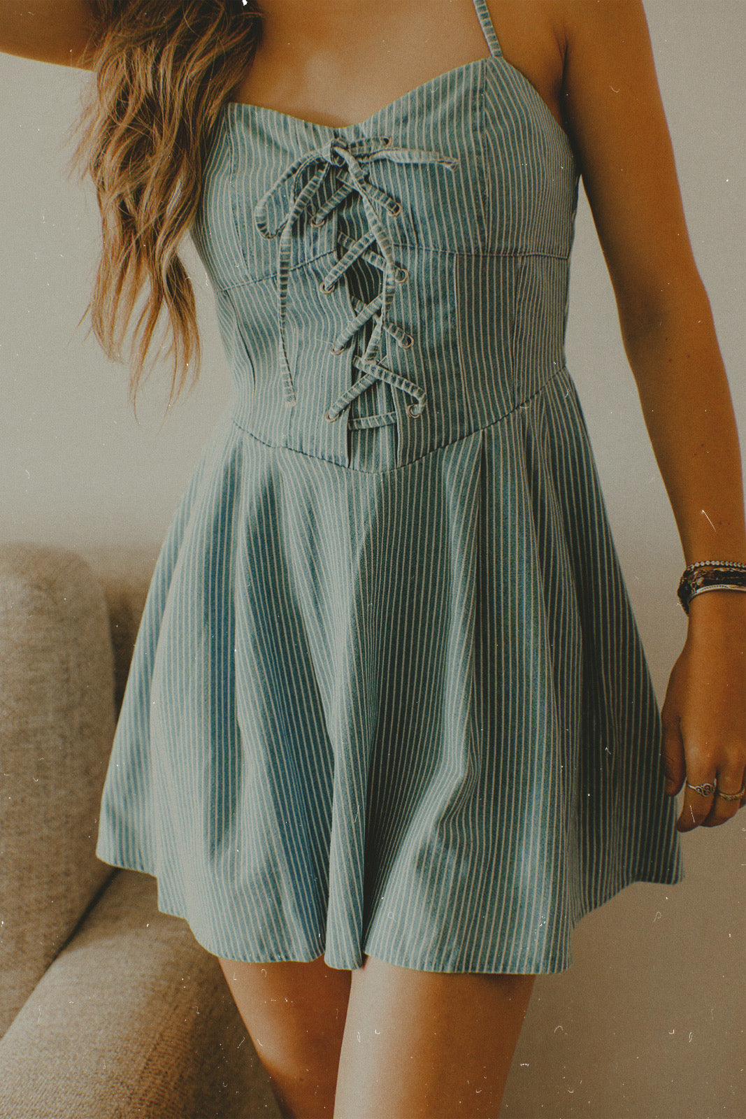 Ride into rodeo season in style with this striped denim corset mini dress. The structured bodice nods to classic Western grit, while the flared skirt brings a flirty, feminine edge. From the arena to afterparties, this dress is made to stand out under the NFR lights.