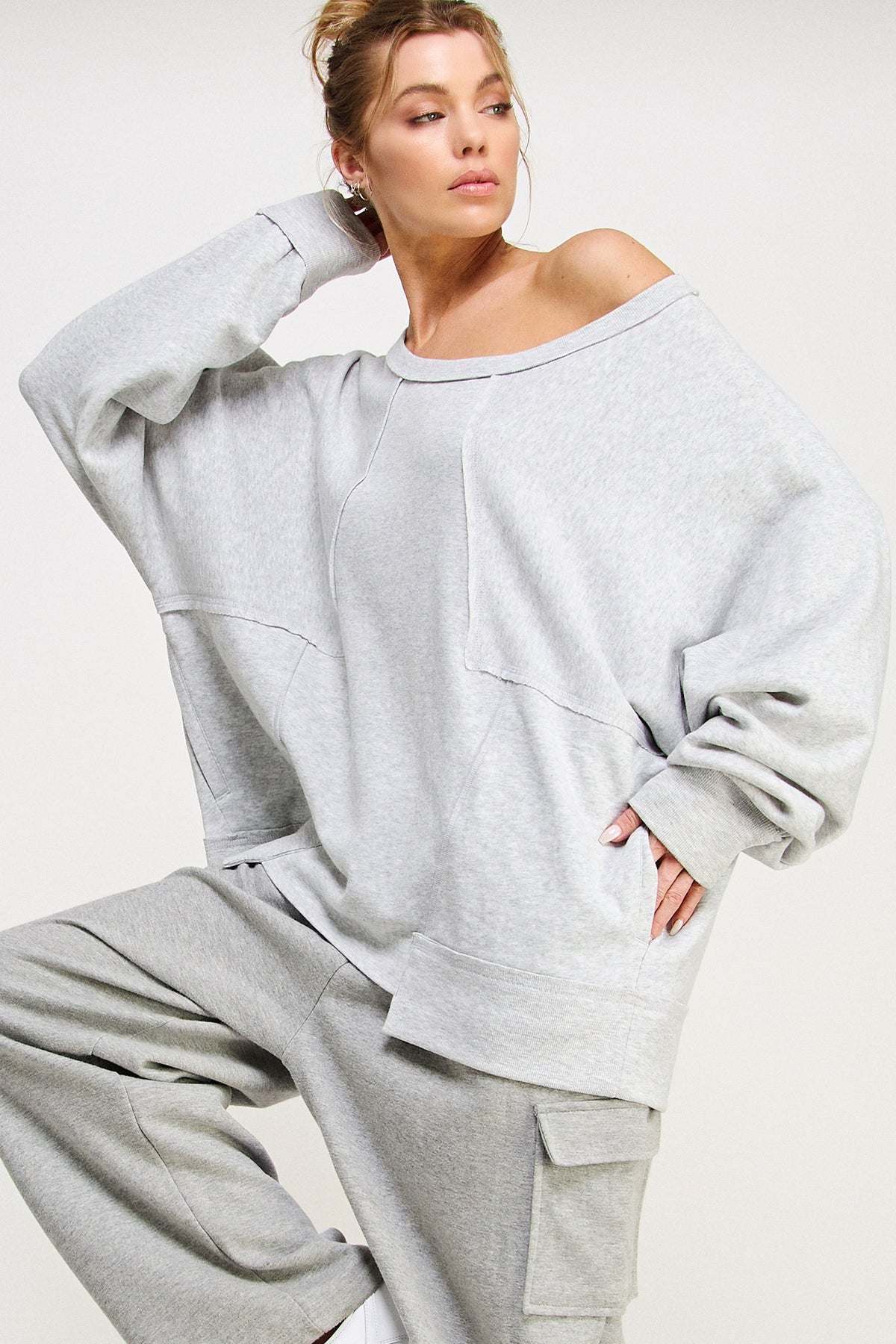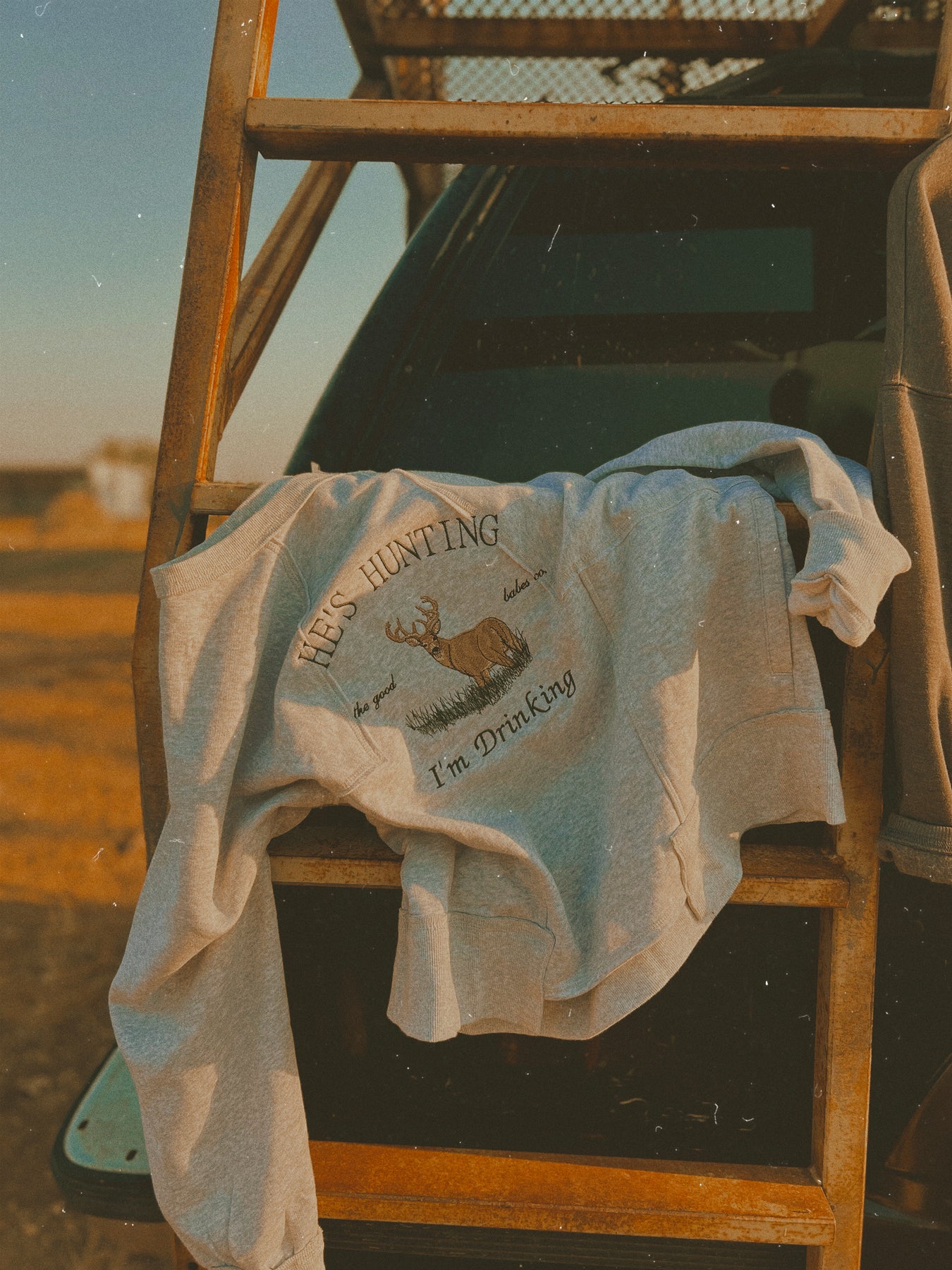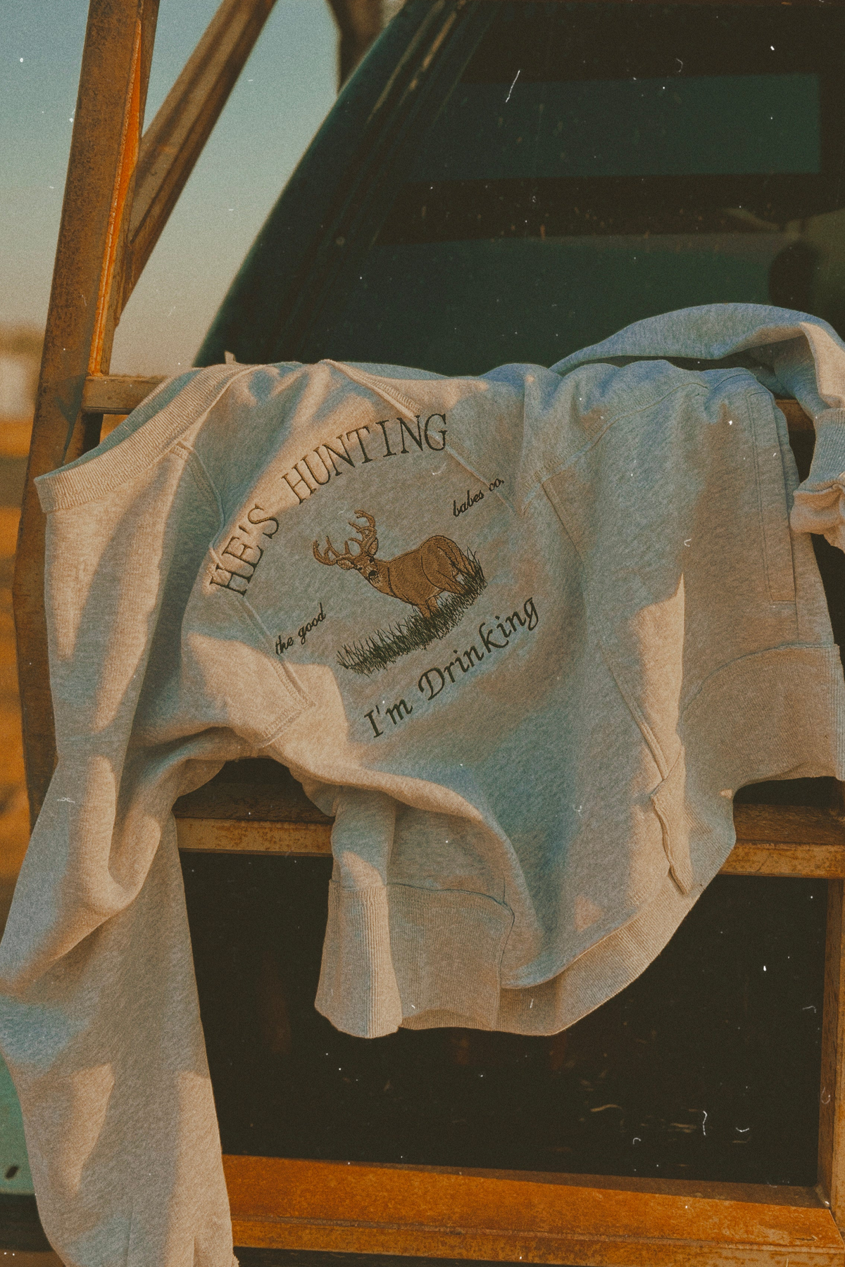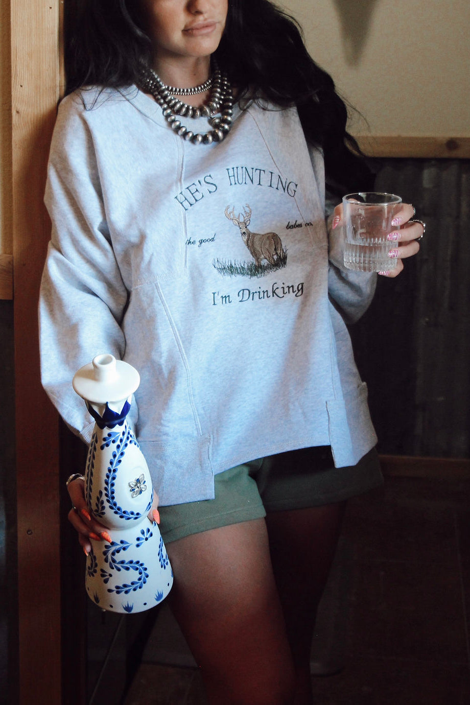 The definition of an effortless essential. This cool, classic heather grey long sleeve features an oversized, slouchy fit with raw exposed stitching for a lived-in look, complete with a buck embroidery and ‘He’s Hunting, I’m Drinking’.