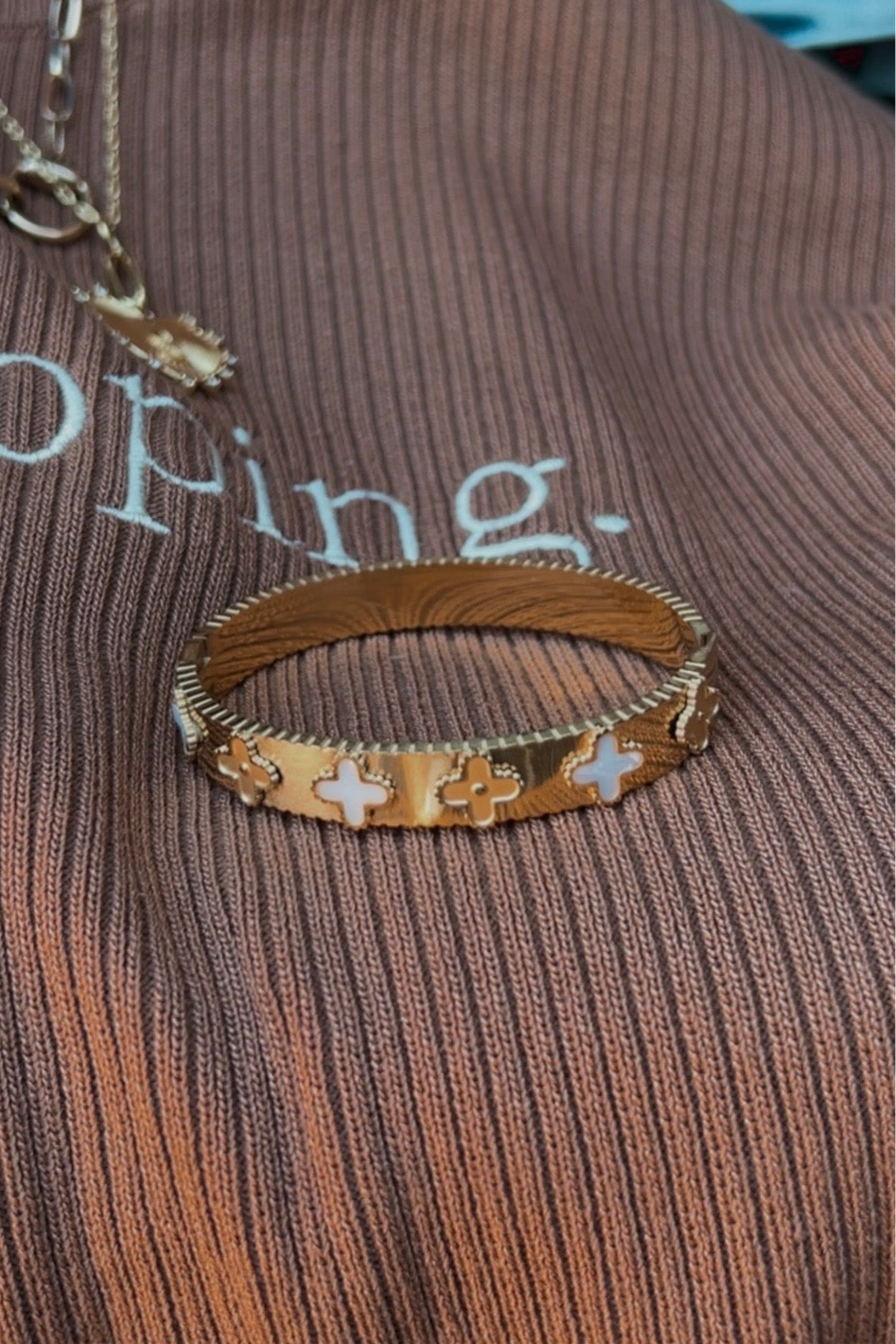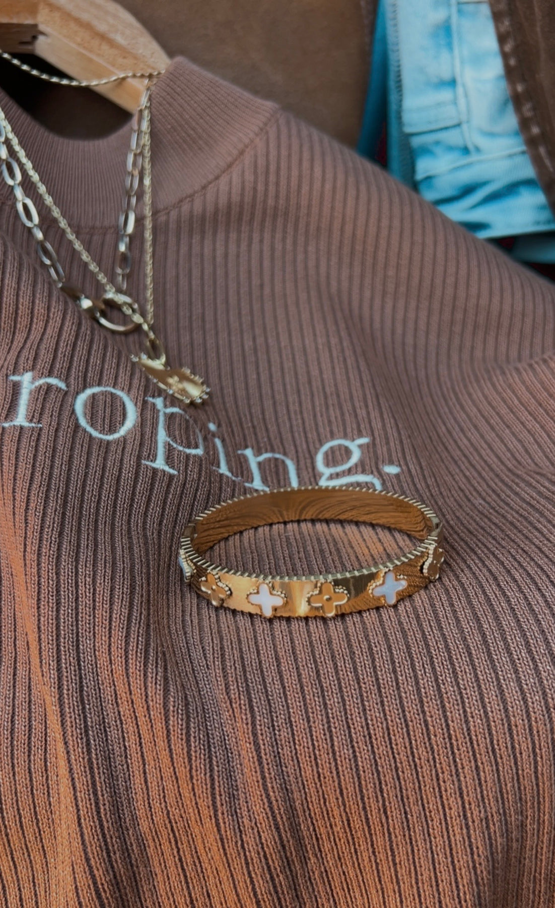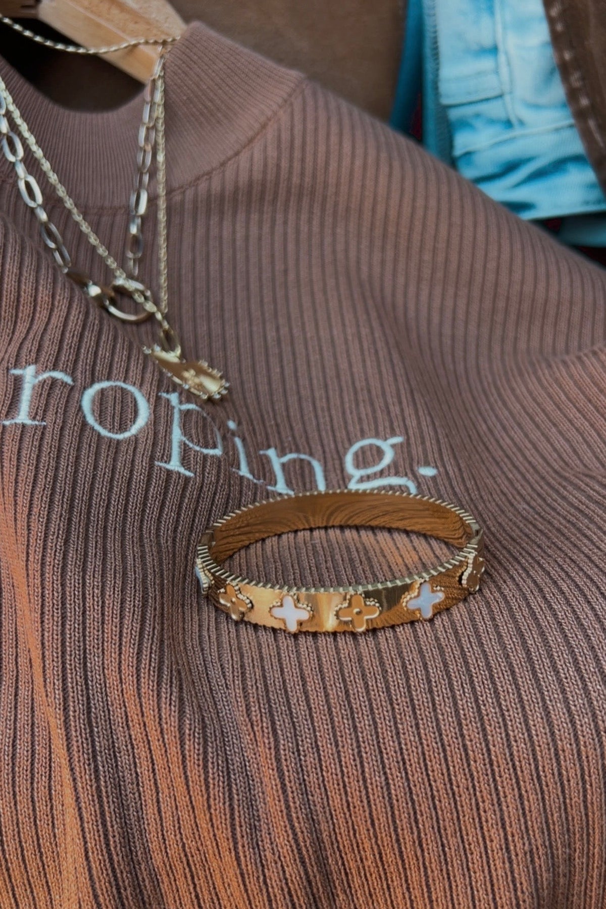 This 18K gold-dipped clover bangle features intricate accents and sparkling rhinestone stations, crafted with a sleek hinged design for effortless wear. Waterproof, tarnish-resistant, and fade-proof—perfect for stacking or making a statement solo. A standout piece with subtle Western spirit.