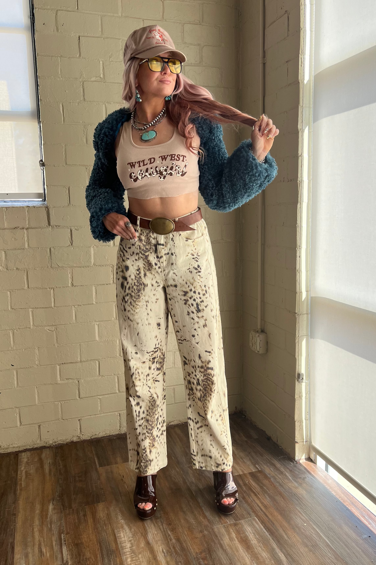 This cropped tank features a bold “Wild West Cowgirl” graphic on a soft, fitted silhouette. Perfect for pairing with high-rise denim or layering under your favorite jacket.