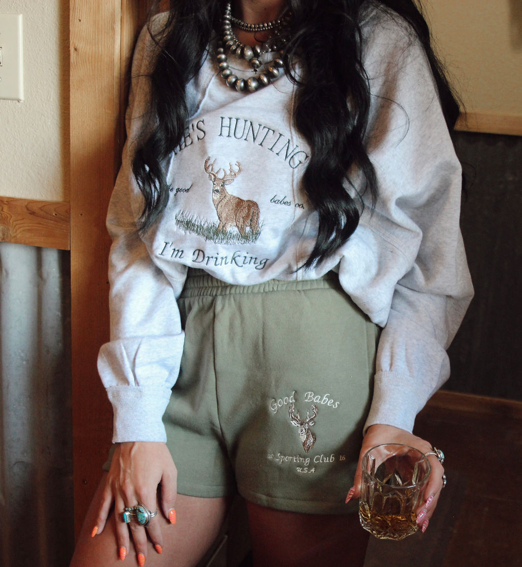 These heather grey fleece shorts feature an elastic waistband, side pockets, and "Good Babes Hunting Club" embroidery. Comfy enough for the couch, cute enough for the stand.