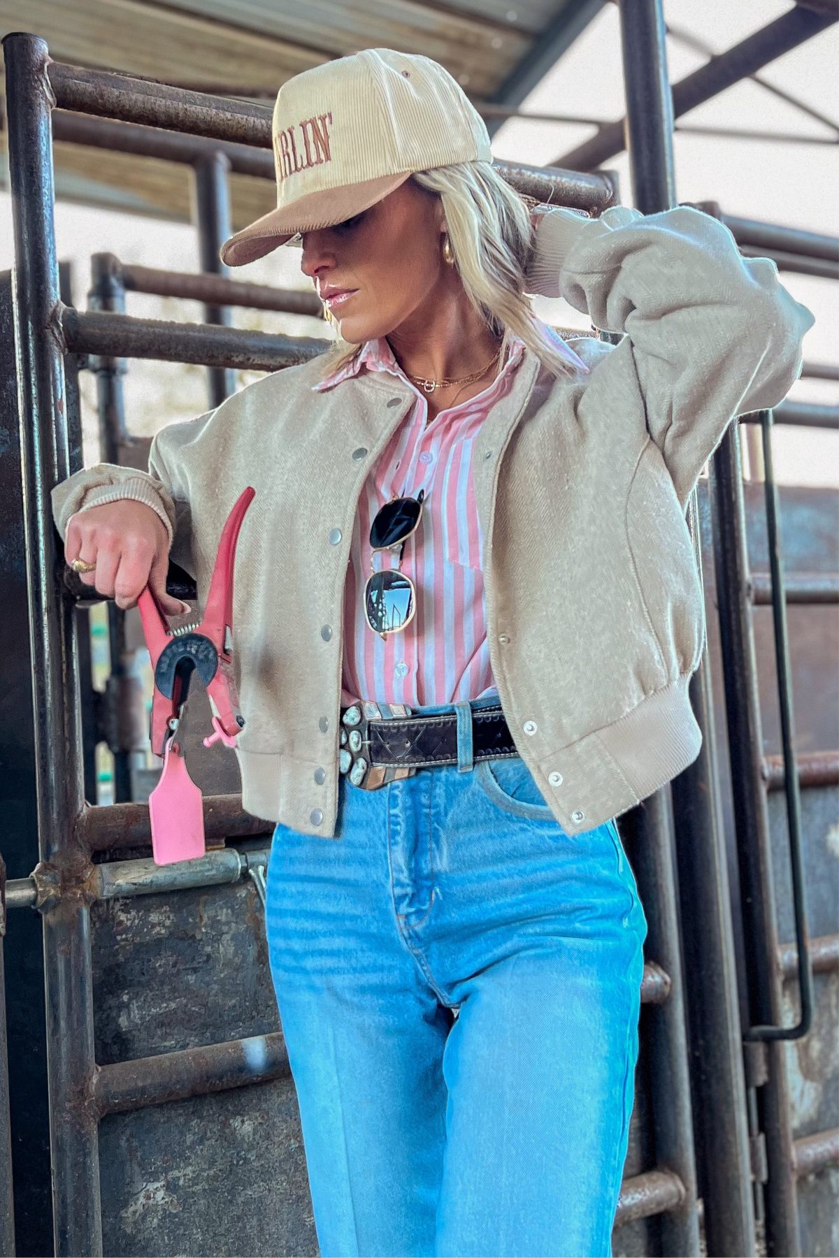 Classic western style meets a modern edge with this denim jacket. Featuring a semi-cropped fit, button closure, and faux leather contrast trim. It is trendy, chic, and will elevate any look - especially a Canadian tuxedo.