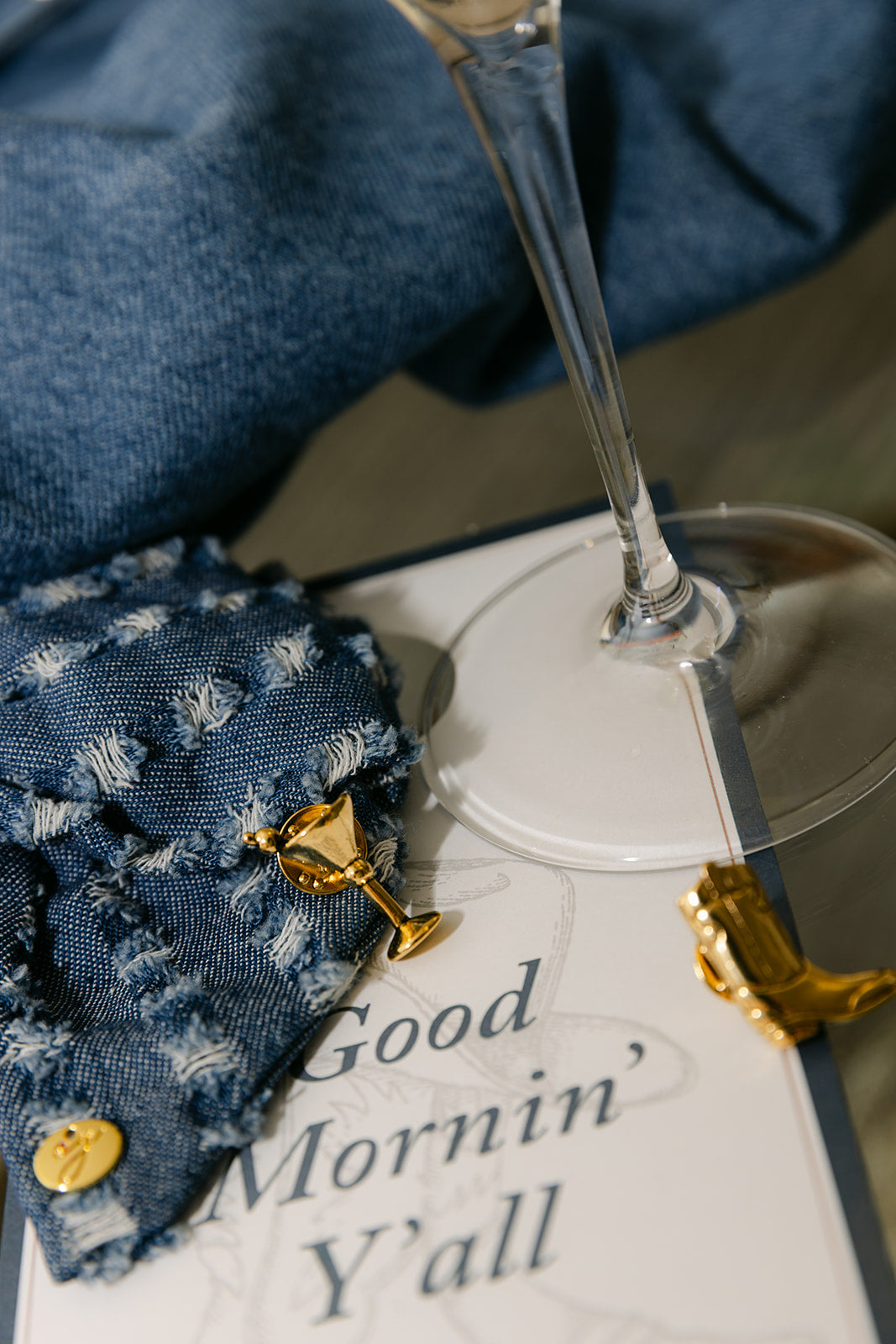 Whether you're adding it onto your denim jacket, bag, or trucker hat, this little gold martini pin is the perfect accessory.