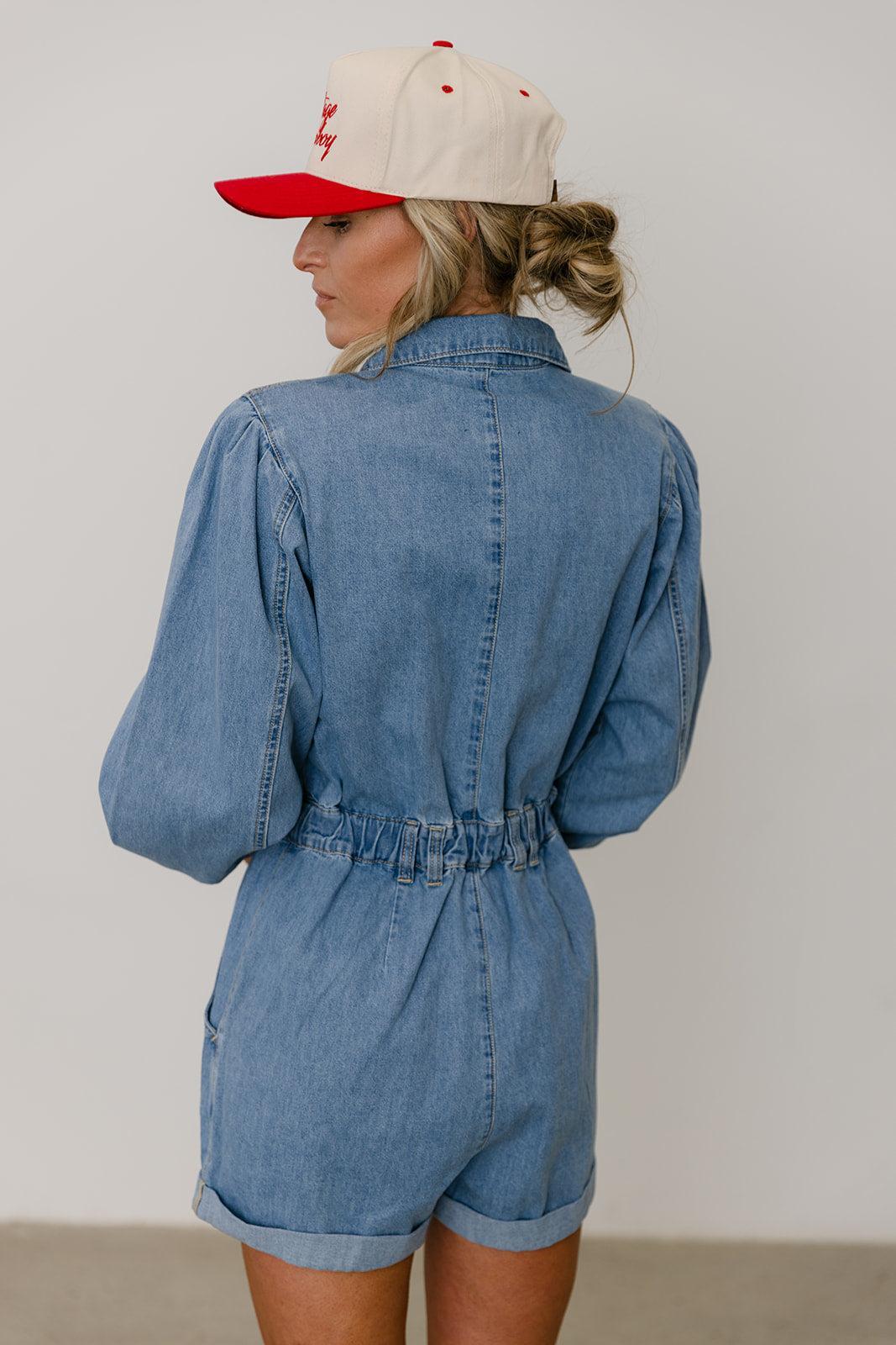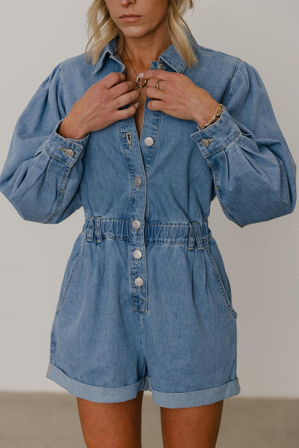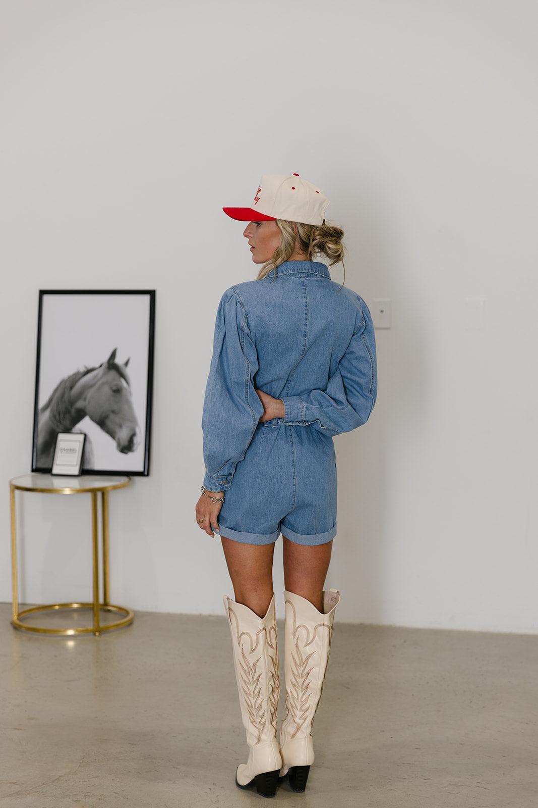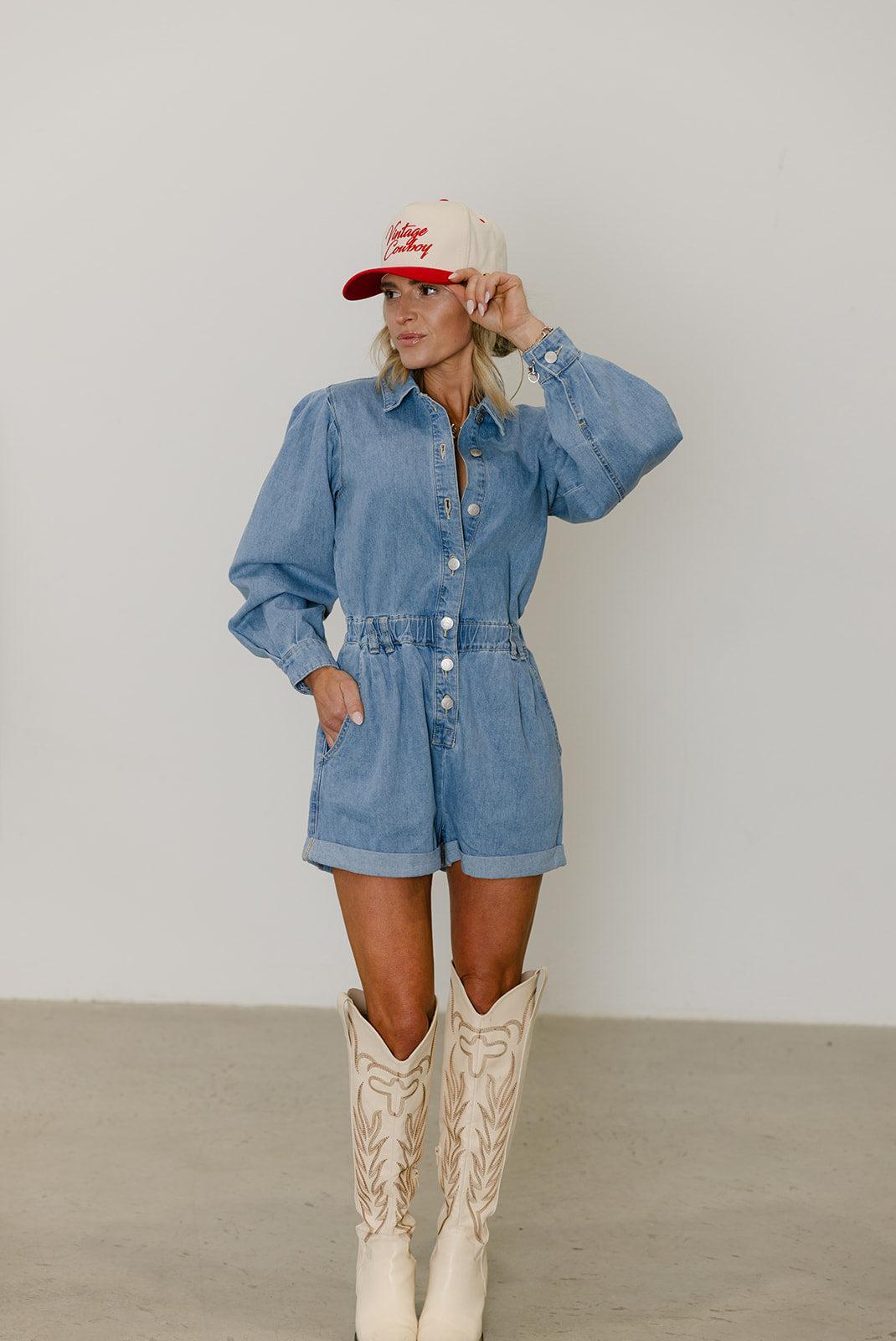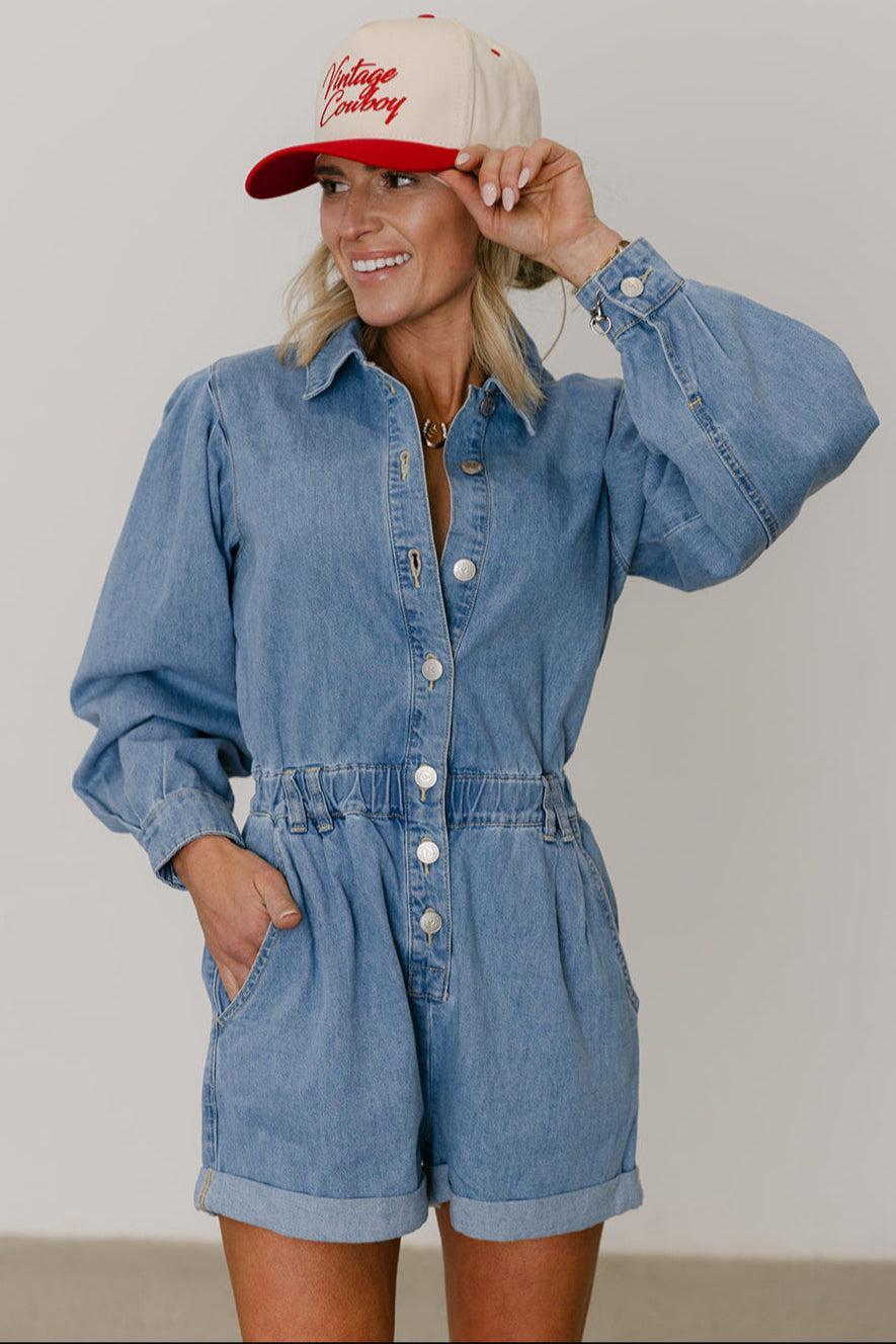 Whether you’re heading to a concert or the rodeo, this long-sleeved denim short romper is perfect for any event. Featuring a button closure, collar detail, belt loops, and front pockets.