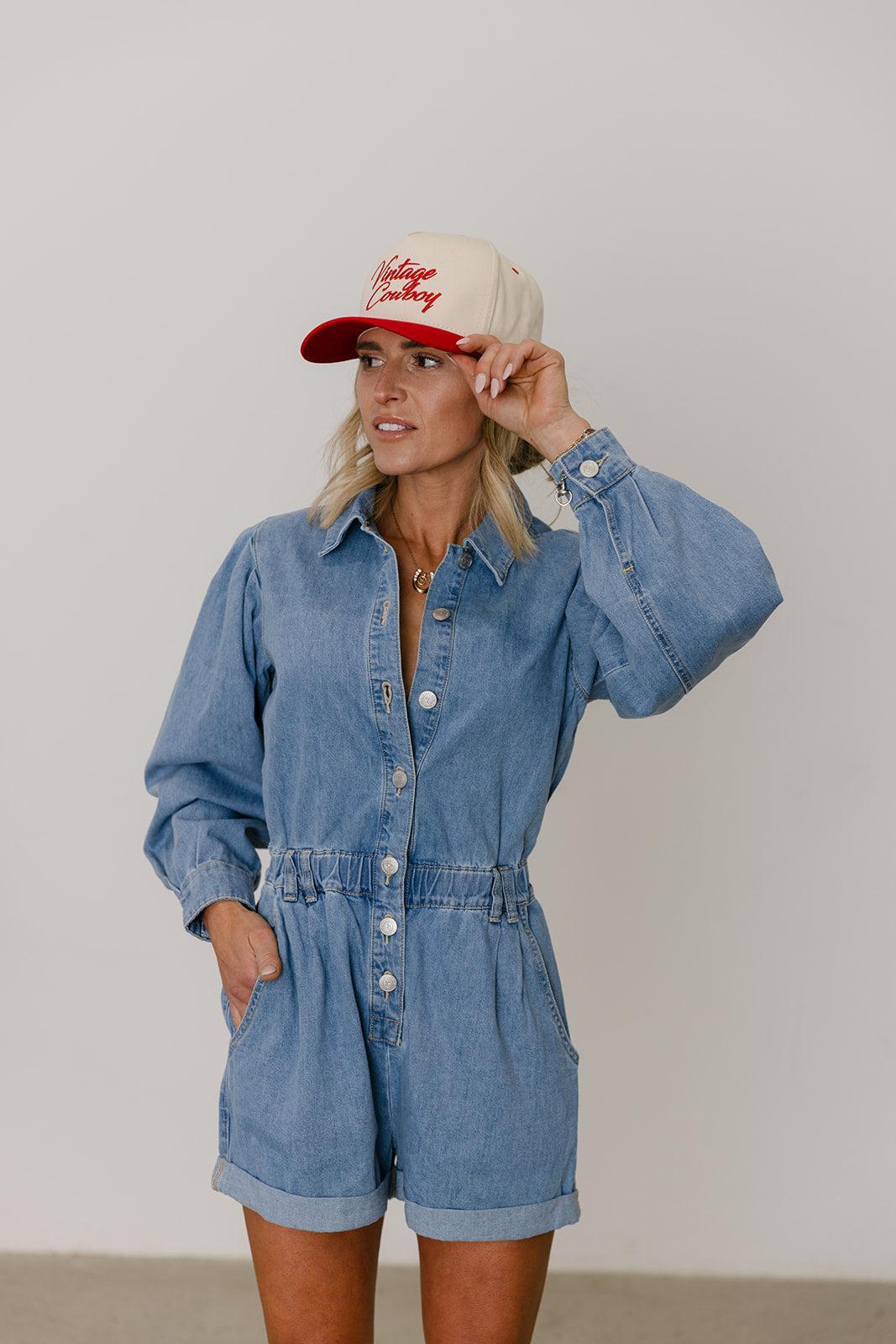 This washed denim romper features a sleeveless cut and button-up front for a clean, structured look that still feels laid-back. Perfect for welcome parties, bridal brunches, or styled up for a weekend getaway—it’s denim, but elevated