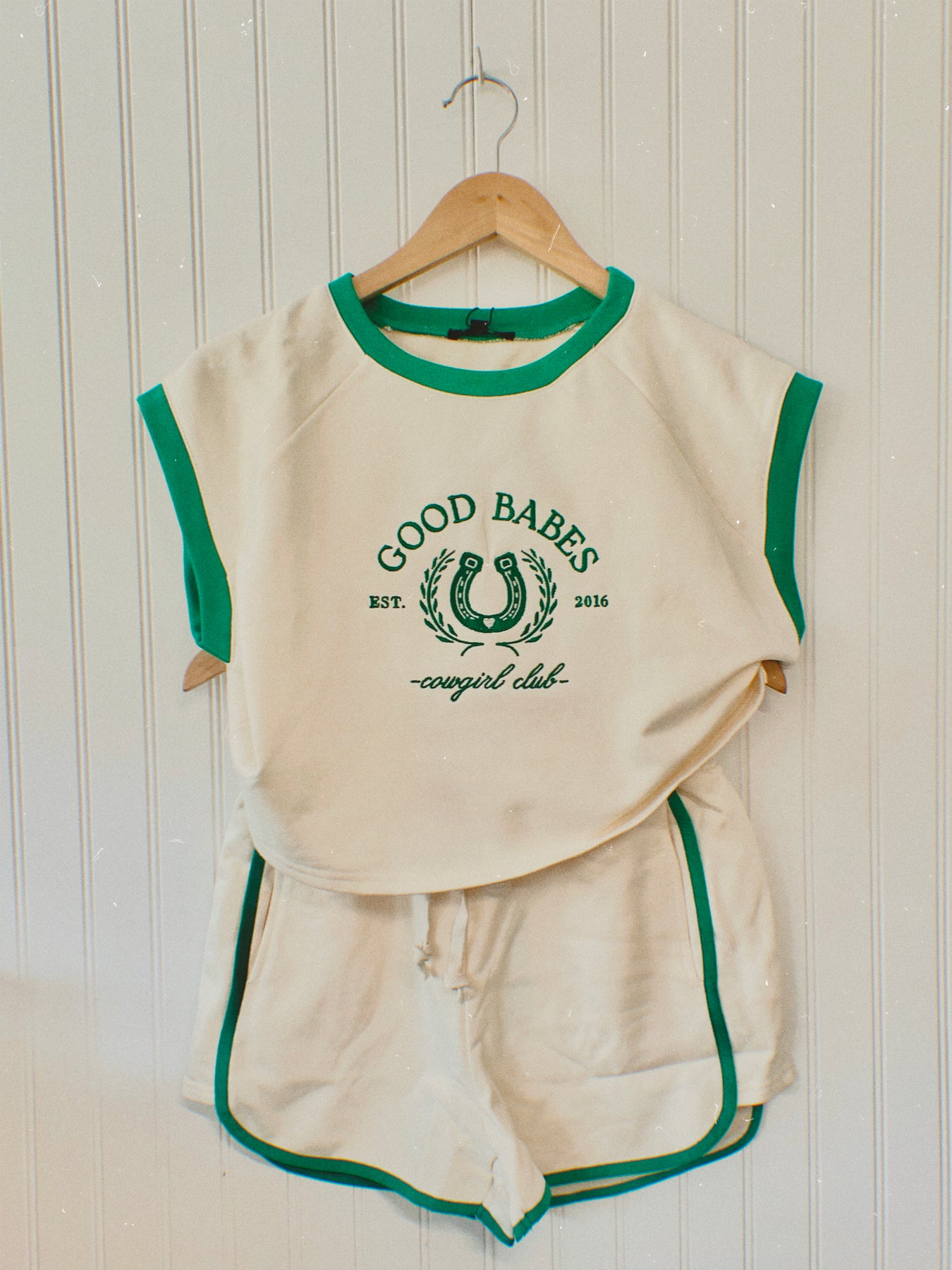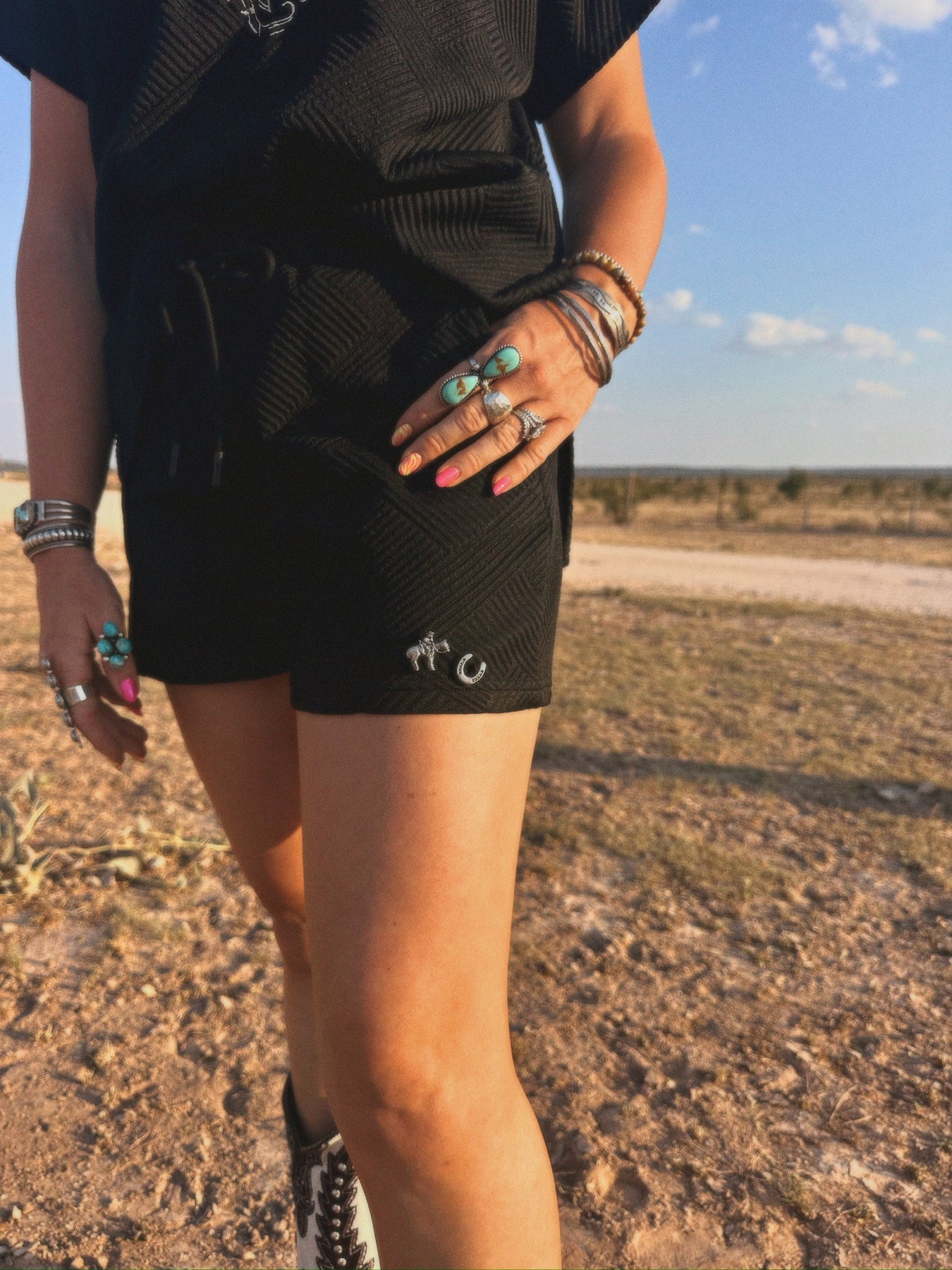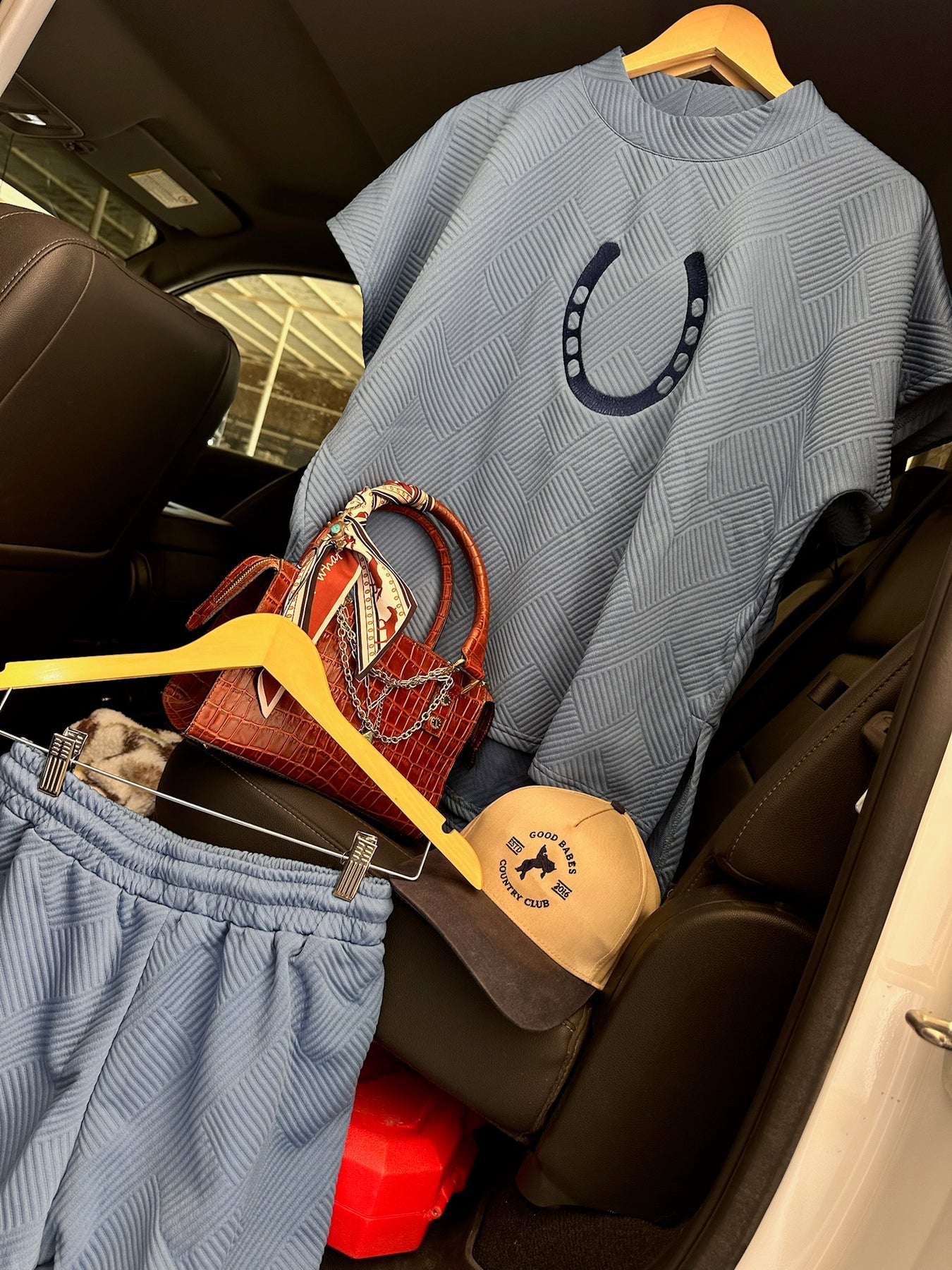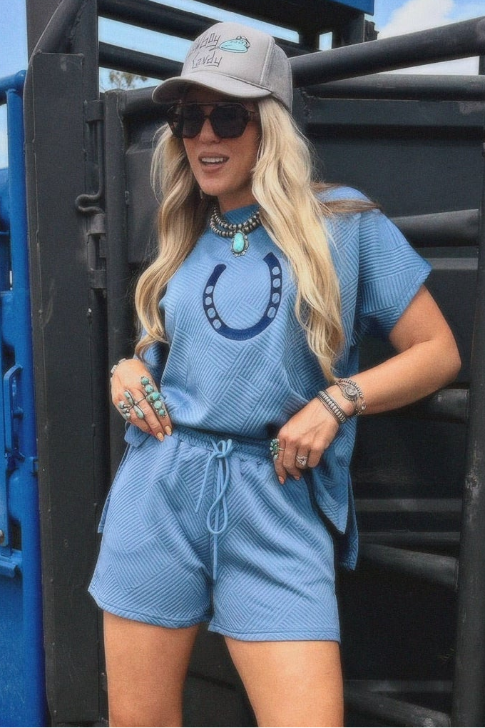 A lil’ easy, a lil’ lucky. This solid textured tee and shorts set brings laid-back vibes with a high neck, dolman sleeves, and a drawstring waist—finished with a subtle horseshoe embroidery that says just enough.