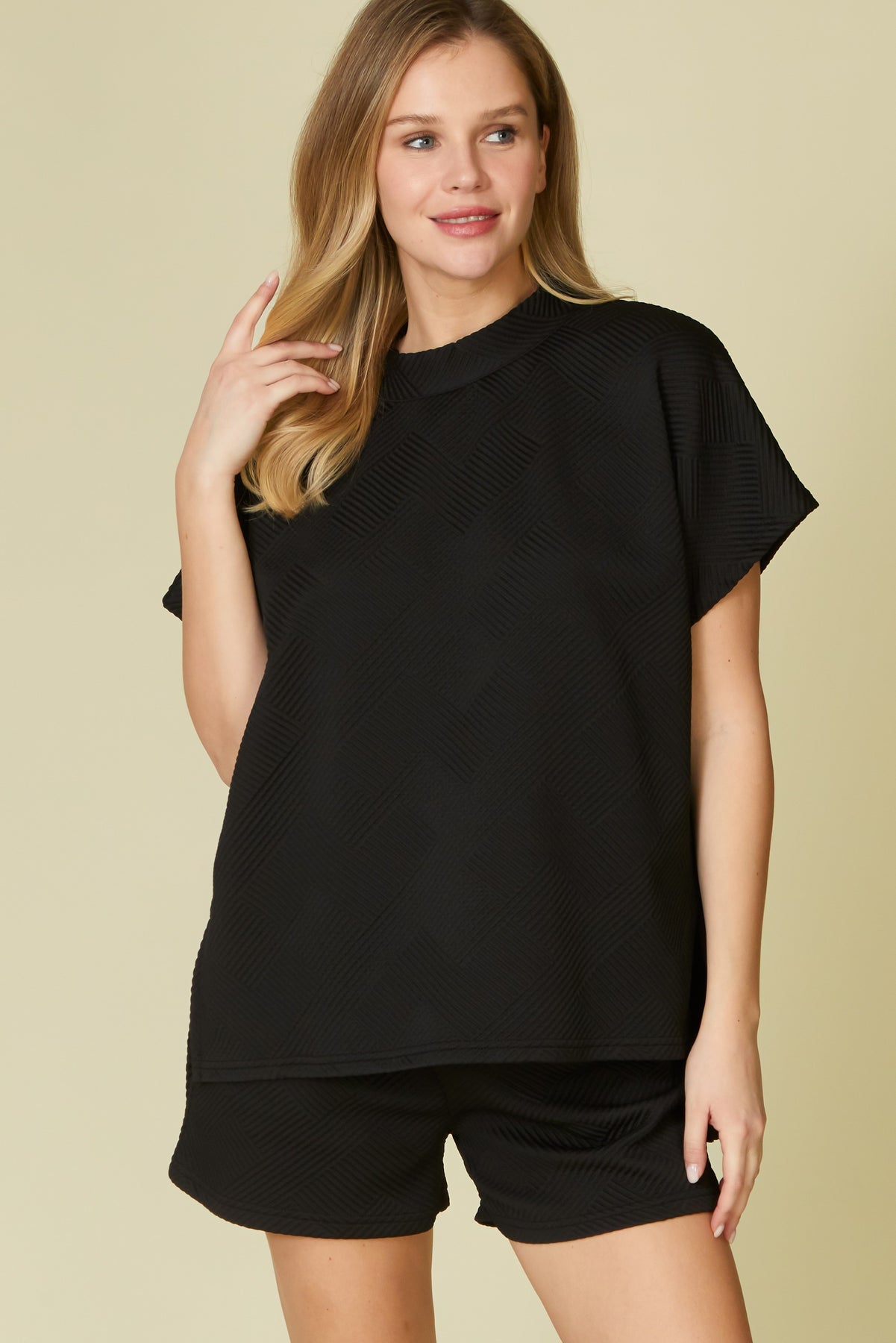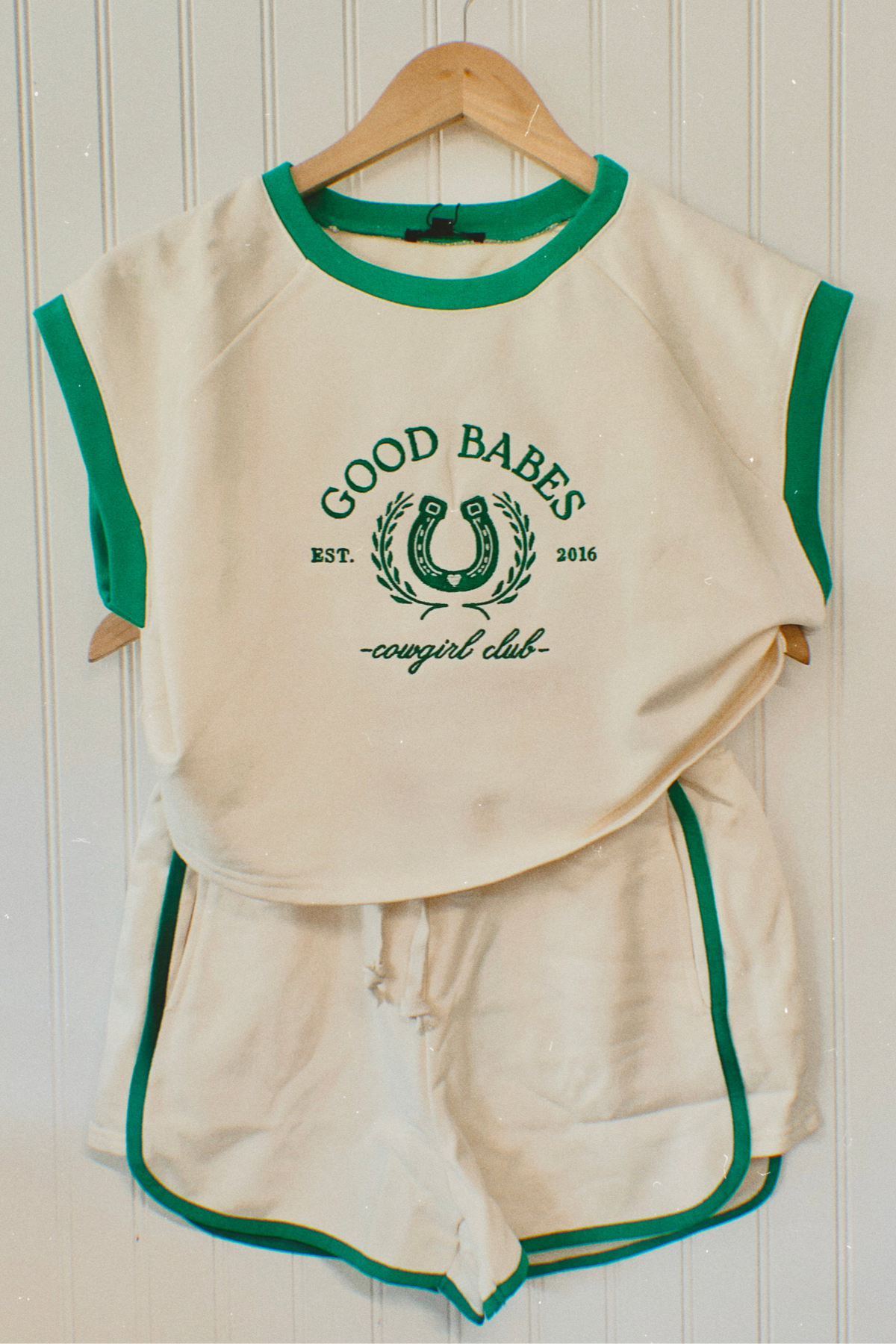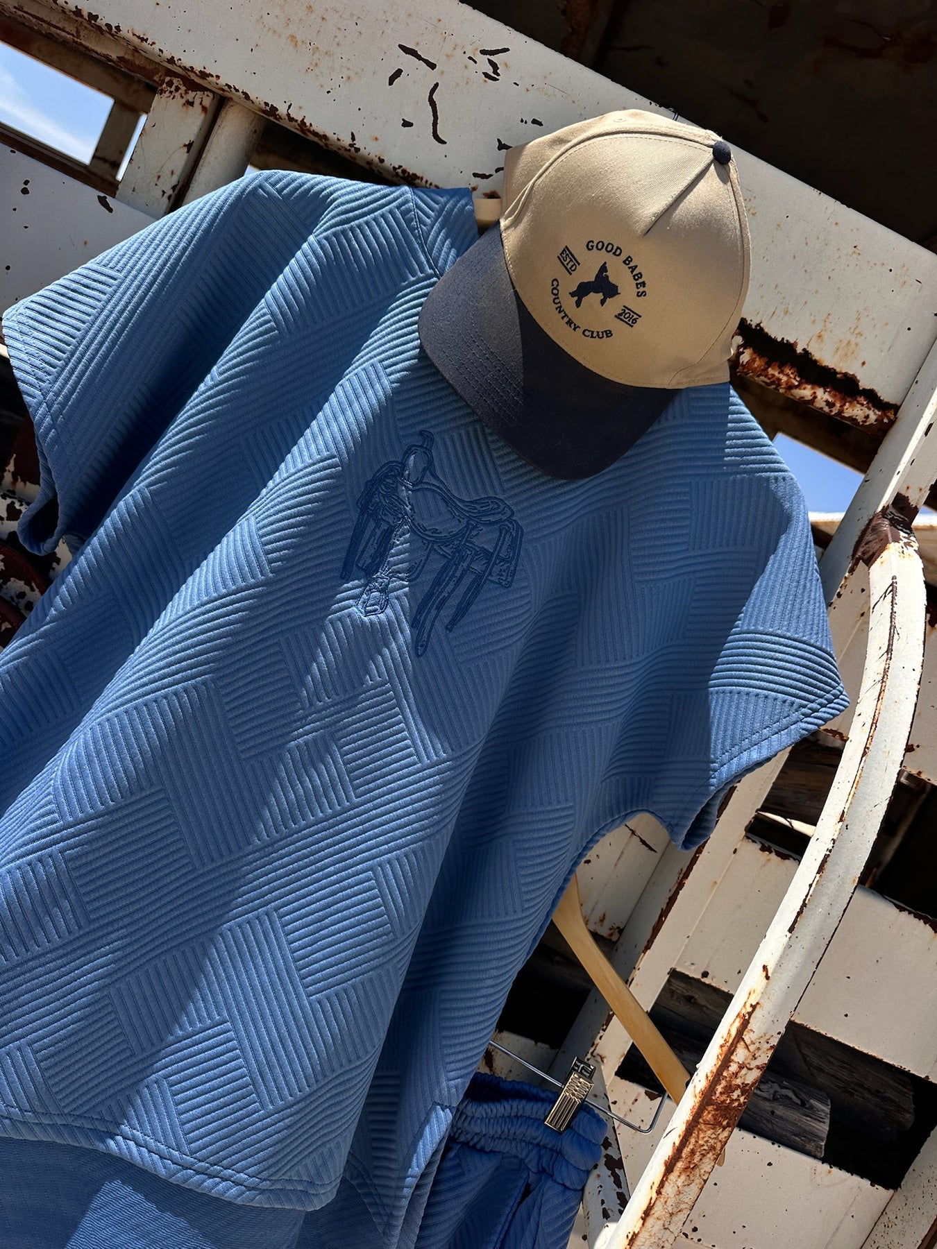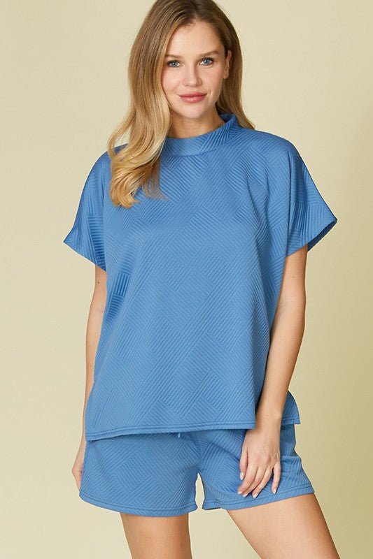 A lil’ easy, a lil’ lucky. This solid textured tee and shorts set brings laid-back vibes with a high neck, dolman sleeves, and a drawstring waist—finished with a subtle horseshoe embroidery that says just enough.