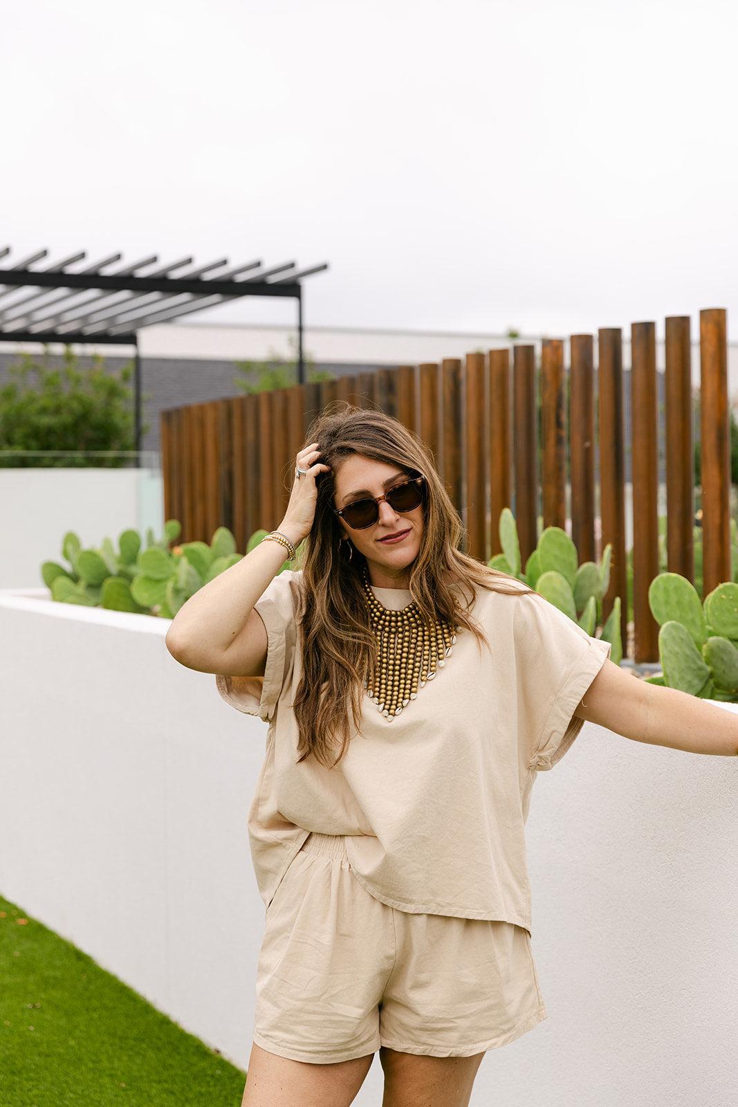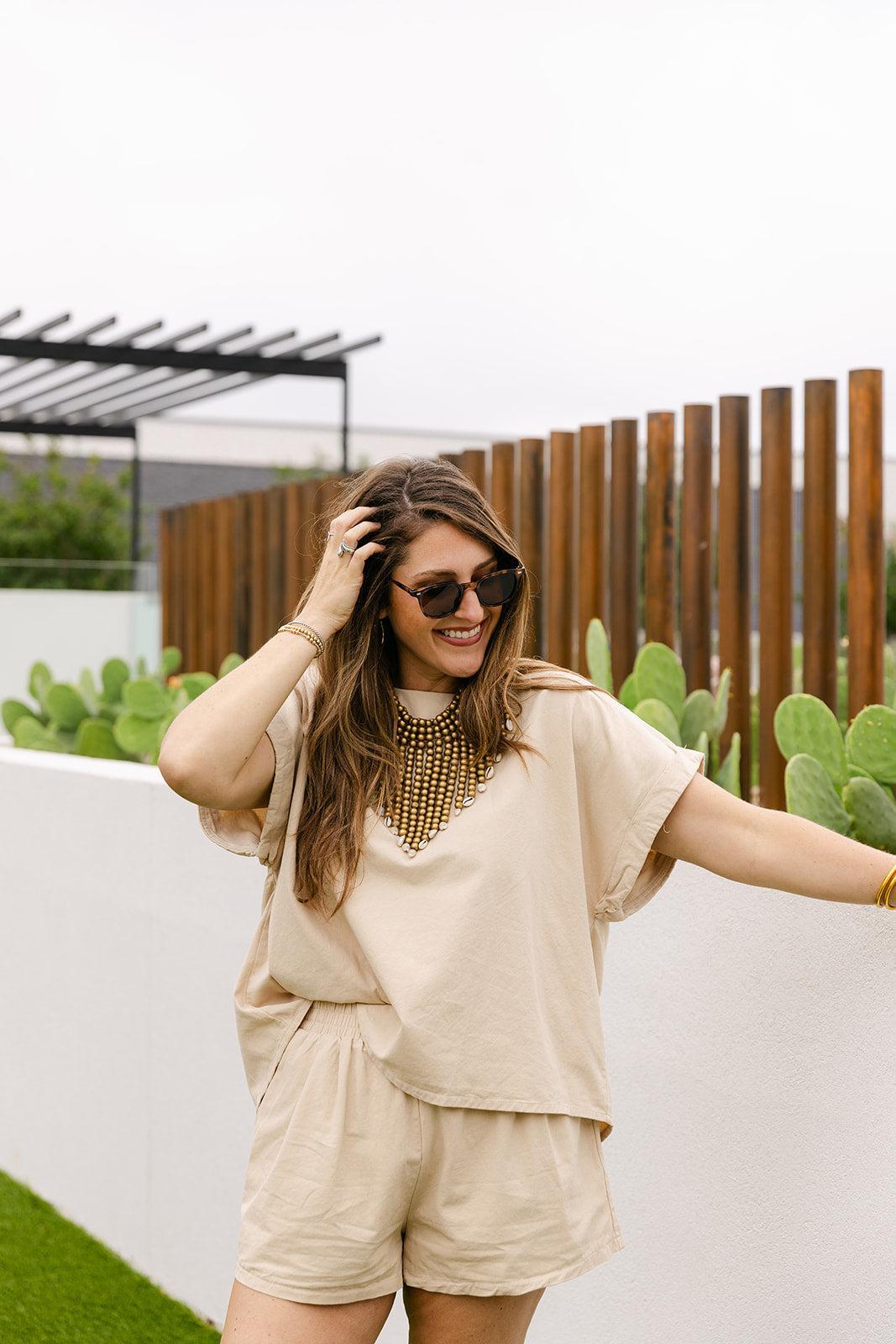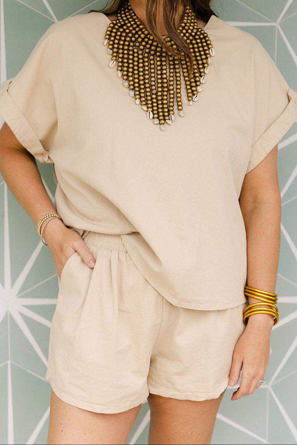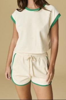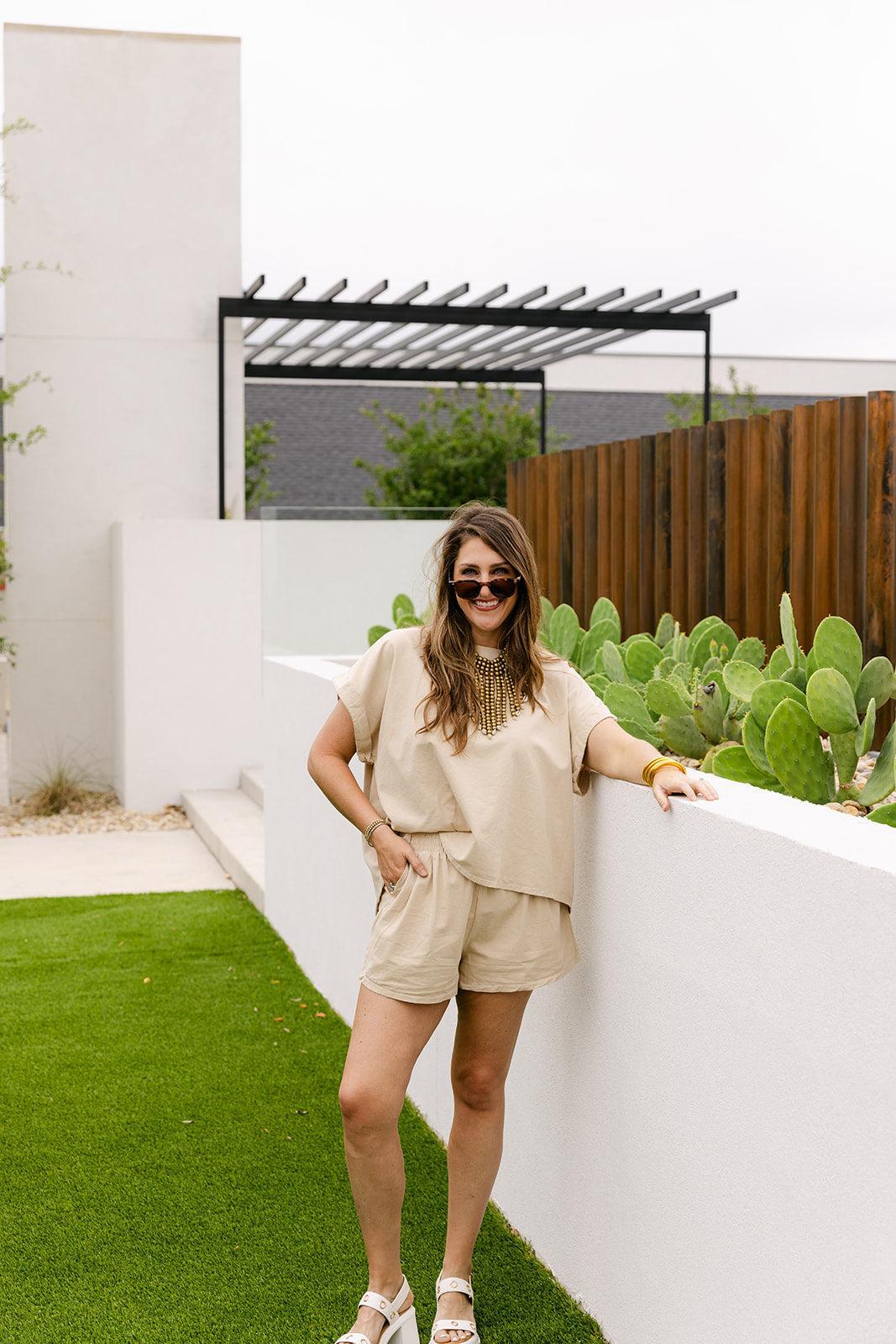 A lil’ easy, a lil’ lucky. This solid textured tee and shorts set brings laid-back vibes with a high neck, dolman sleeves, and a drawstring waist—finished with a subtle horseshoe embroidery that says just enough.