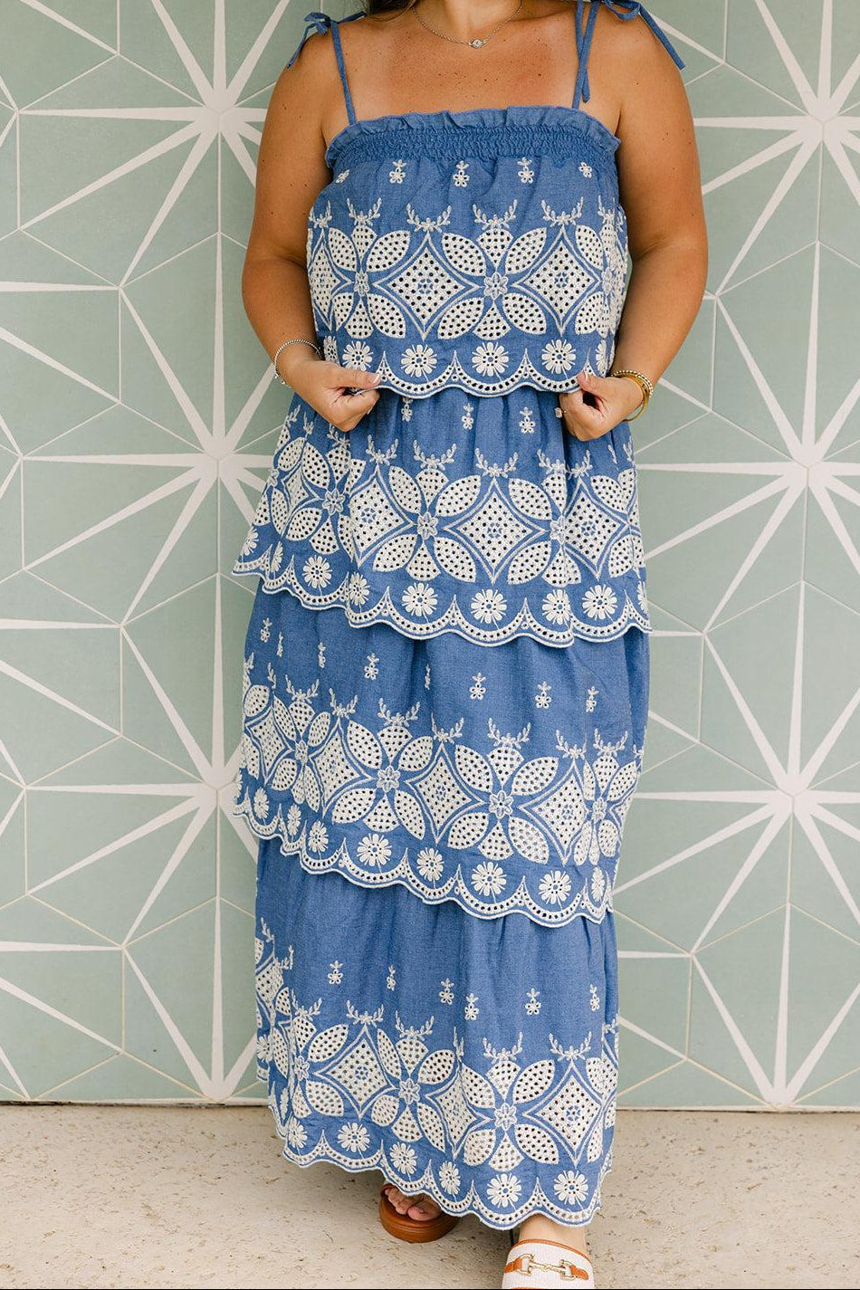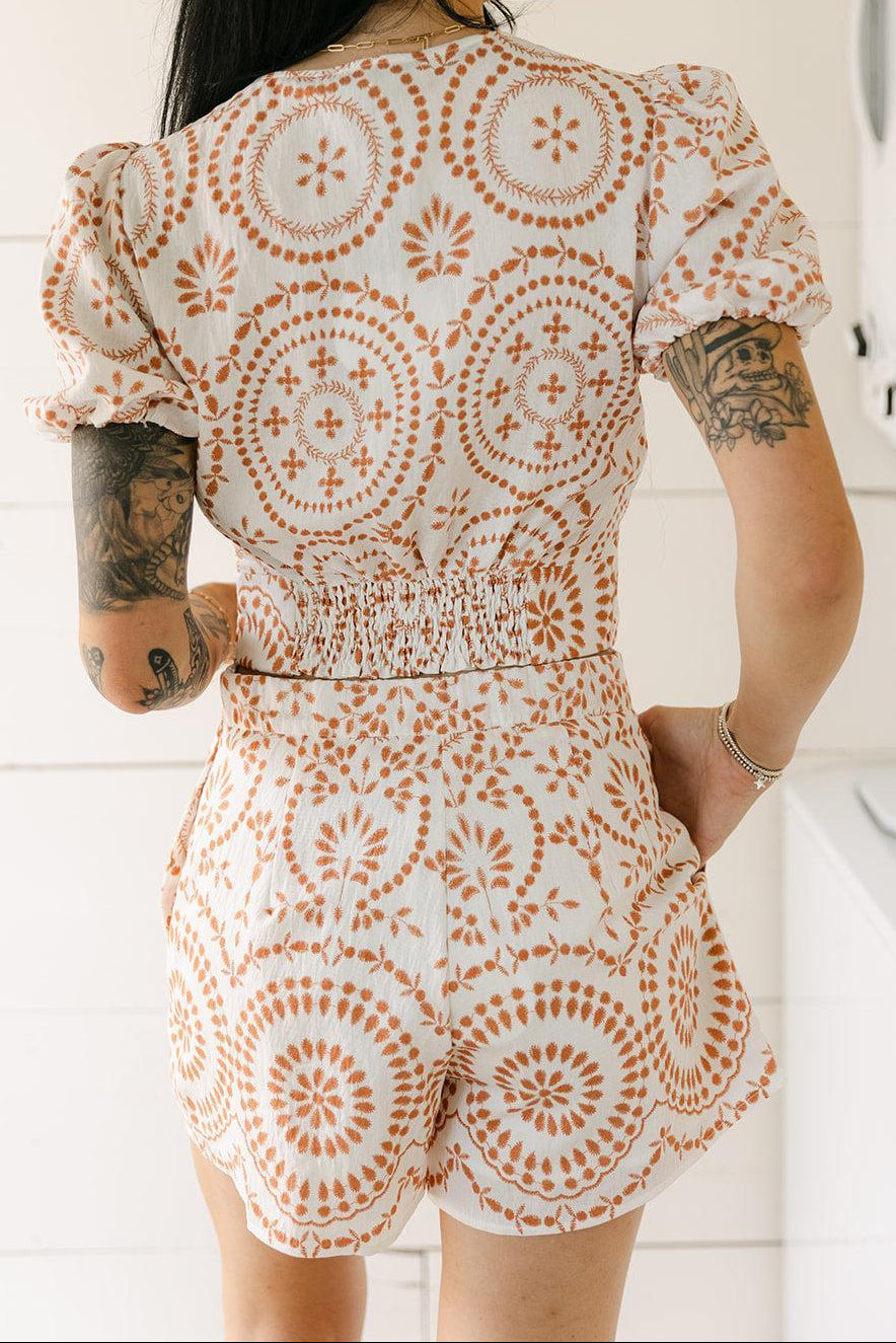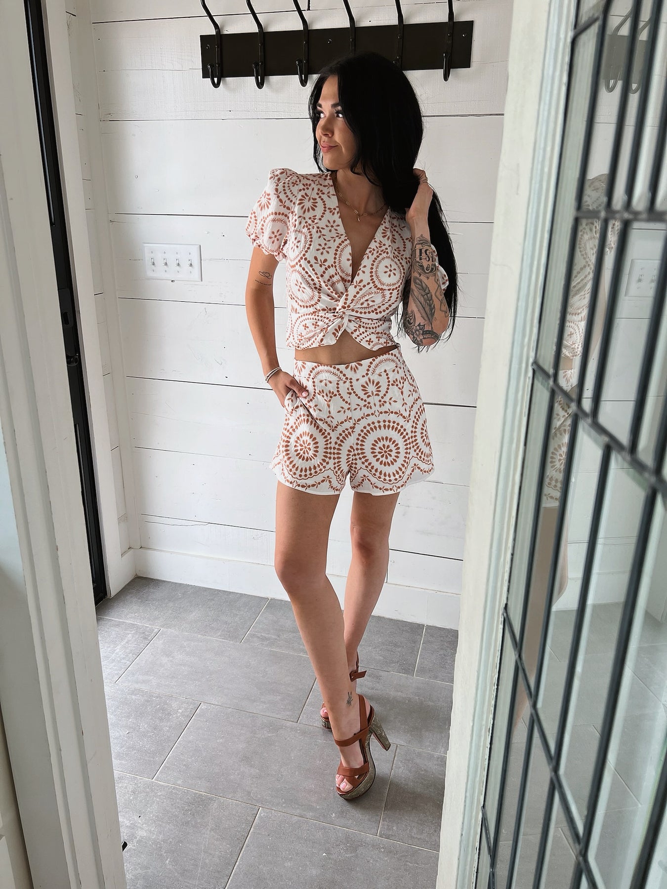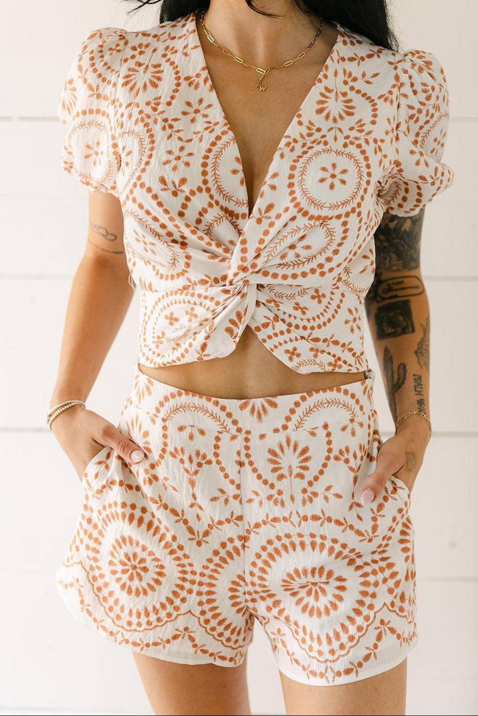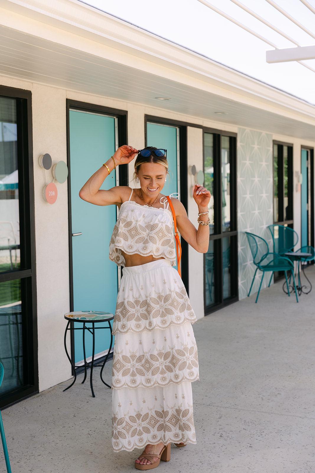This matching set features a waist-length top with a square neckline and scalloped hem, paired with a coordinating high-rise skirt in embroidered eyelet fabric. Lightweight, breezy, and effortlessly feminine.