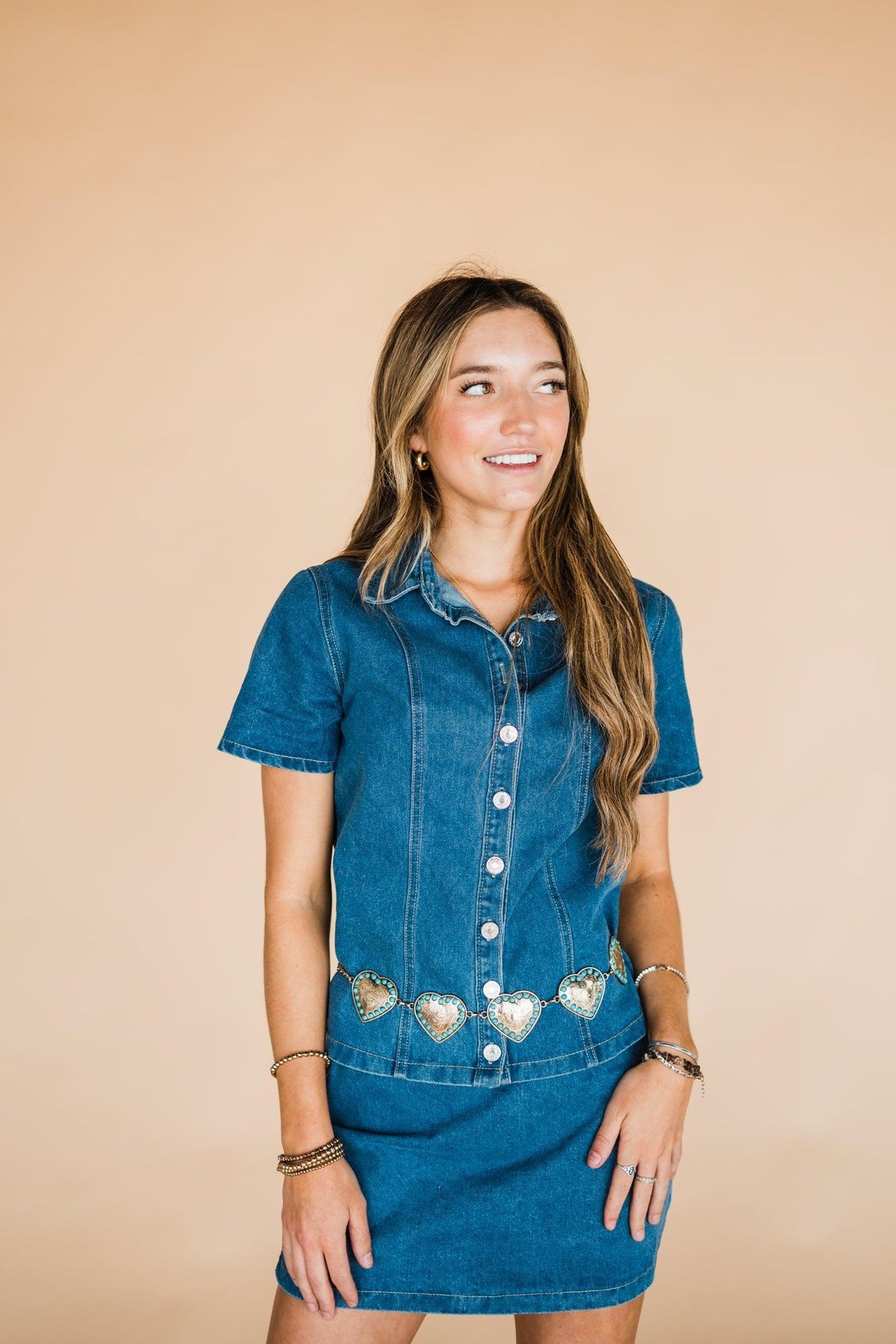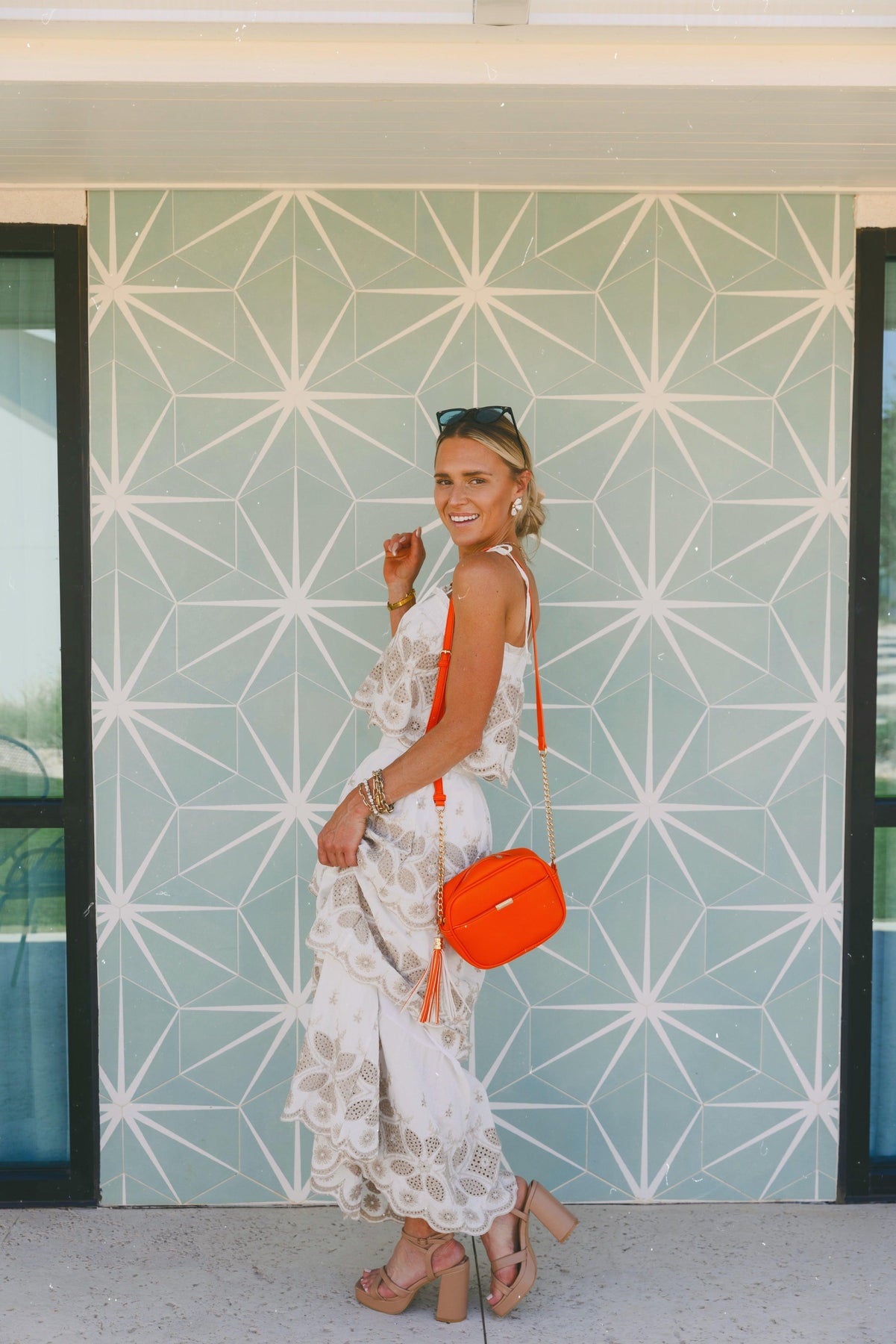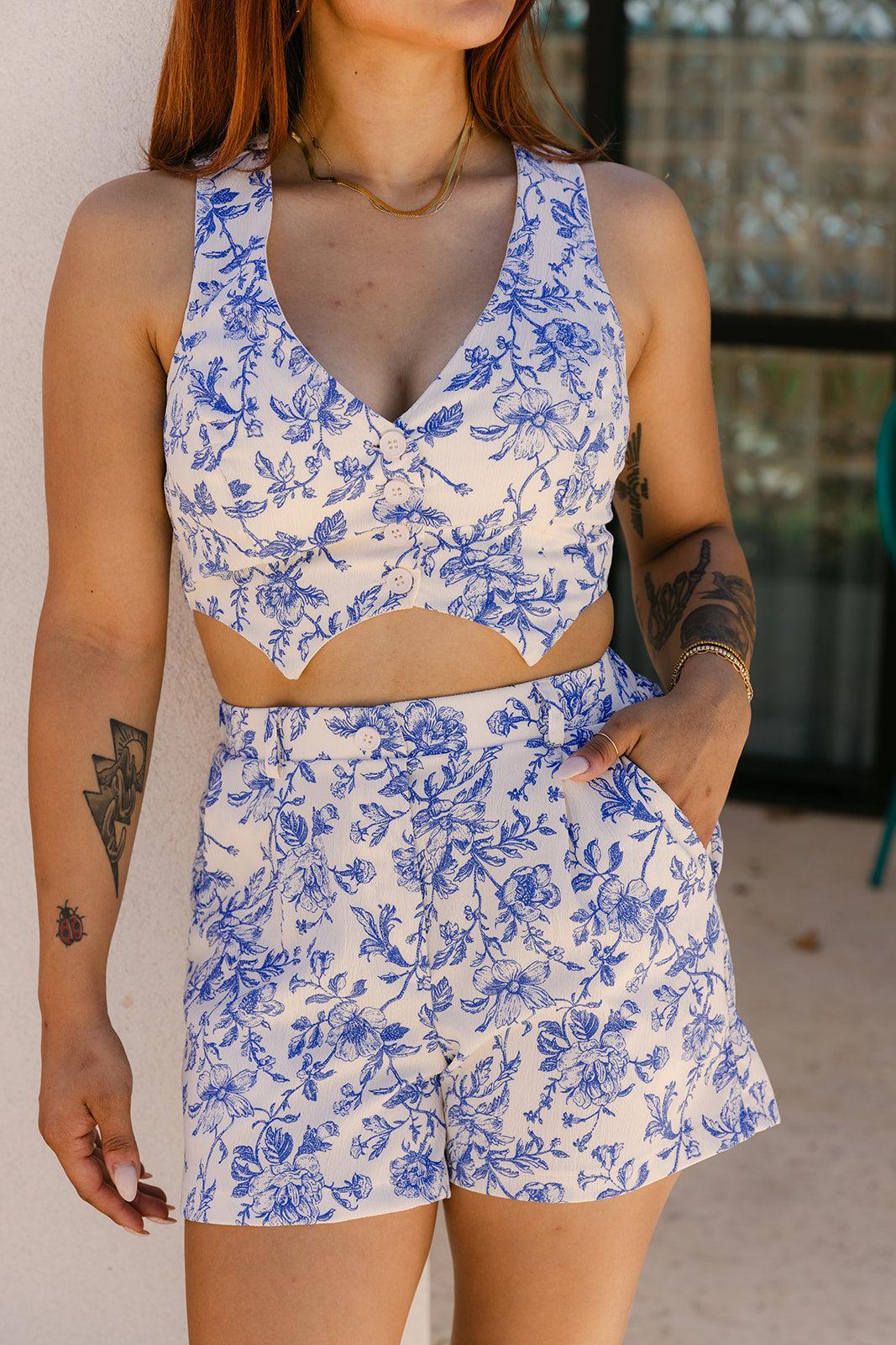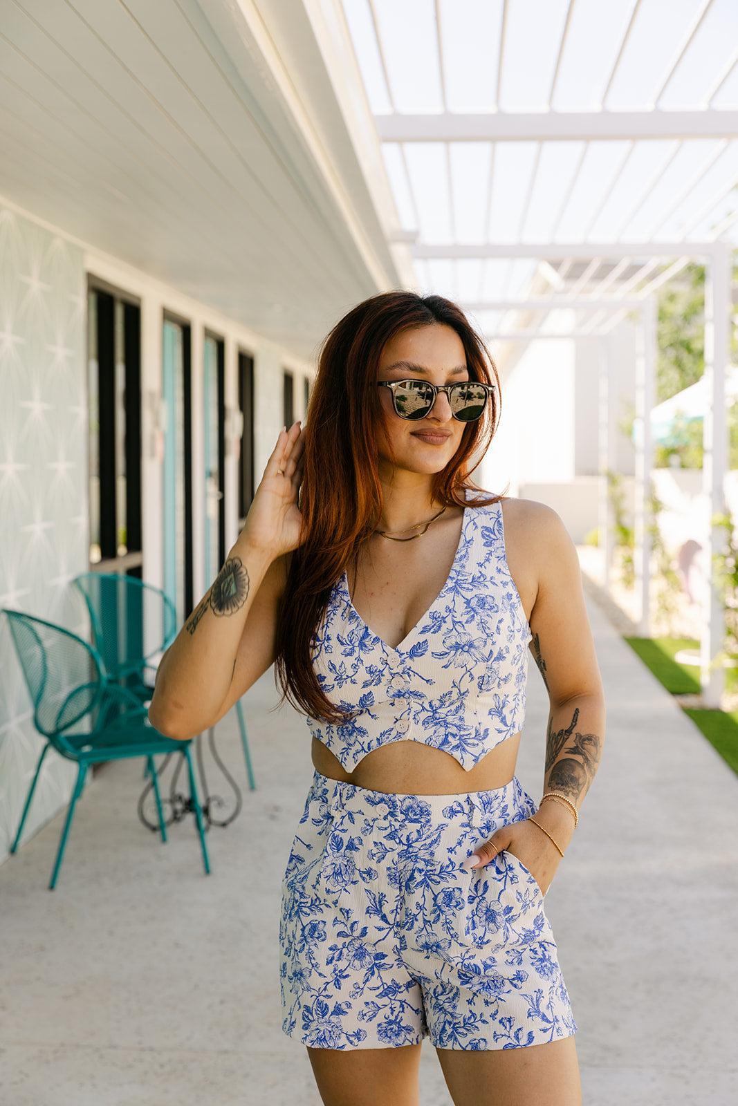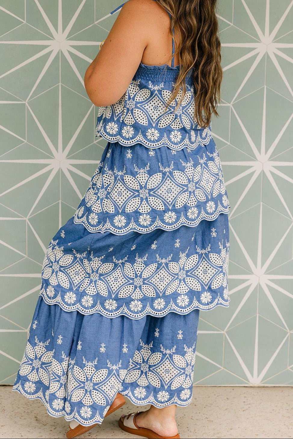 This matching set features a waist-length top with a square neckline and scalloped hem, paired with a coordinating high-rise skirt in embroidered eyelet fabric. Lightweight, breezy, and effortlessly feminine.