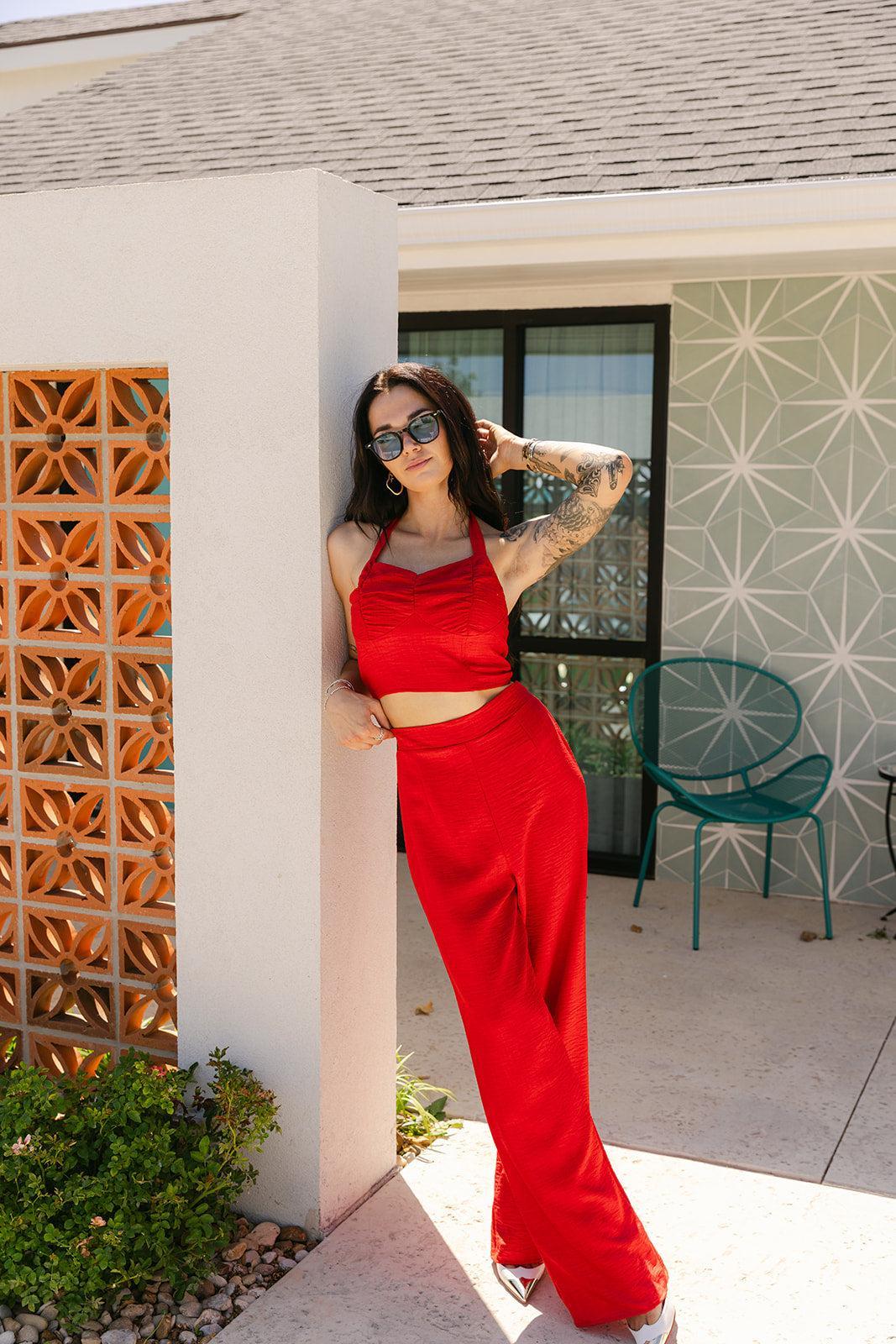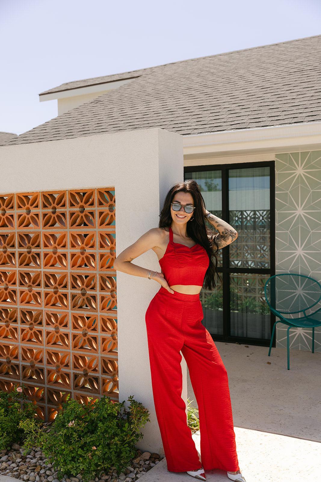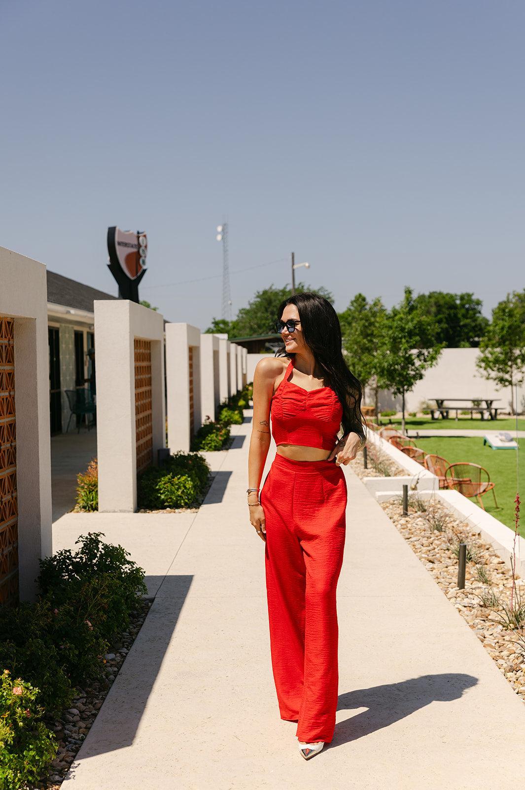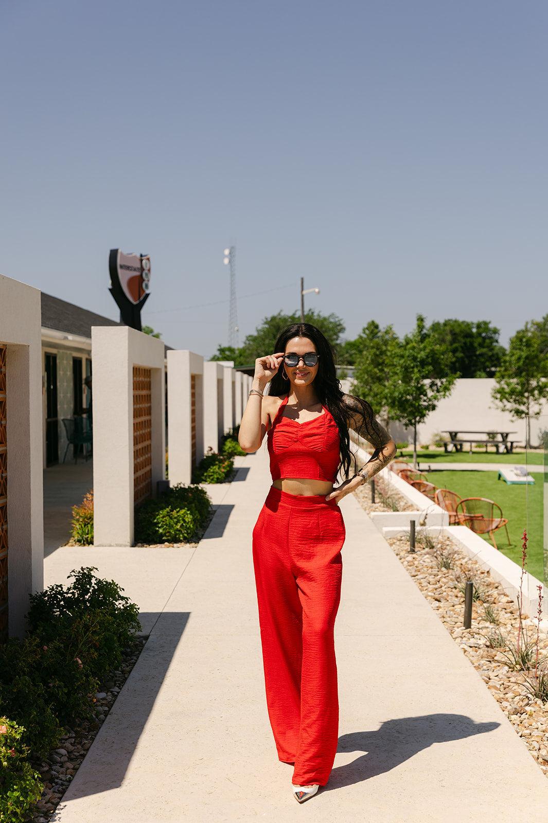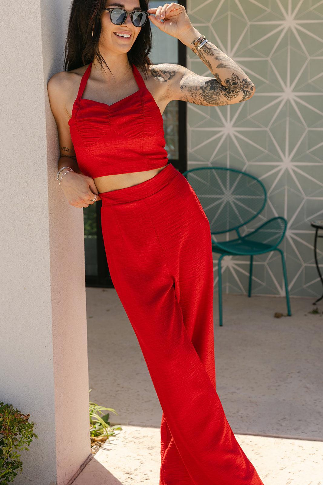 This matching red set brings the drama... without sacrificing comfort. The halter top shows off a gathered sweetheart neckline and smocked back, while the breezy pants keep things light and flattering. Pair it with heels or sandals, it’s made to pair with whatever your plans are.