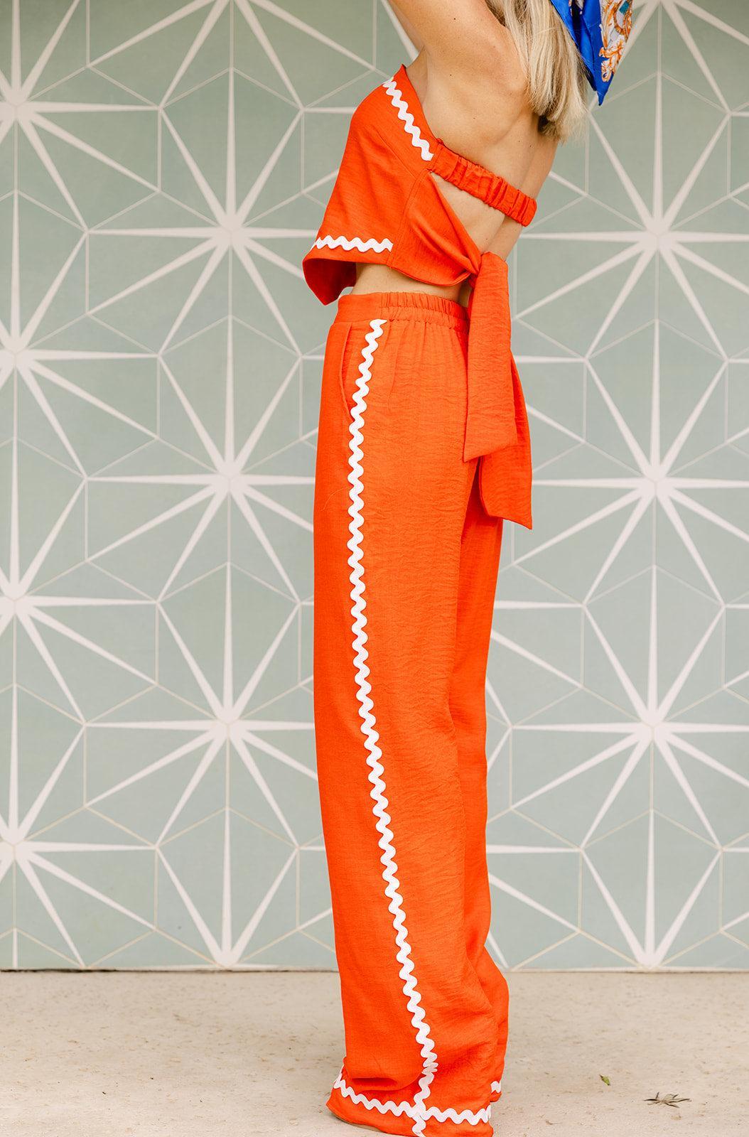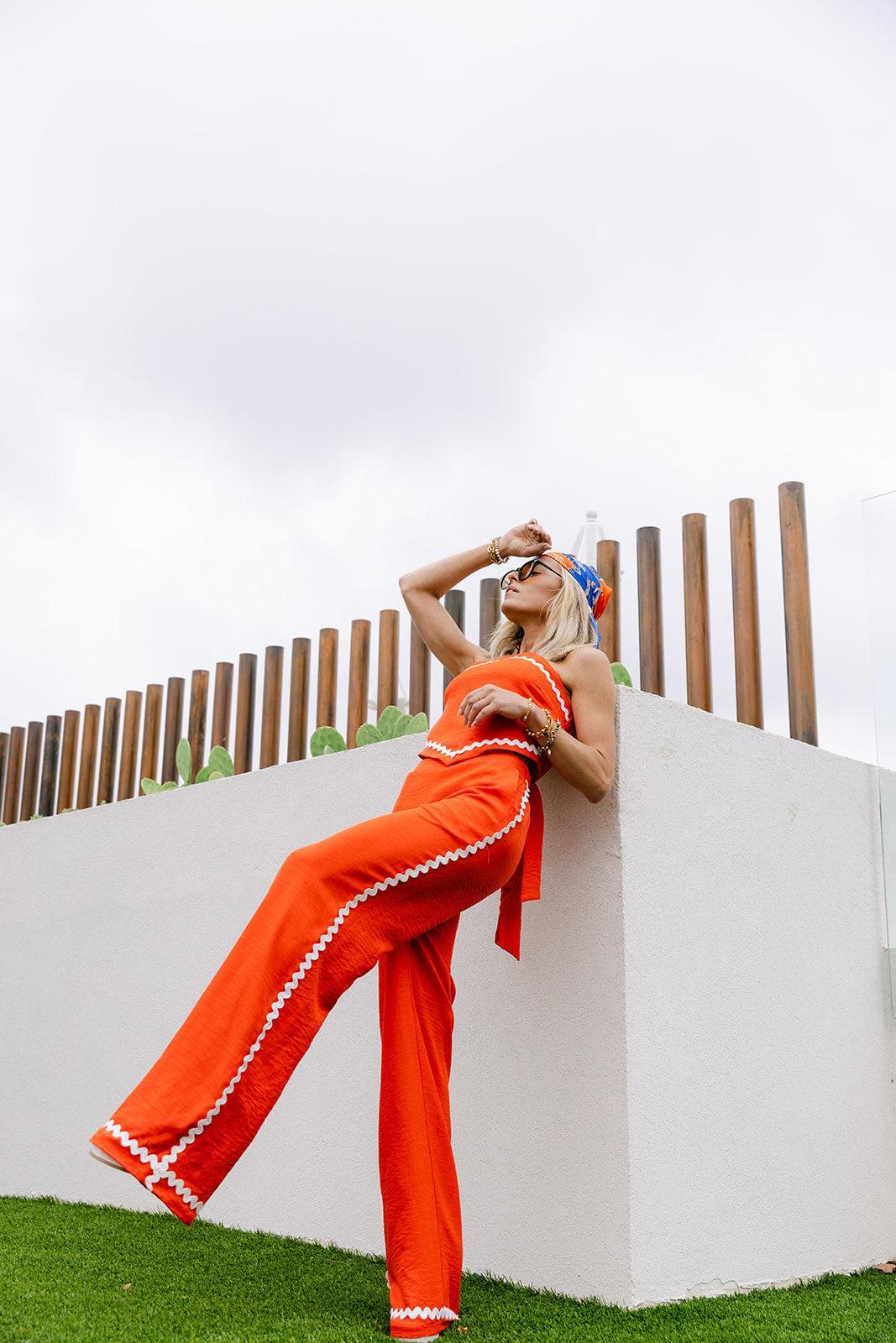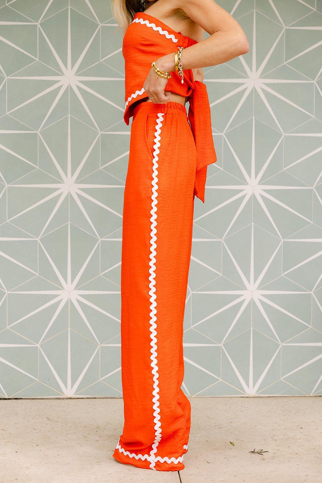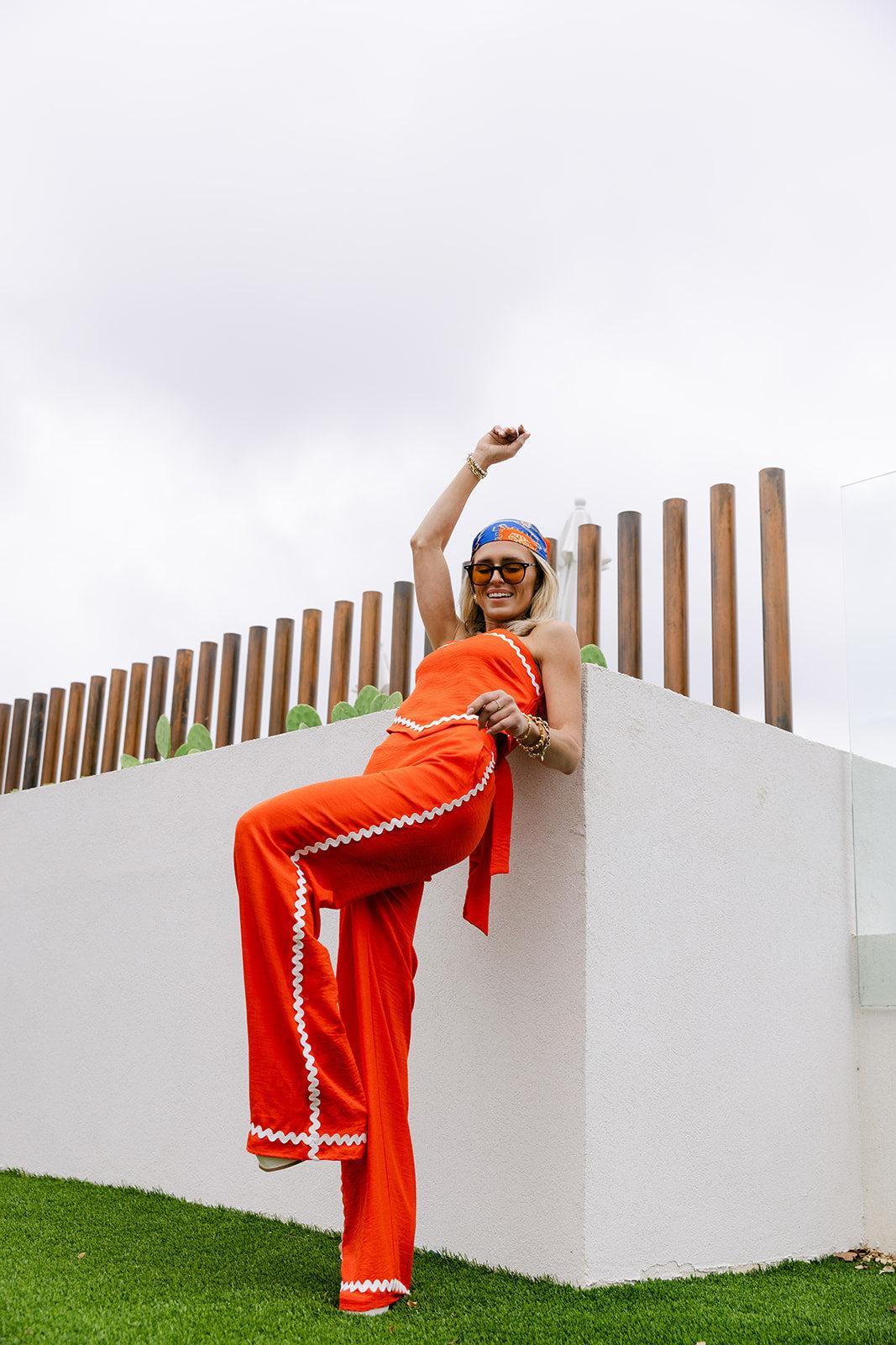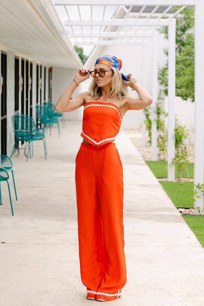 This matching red set brings the drama... without sacrificing comfort. The halter top shows off a gathered sweetheart neckline and smocked back, while the breezy pants keep things light and flattering. Pair it with heels or sandals, it’s made to pair with whatever your plans are.