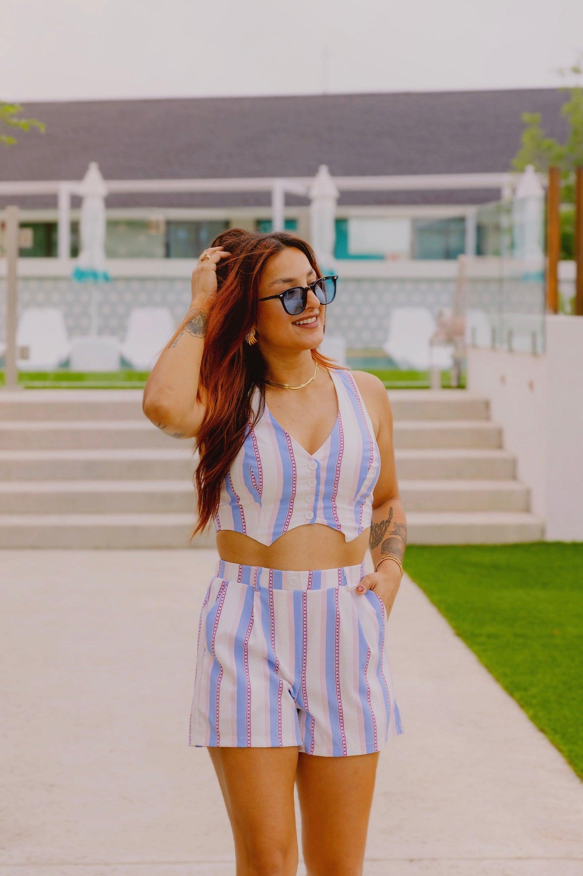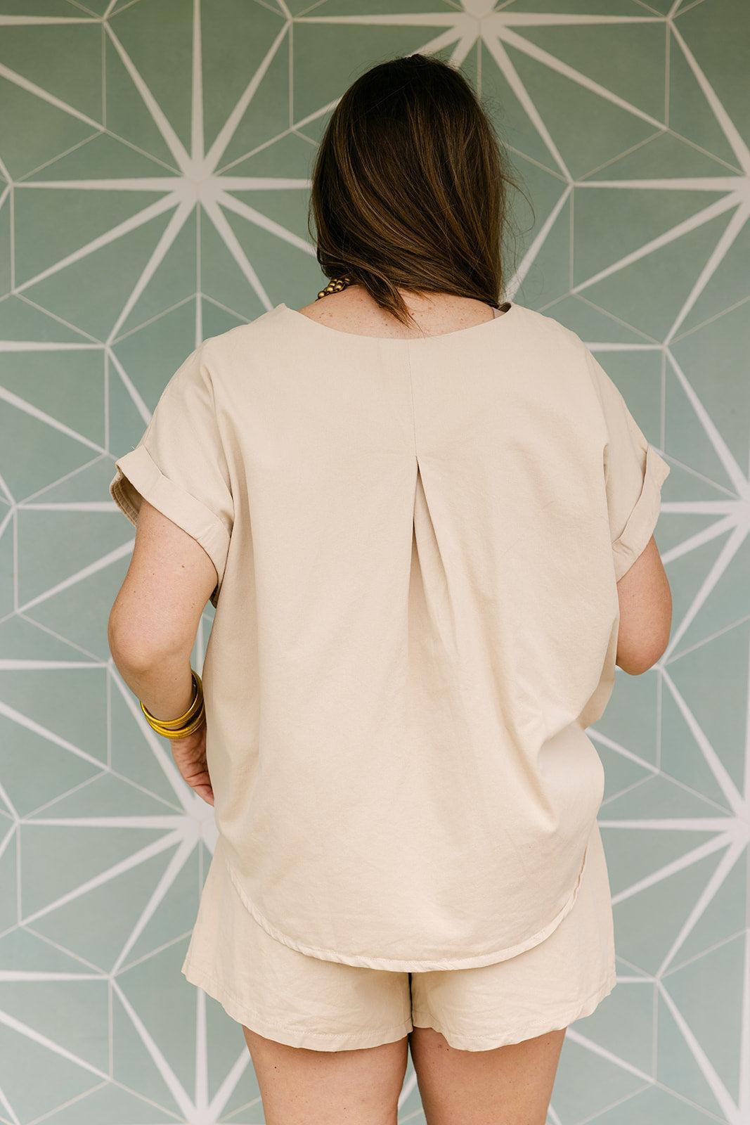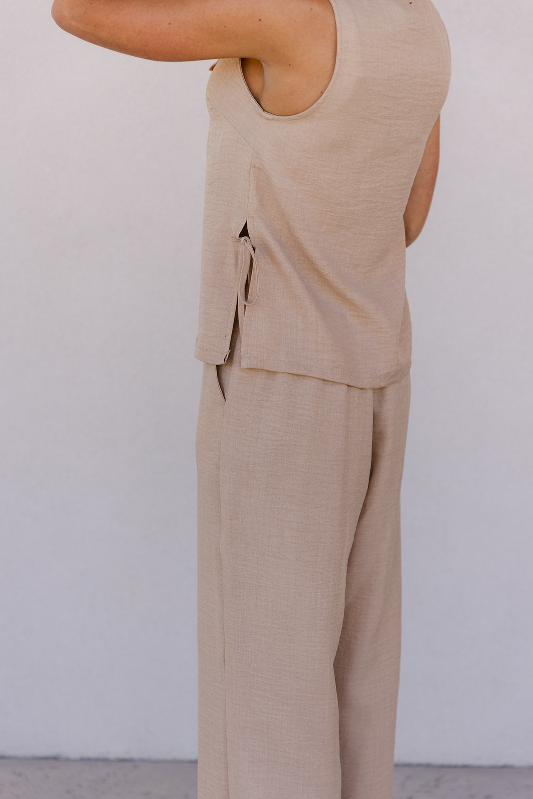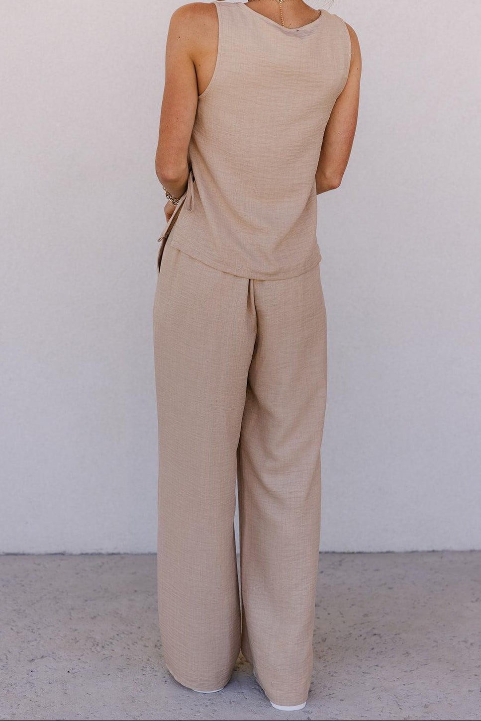 Chic and breathable, this linen set features a sleeveless v-neck top with a button-down front and side ties, paired with high-waisted wide-leg pants. Lightweight and effortless—perfect for warm days and easy styling.