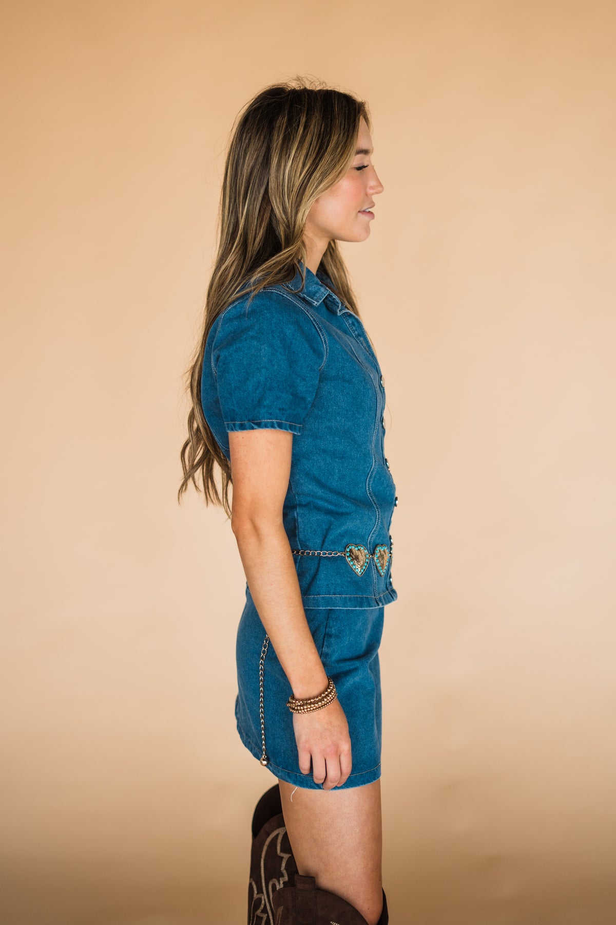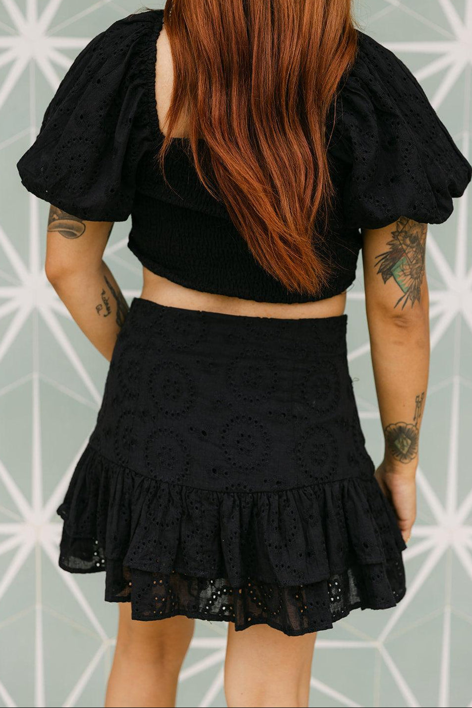 Consider this your best-dressed moment. Made from soft eyelet fabric, the puff-sleeve crop top features a square neckline and fitted bodice. The matching high-waisted skirt completes the look with a tiered mini hem—flirty, feminine, and ready for any summer plan.