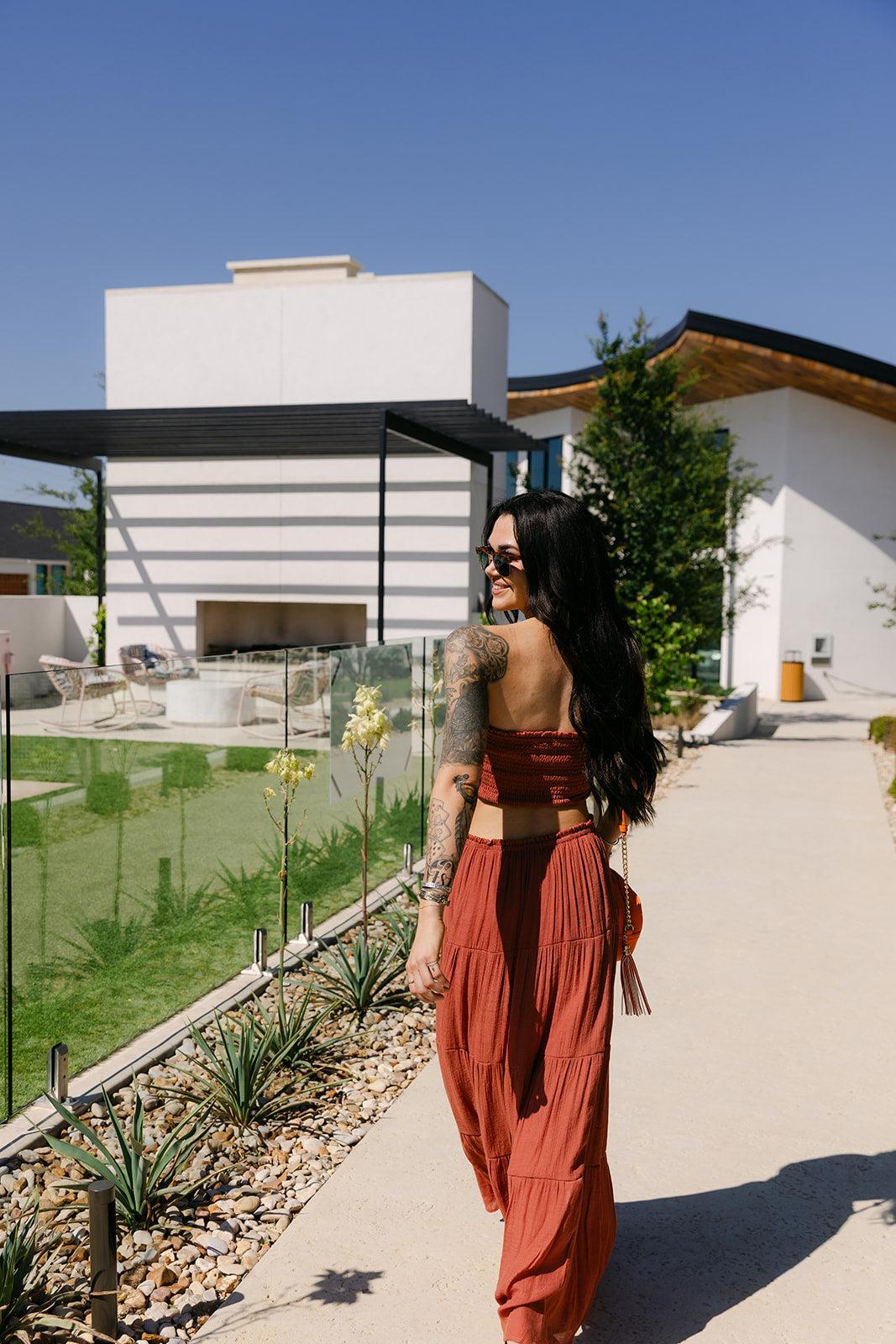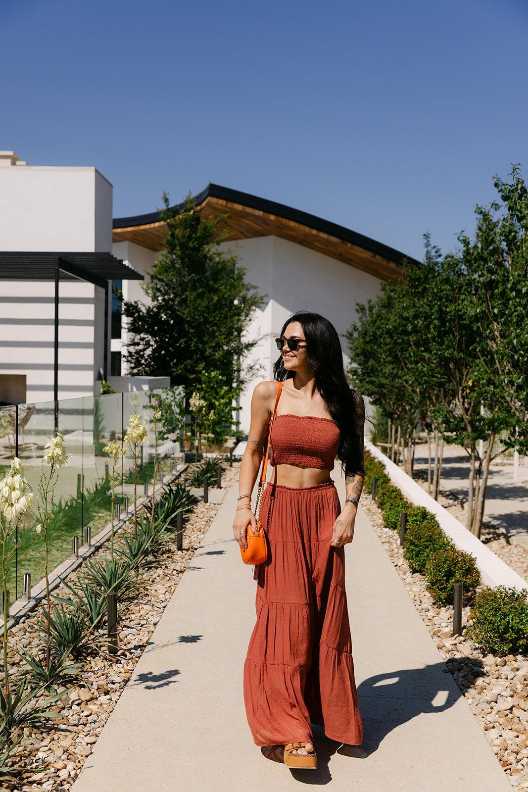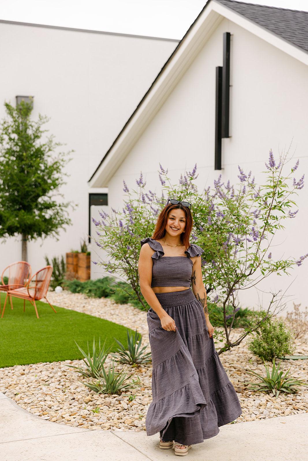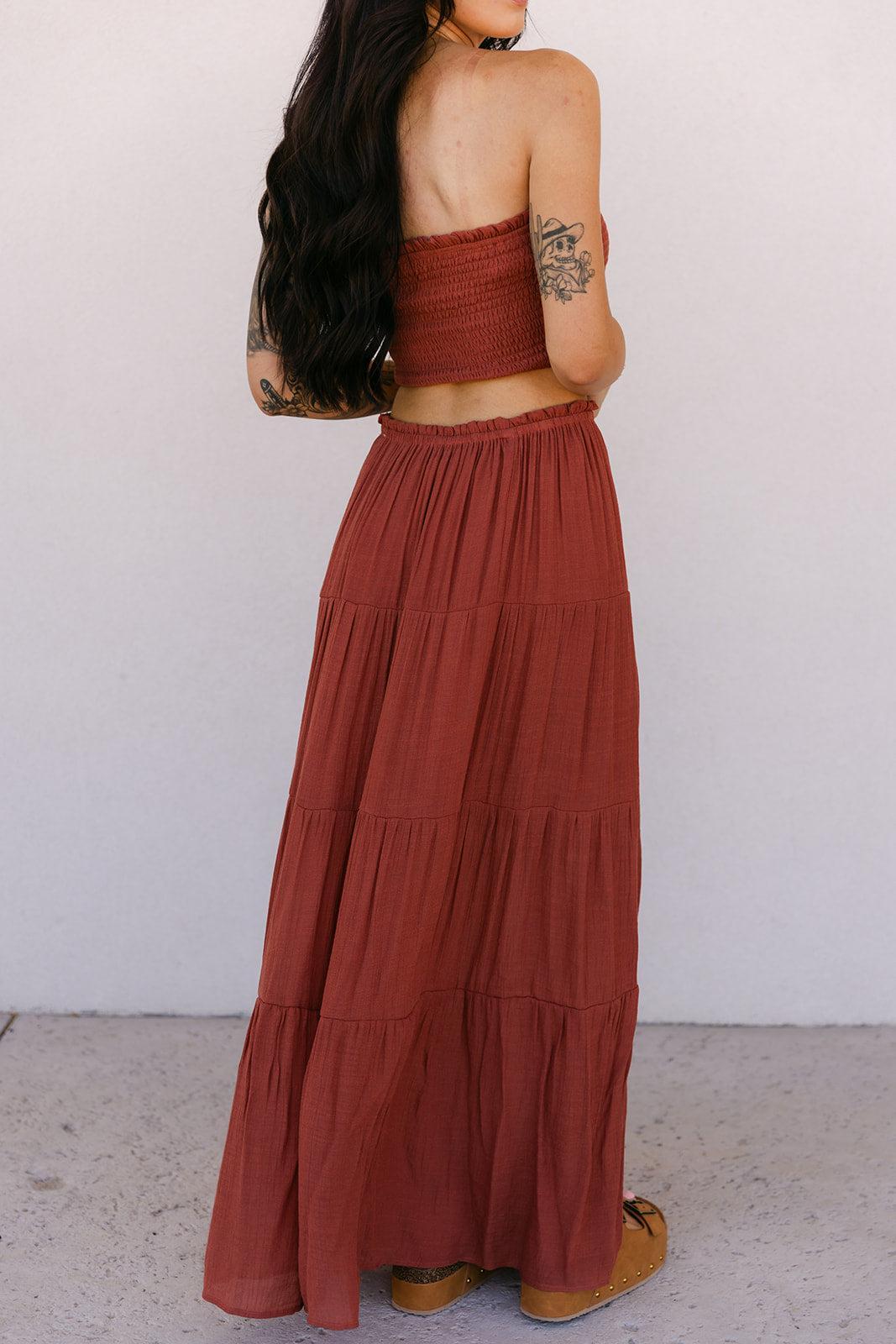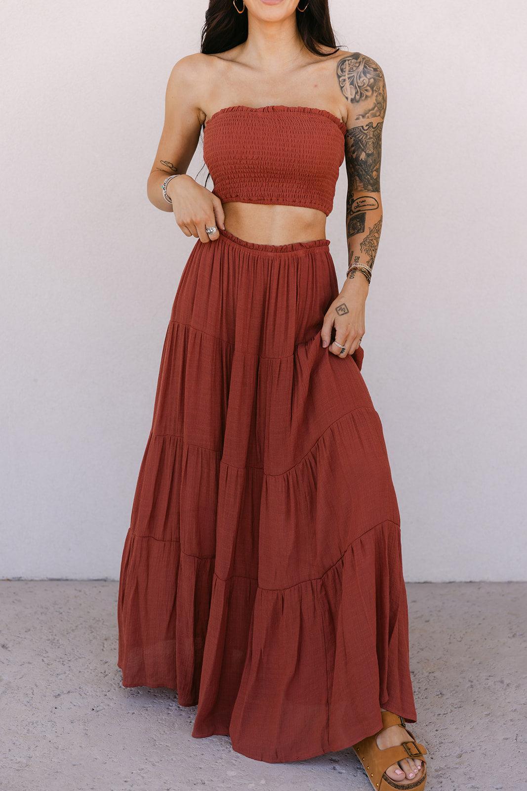 This matching set features a strapless smocked crop top paired with a high-rise maxi skirt. Gathered detailing and tiered layers add soft movement, making it an easy favorite that is comfortable + perfect for any occasion.