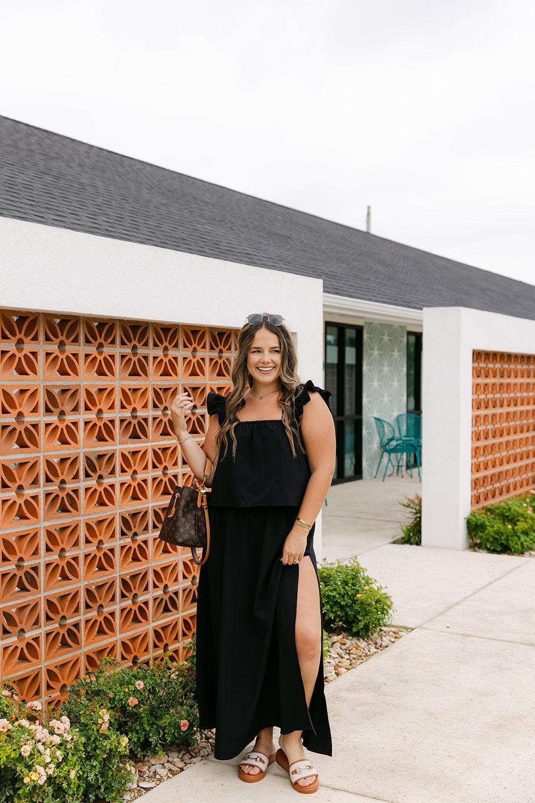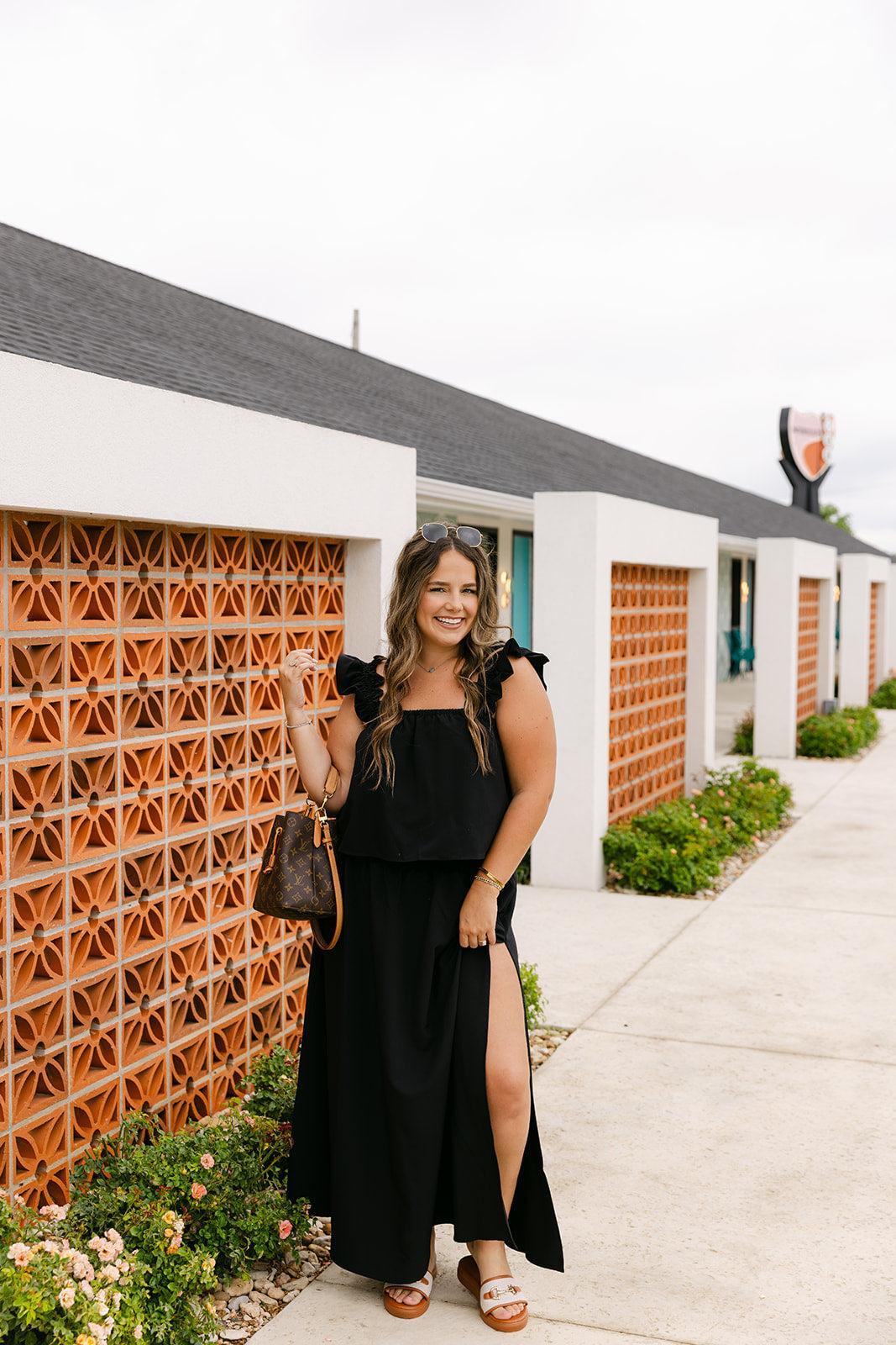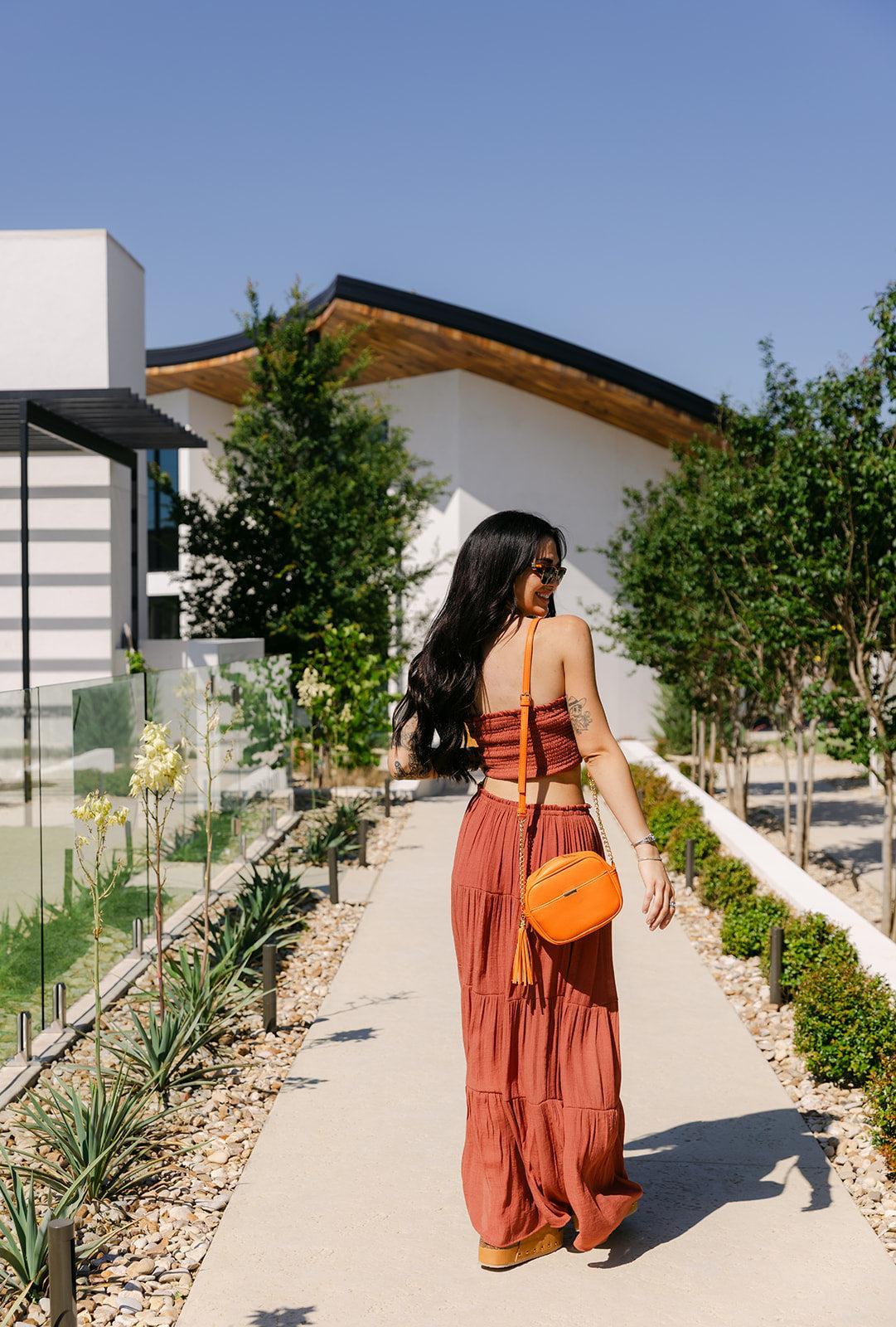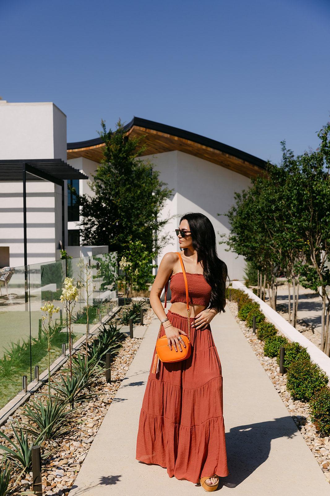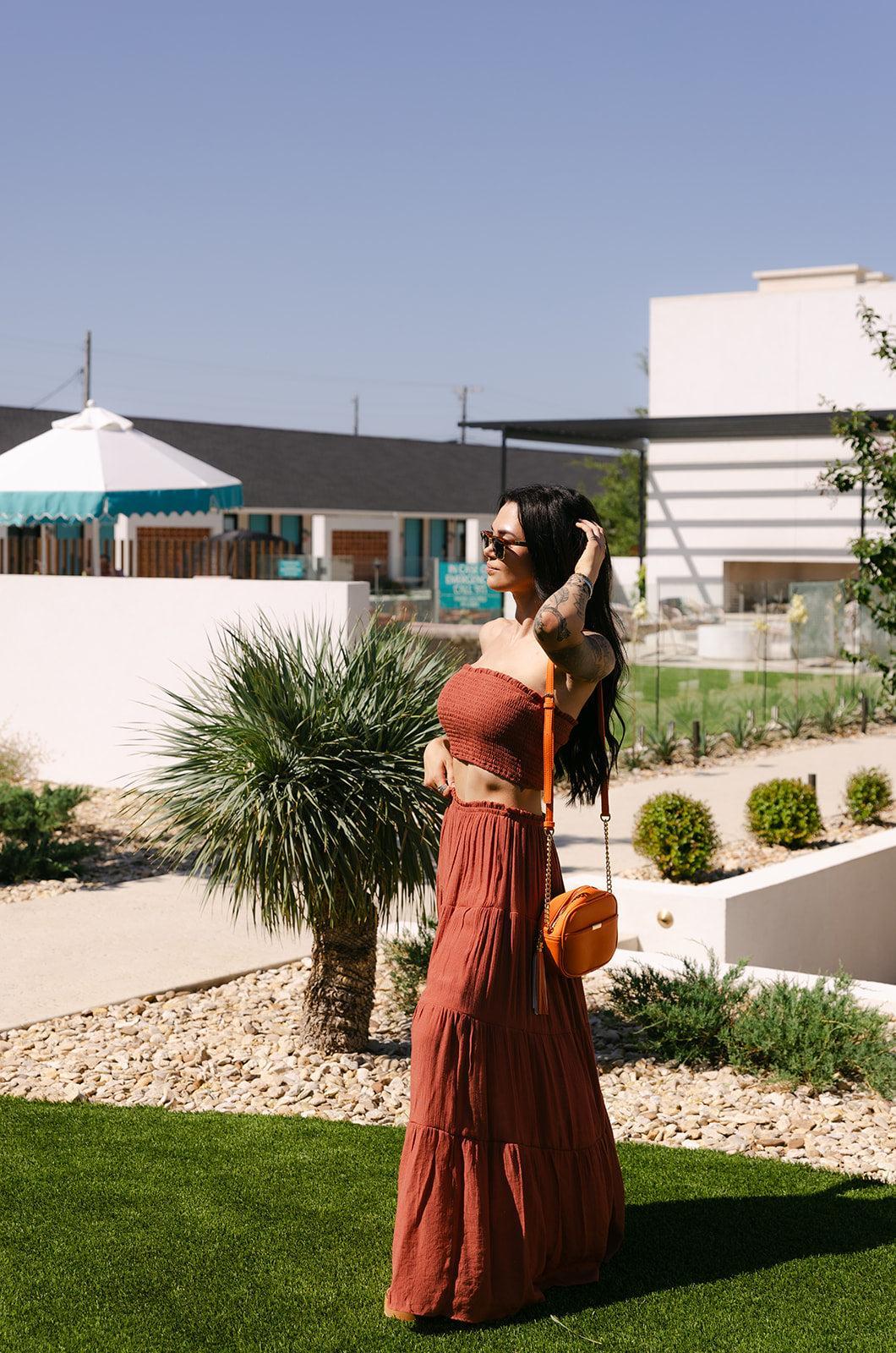This matching set features a strapless smocked crop top paired with a high-rise maxi skirt. Gathered detailing and tiered layers add soft movement, making it an easy favorite that is comfortable + perfect for any occasion.