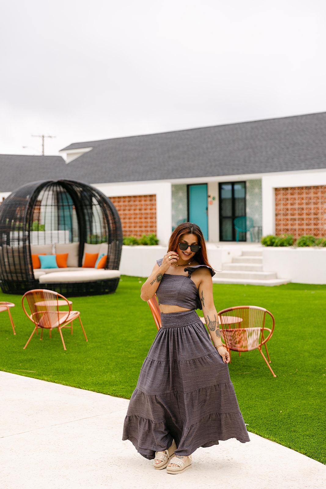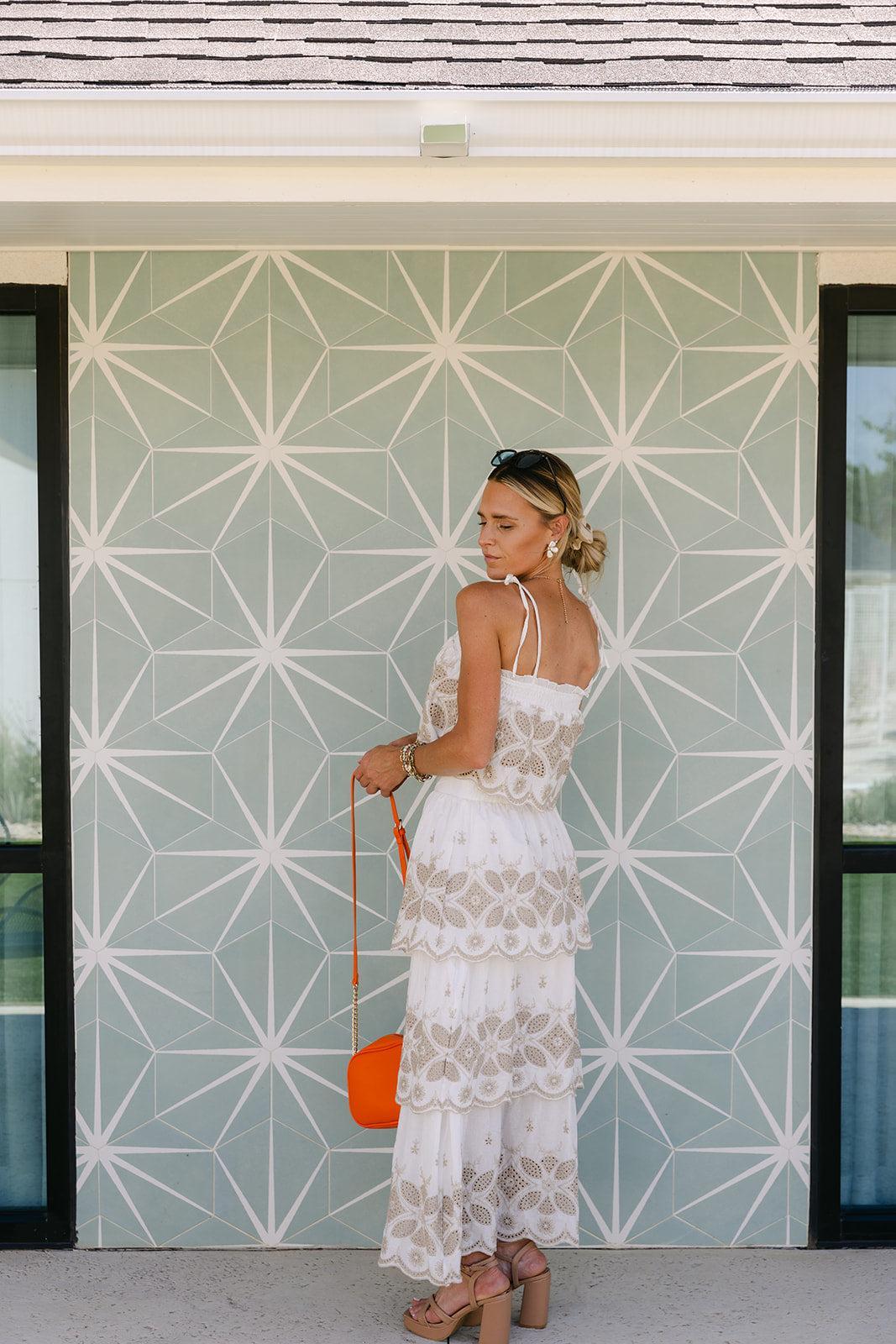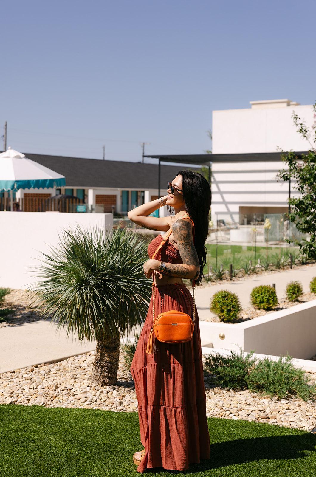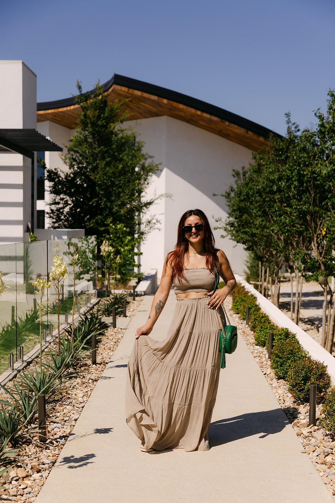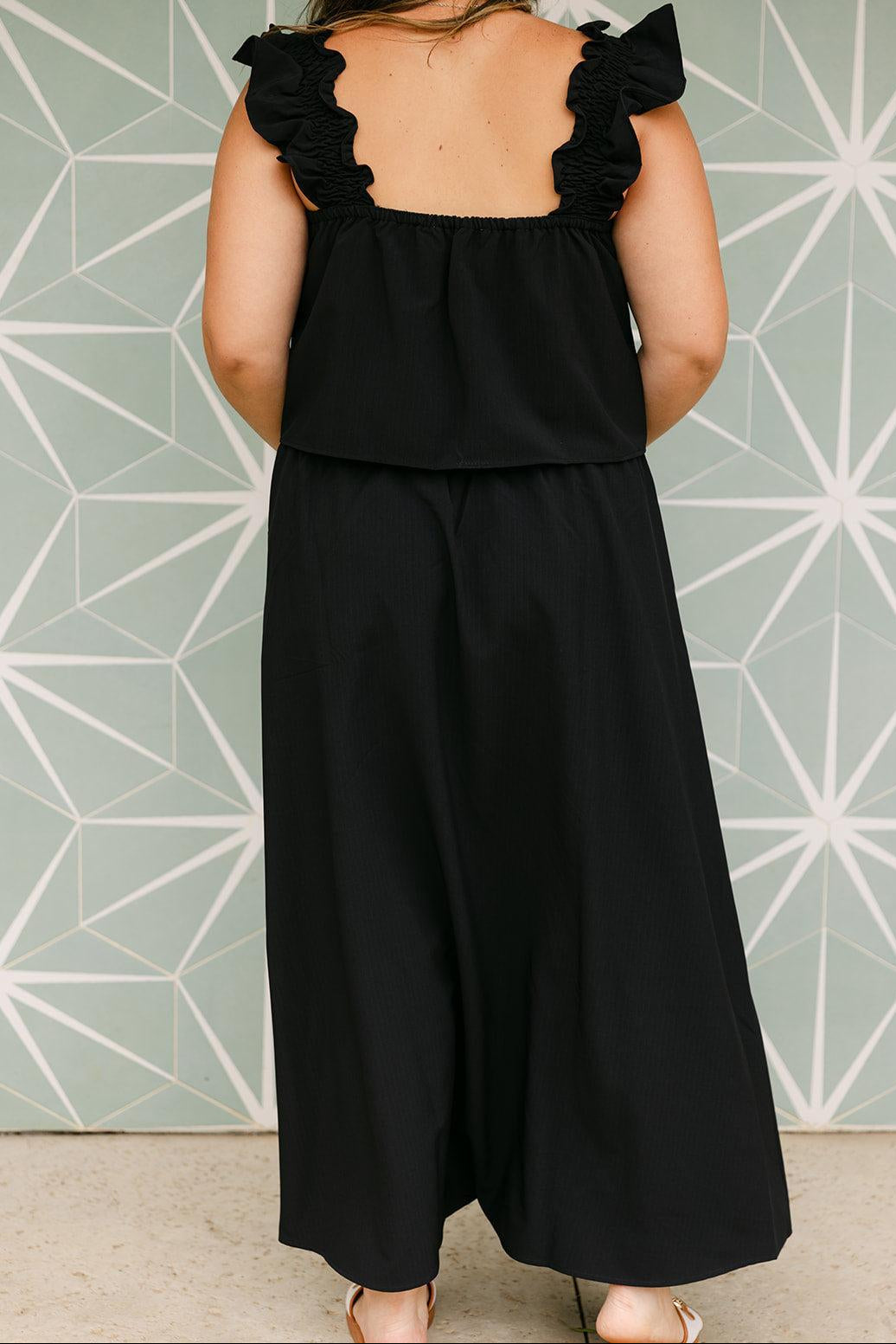 This matching set features a strapless smocked crop top paired with a high-rise maxi skirt. Gathered detailing and tiered layers add soft movement, making it an easy favorite that is comfortable + perfect for any occasion.