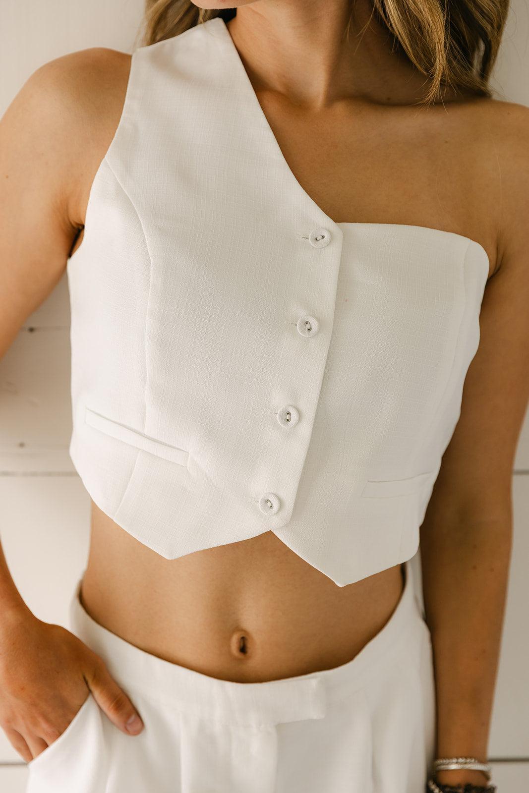This matching set features a strapless, ruched crop top with an overlapping bodice and coordinating high-waisted wide-leg pants. The elastic waistband adds comfort, while the structured silhouette keeps it effortlessly on-trend.