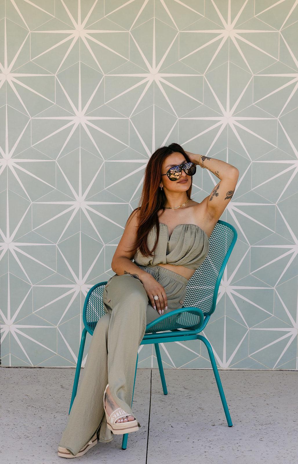 This soft linen set features a gathered cami top with subtle elastic detailing and matching wide-leg pants with a high, drawstring waist. The perfect blend of comfort and style for easy summer days on the beach or at brunch.