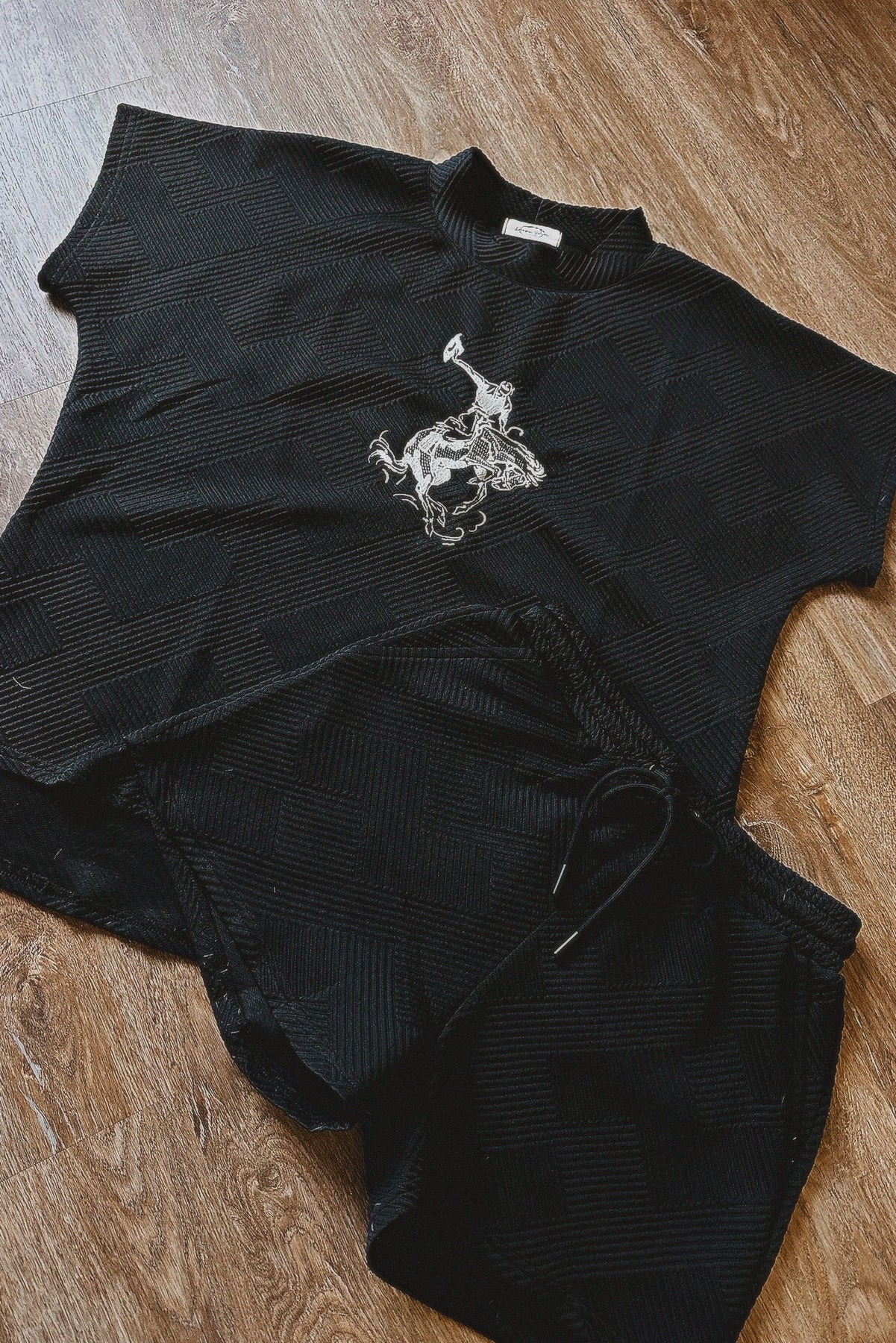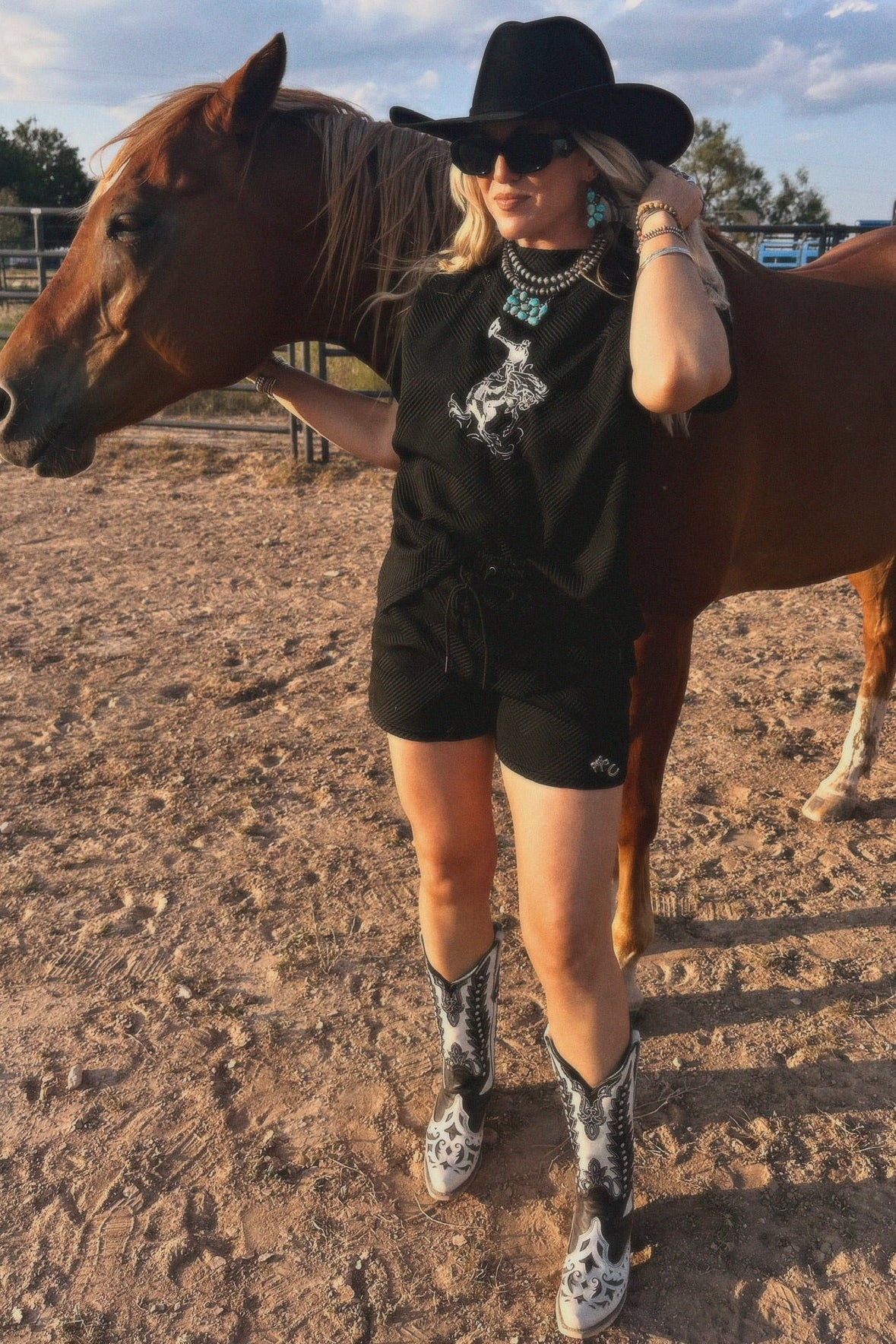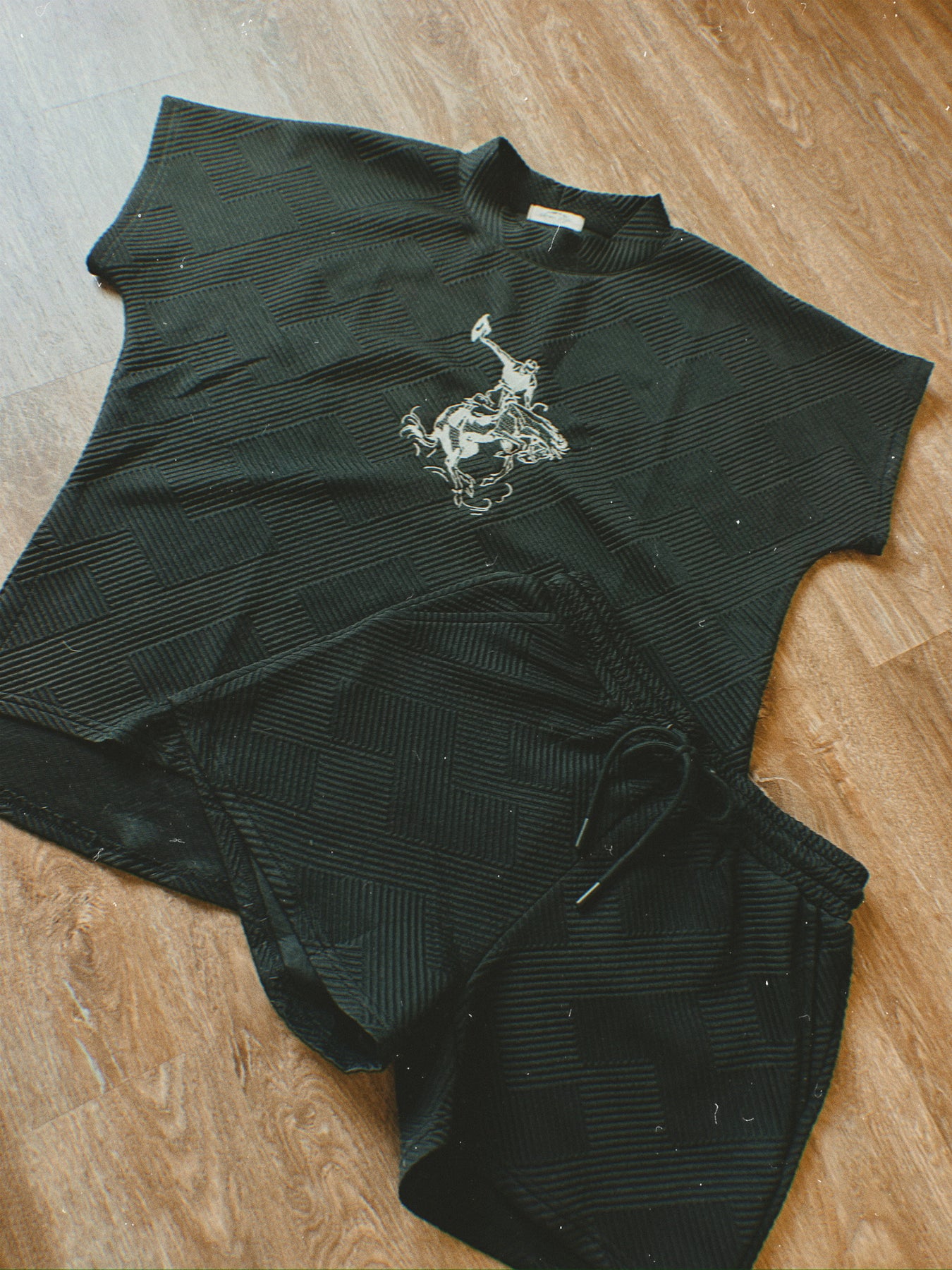 A laid-back set with a touch of Western grit. This solid textured tee and shorts combo features a buckin’ horse embroidery design, finished with dolman sleeves, a high neck, and a drawstring waist for an easy, lived-in feel.