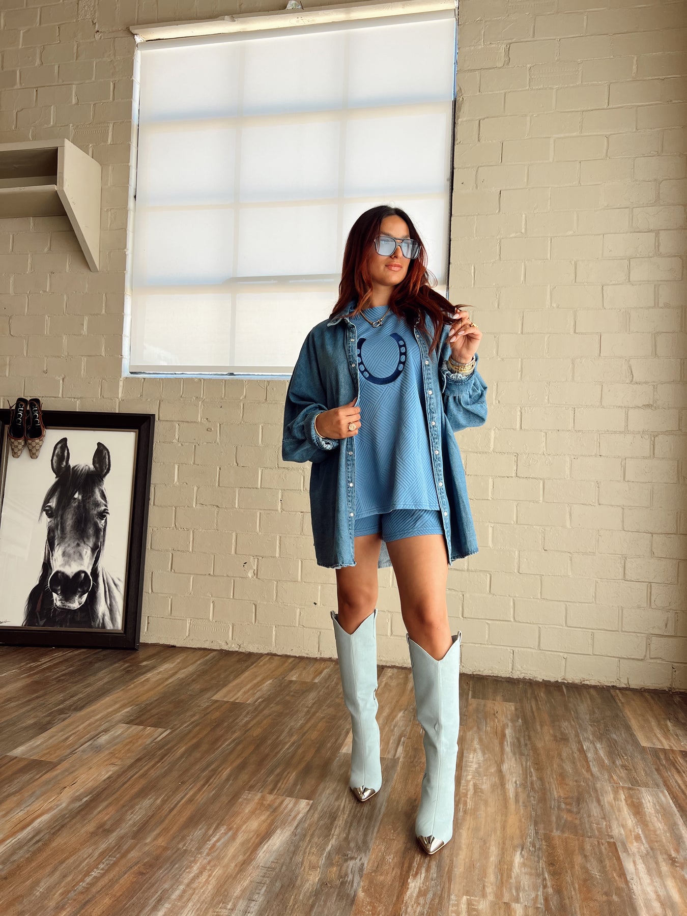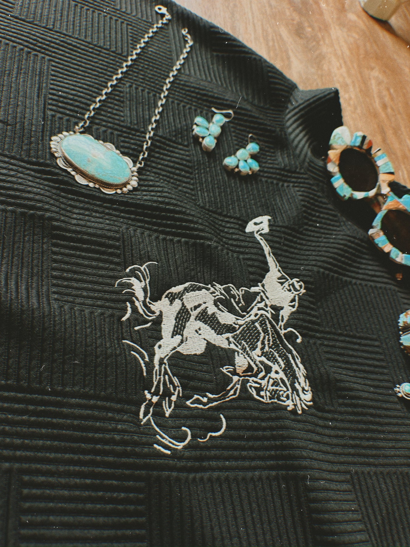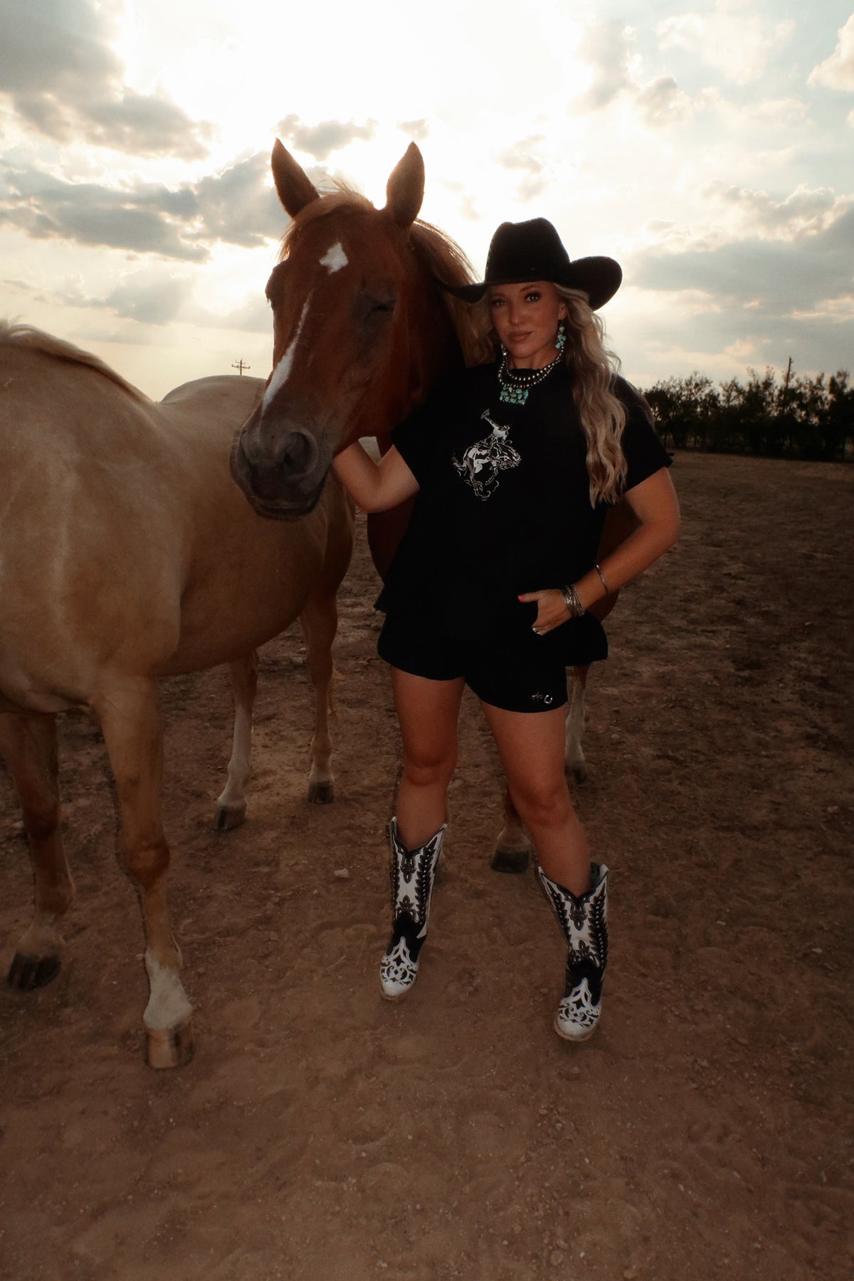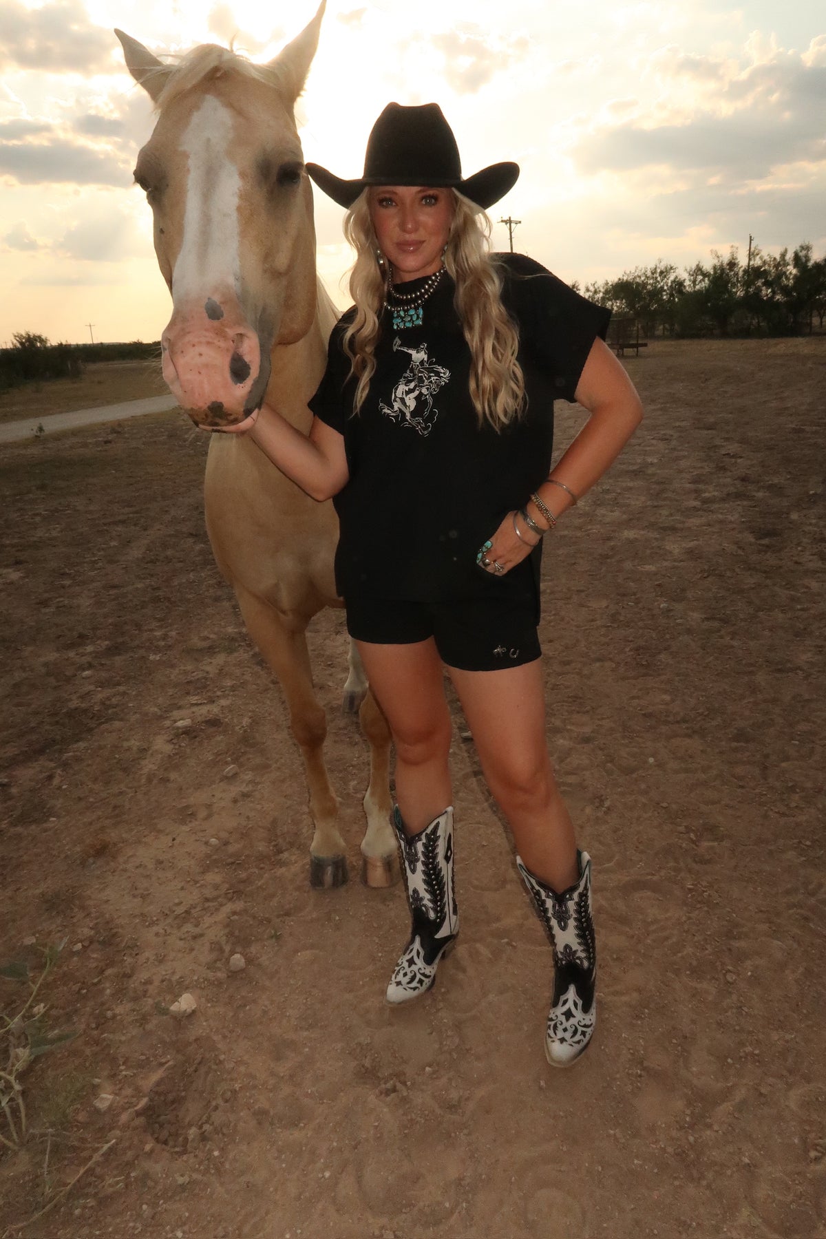 A laid-back set with a touch of Western grit. This solid textured tee and shorts combo features a buckin’ horse embroidery design, finished with dolman sleeves, a high neck, and a drawstring waist for an easy, lived-in feel.