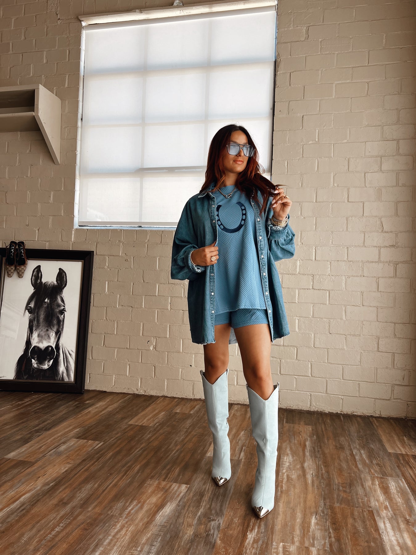 A lil’ cozy, a lil’ cowgirl. This fleece set is rodeo-week ready, pairing a soft long-sleeve sweatshirt with matching shorts for the perfect mix of comfort and Western edge. An elastic waistband and side pockets keep it practical, while the relaxed fit brings that ride-or-relax vibe—whether you’re arena-side, strip-side, or fireside.