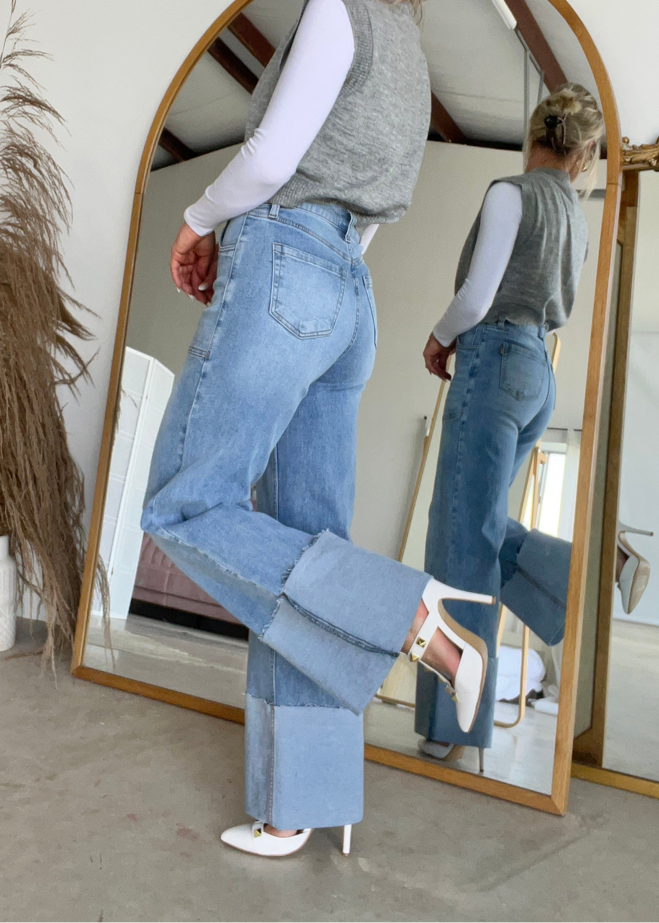 A high waisted, premium denim, vintage-wash wide leg trouser featuring a double button closure detail. With an 11" rise and 34" inseam, these jeans can go from the office to the arena with ease.