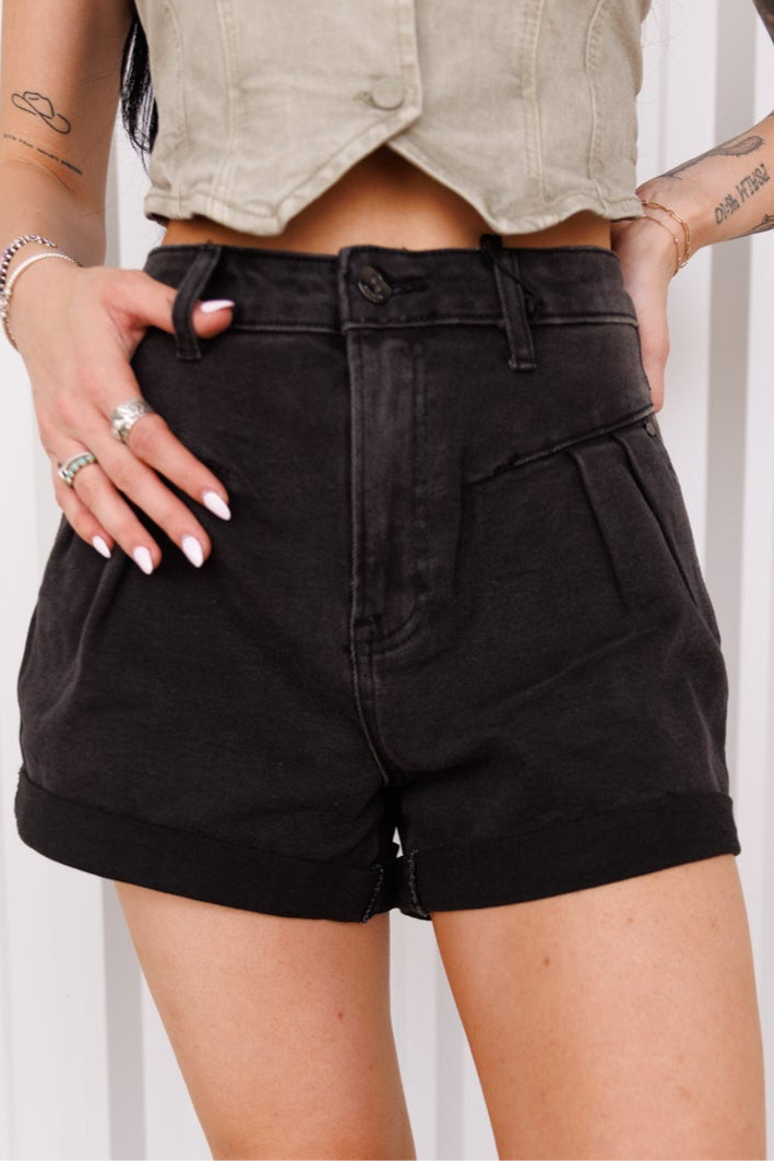 Everyone needs a good pair of black denim shorts. These high-waisted destroyed acid denim shorts feature a center button down for closure and side and back pocked with frayed ends.