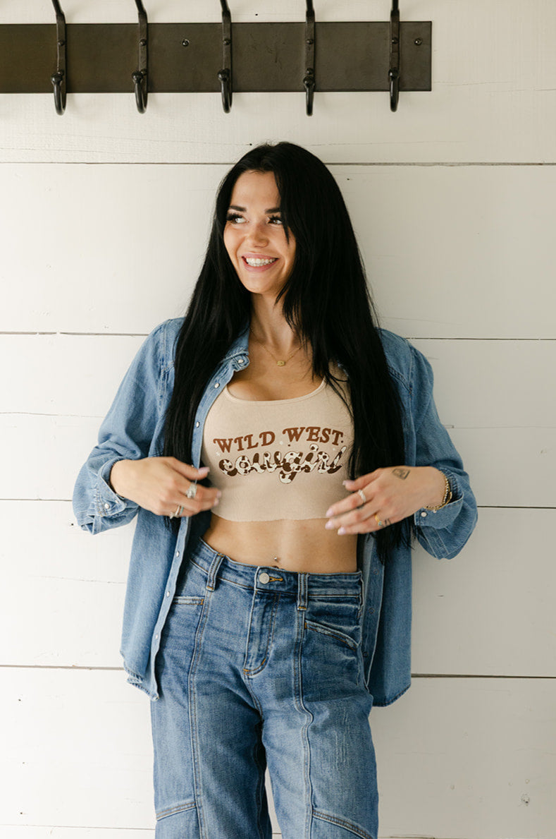 This cropped tank features a bold “Wild West Cowgirl” graphic on a soft, fitted silhouette. Perfect for pairing with high-rise denim or layering under your favorite jacket.