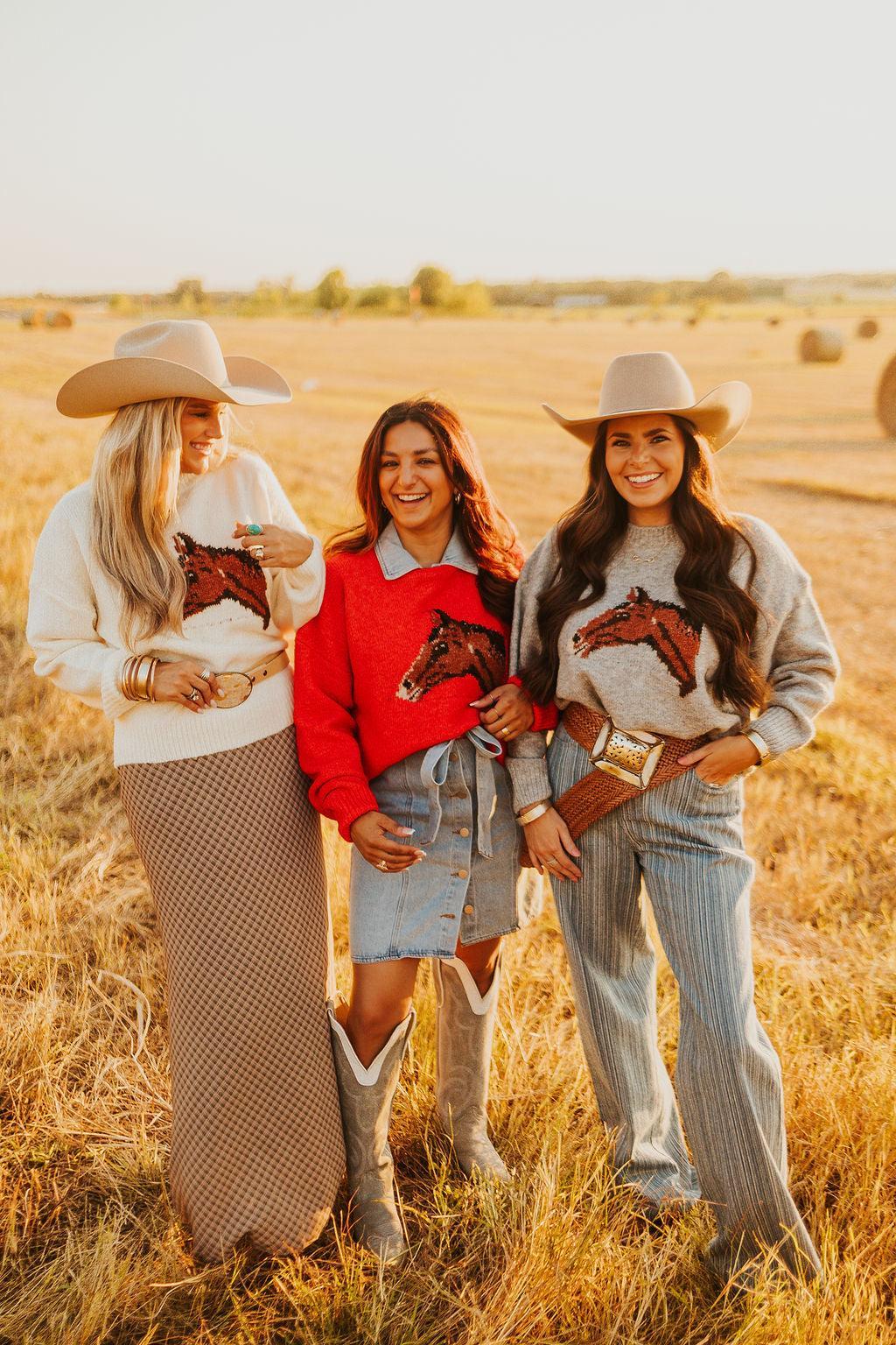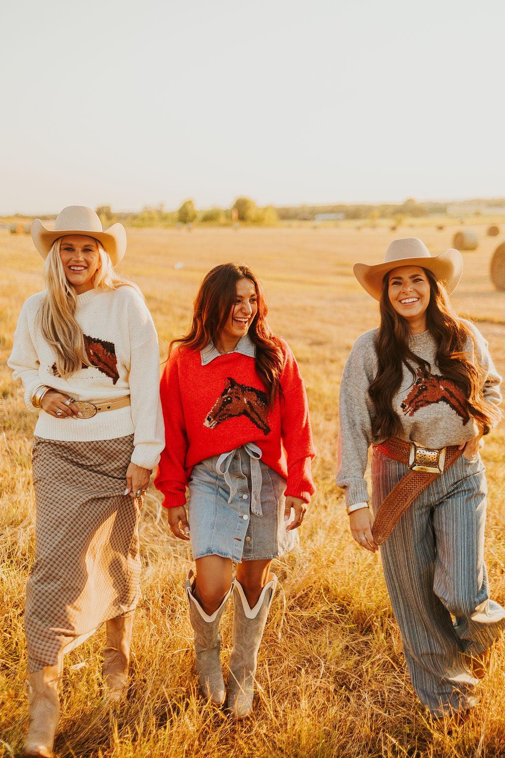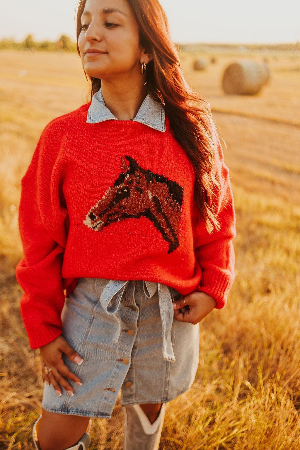 Classic western meets cozy comfort. This knit sweater features a bold horse graphic that adds rustic charm and standout style to your cold-weather lineup. With its soft feel and relaxed fit, it’s the perfect piece to take you from stable mornings to fireside nights.