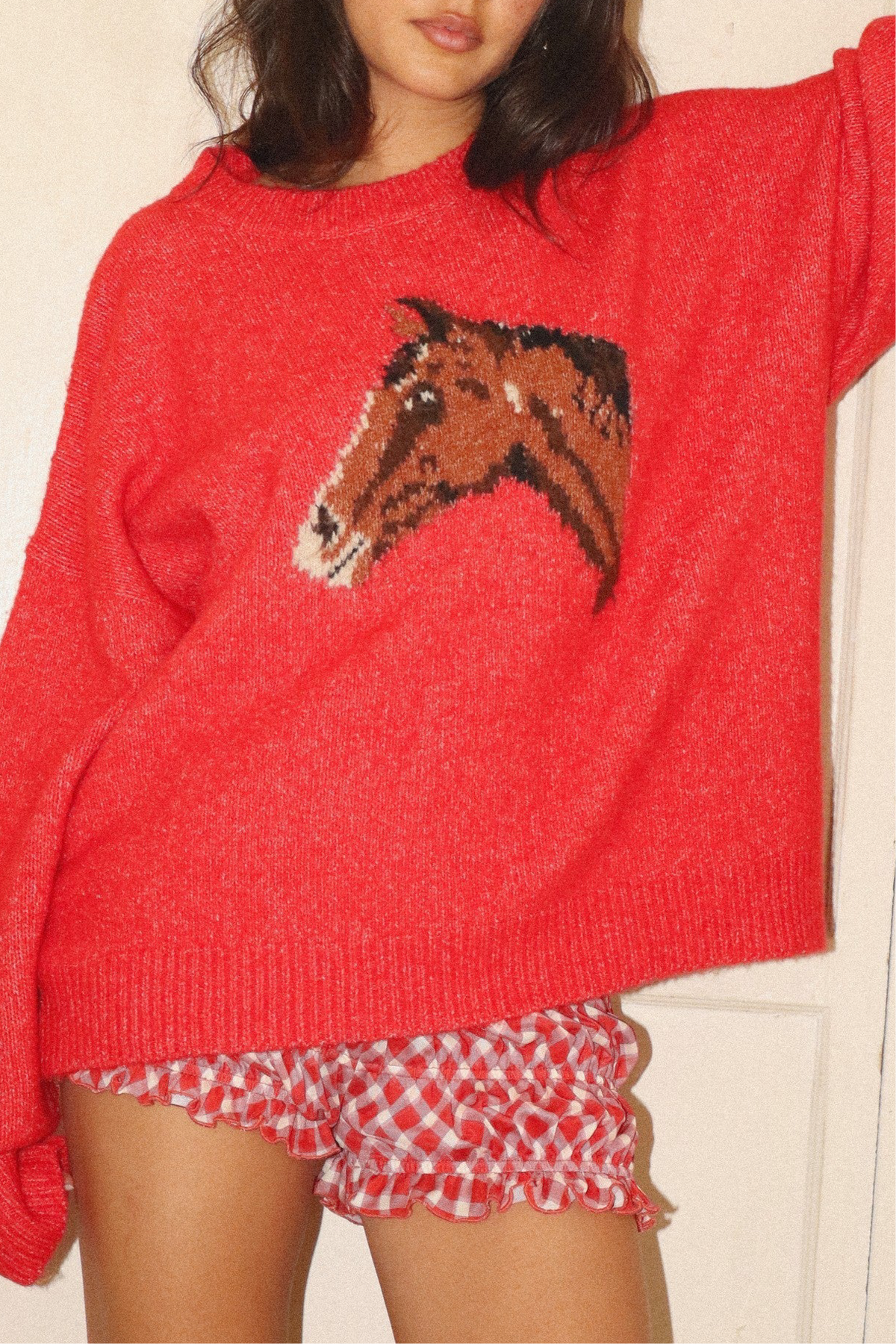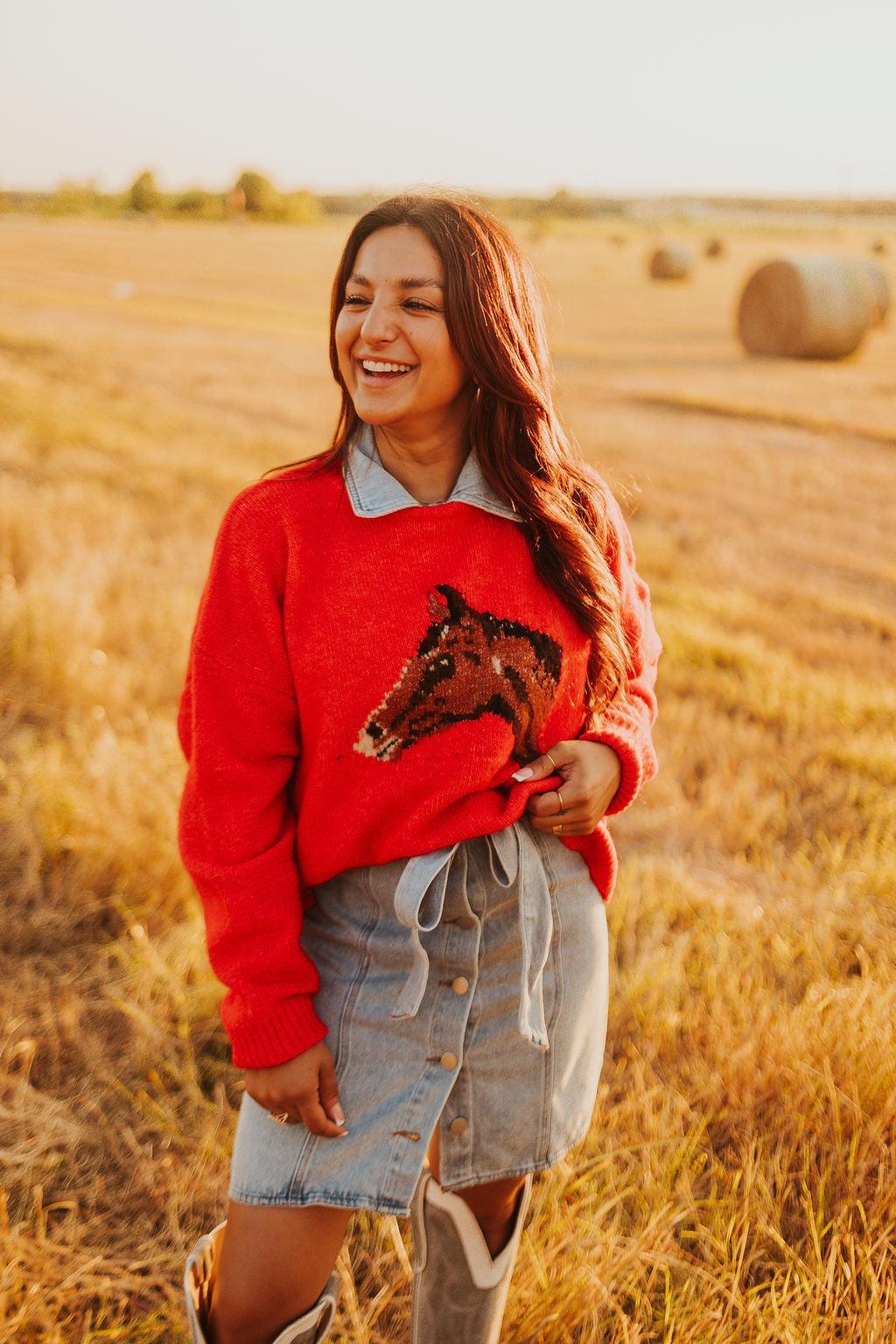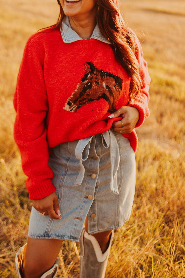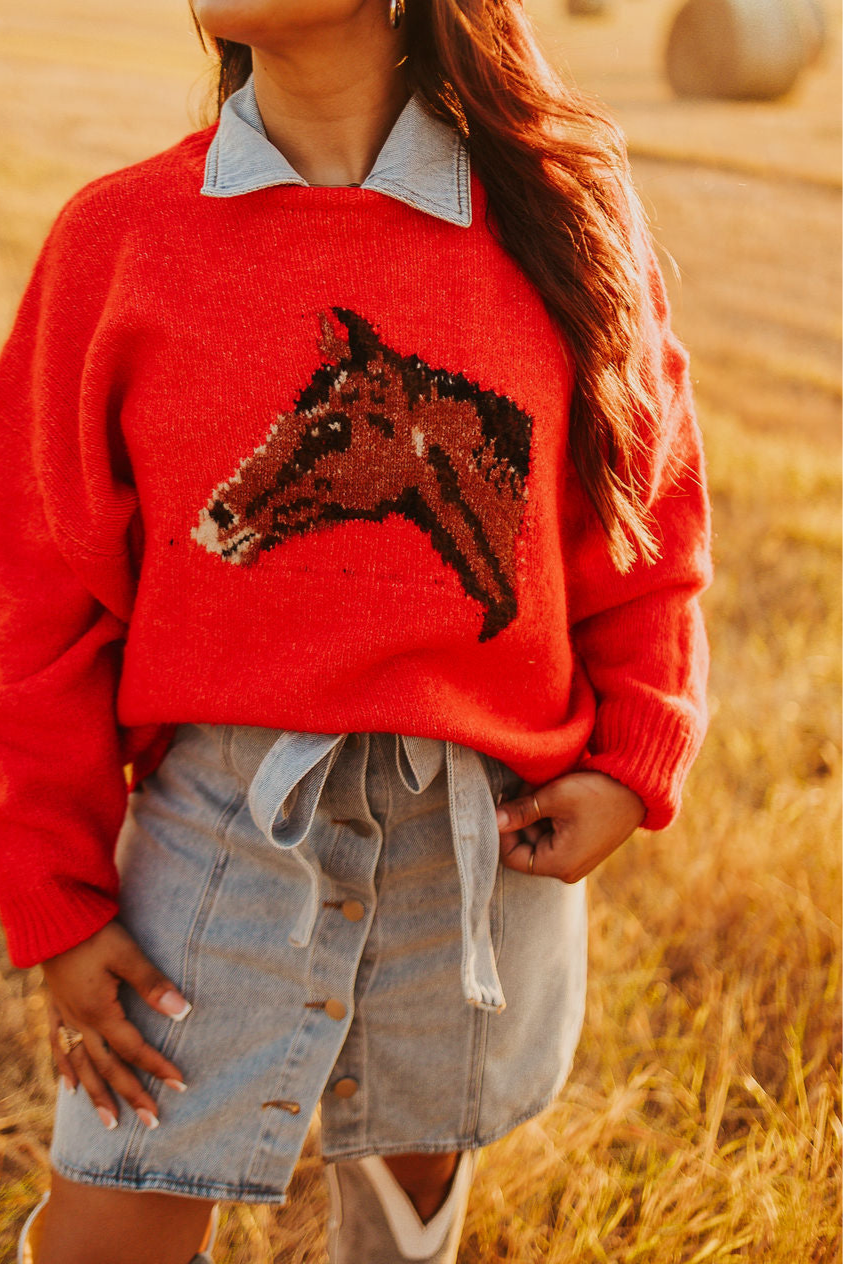Classic western meets cozy comfort. This knit sweater features a bold horse graphic that adds rustic charm and standout style to your cold-weather lineup. With its soft feel and relaxed fit, it’s the perfect piece to take you from stable mornings to fireside nights.