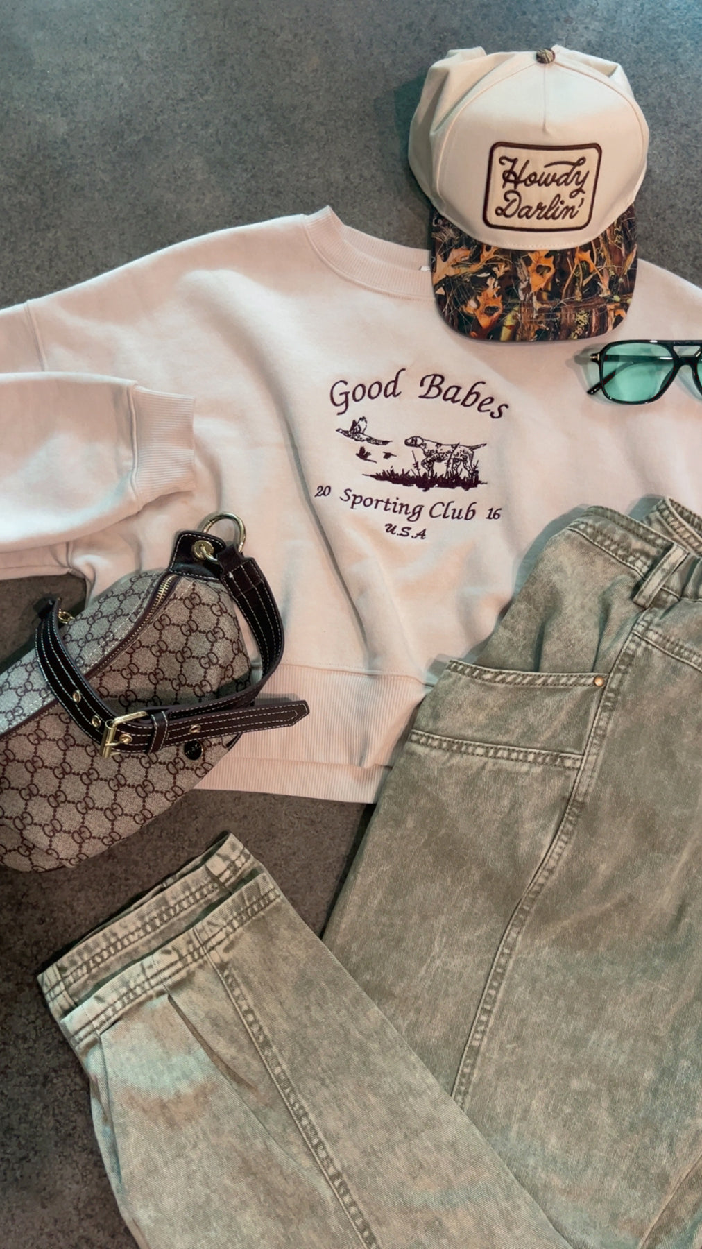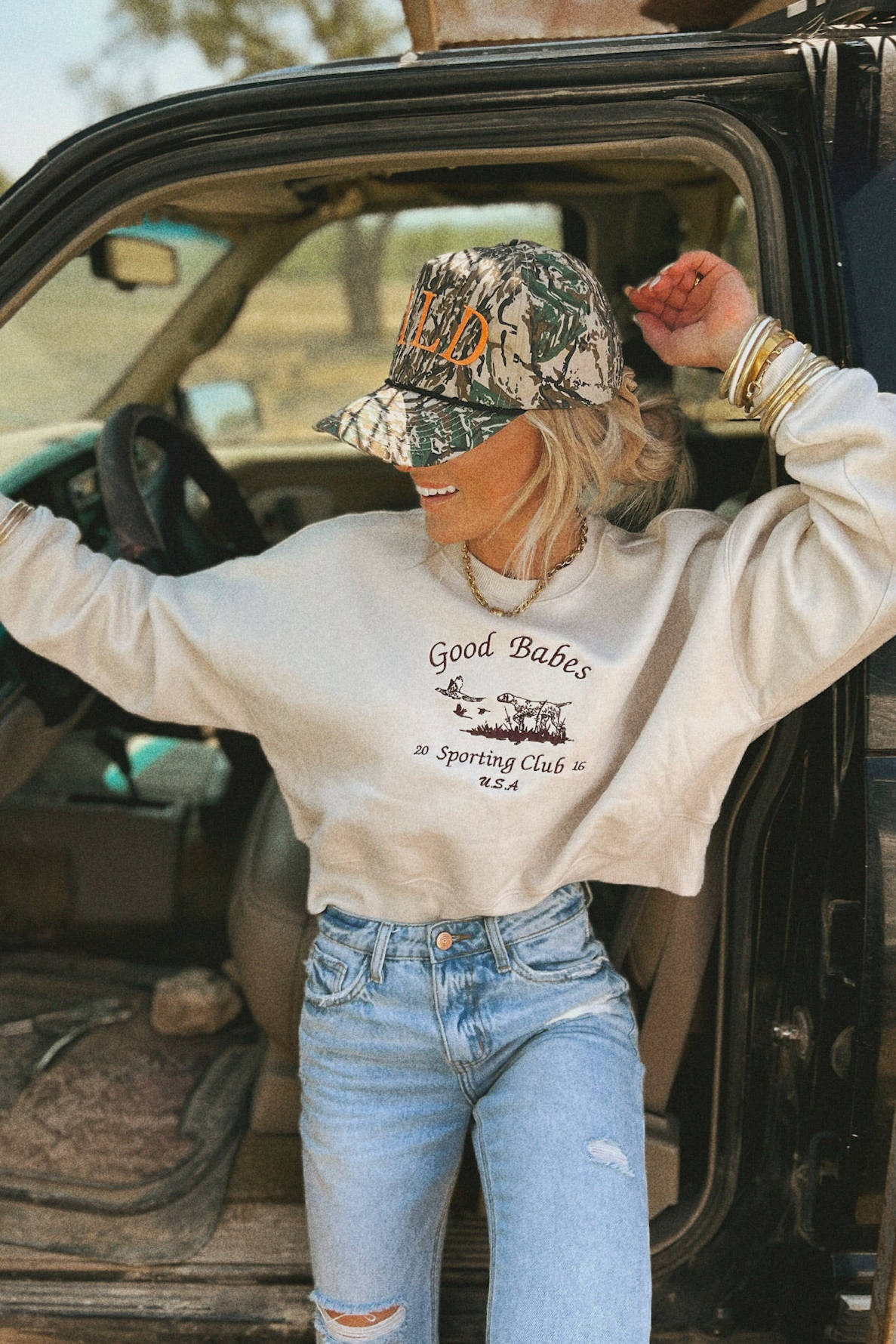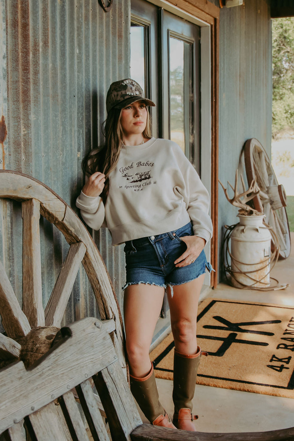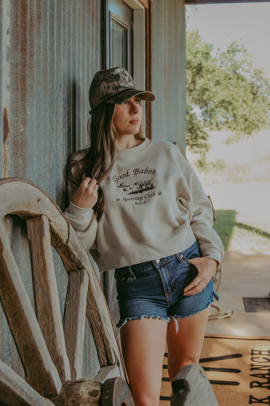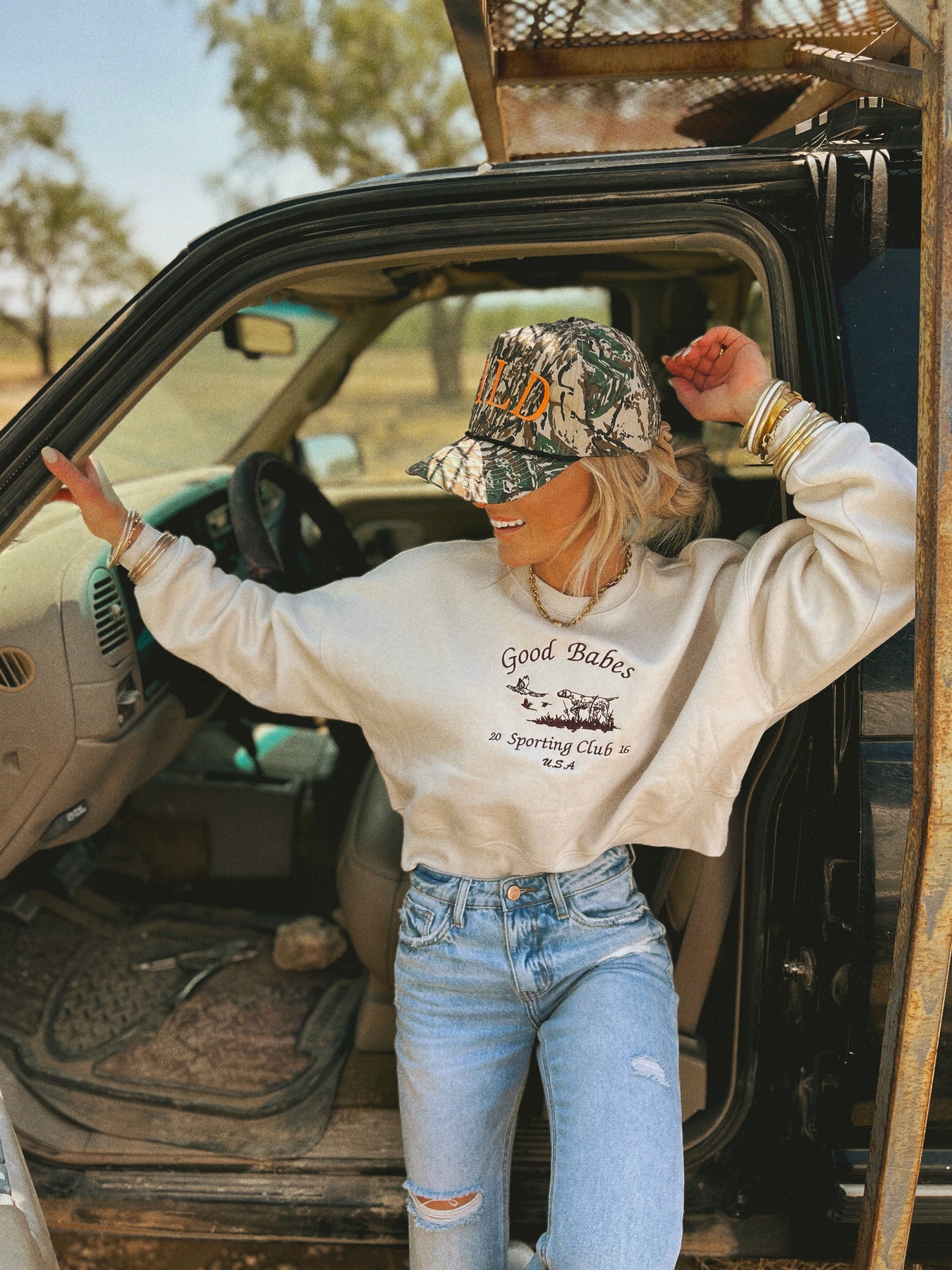Soft, cropped, and ready for anything. Featuring bold embroidery a good ol' bird dog and Good Babes Sporting Club—a cozy essential with effortless style.