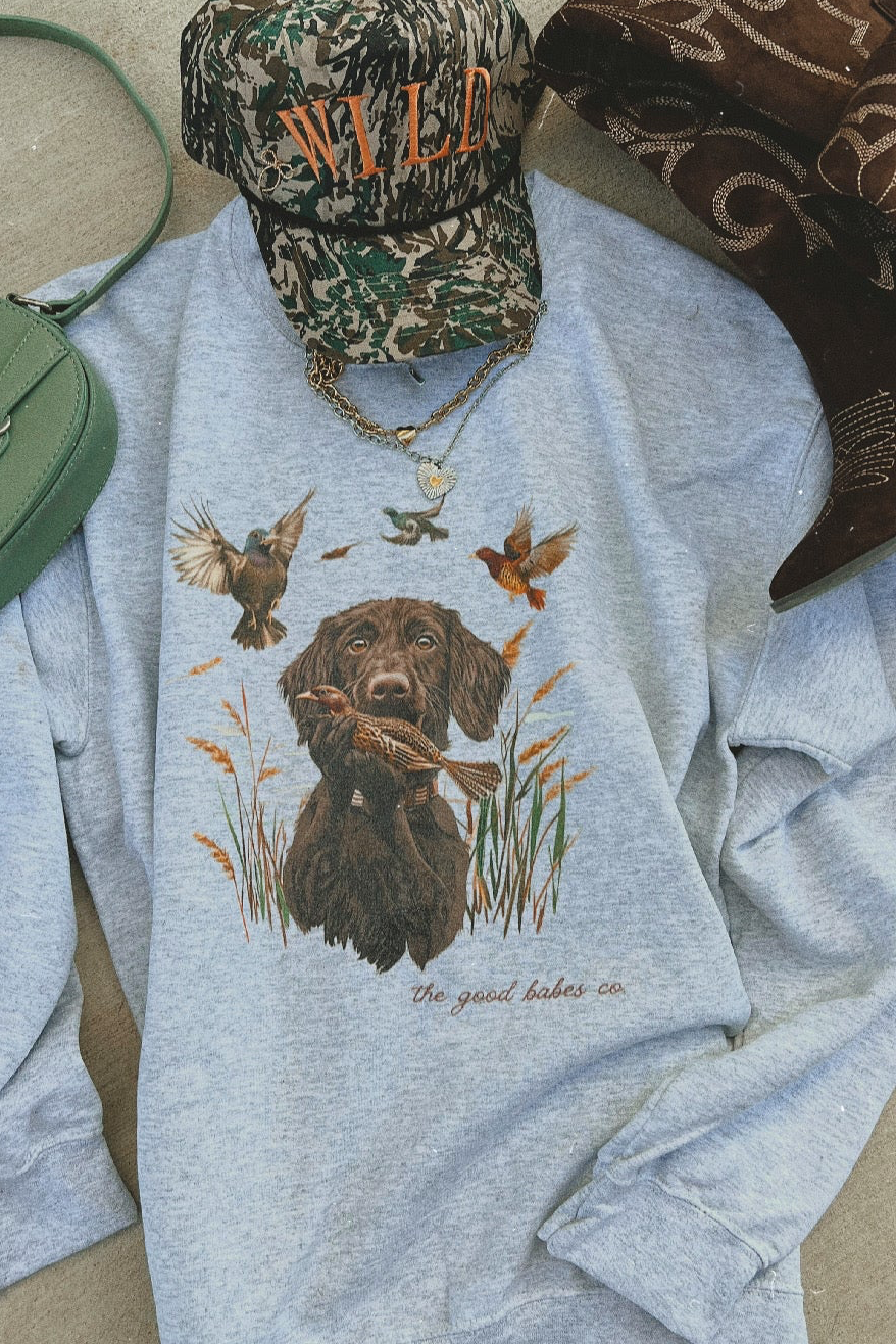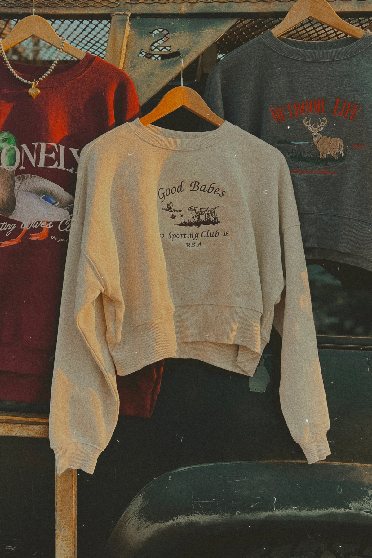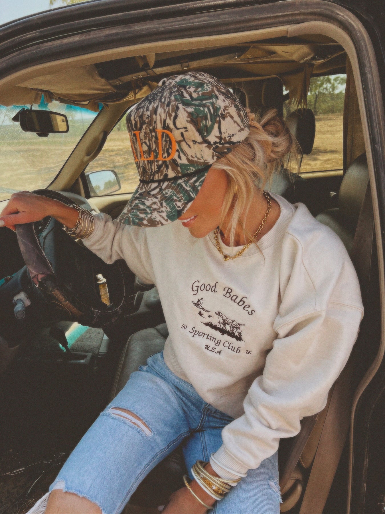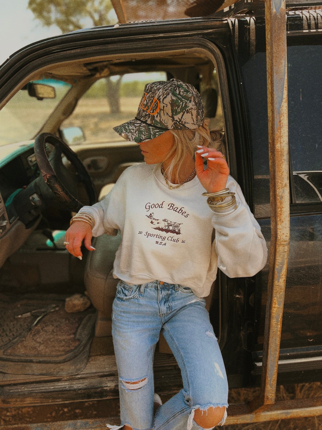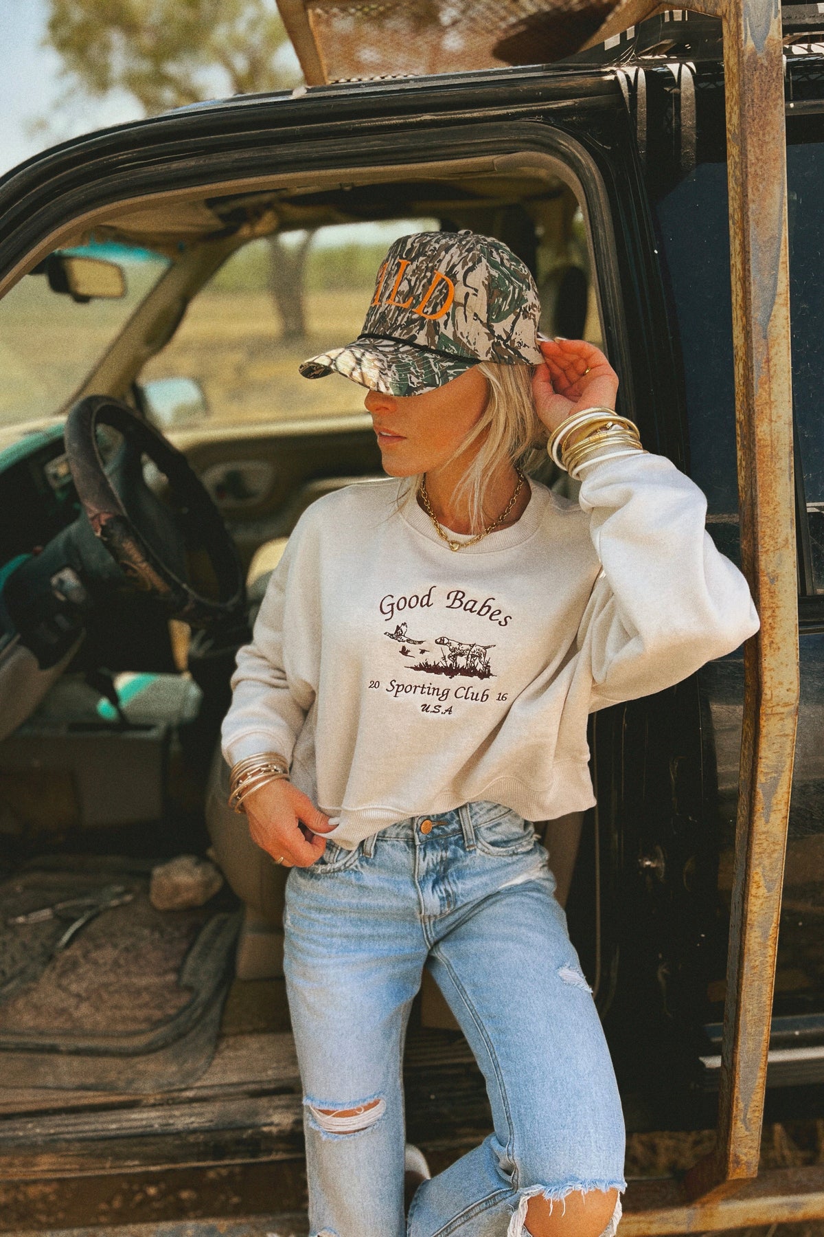 Soft, cropped, and ready for anything. Featuring bold embroidery a good ol' bird dog and Good Babes Sporting Club—a cozy essential with effortless style.