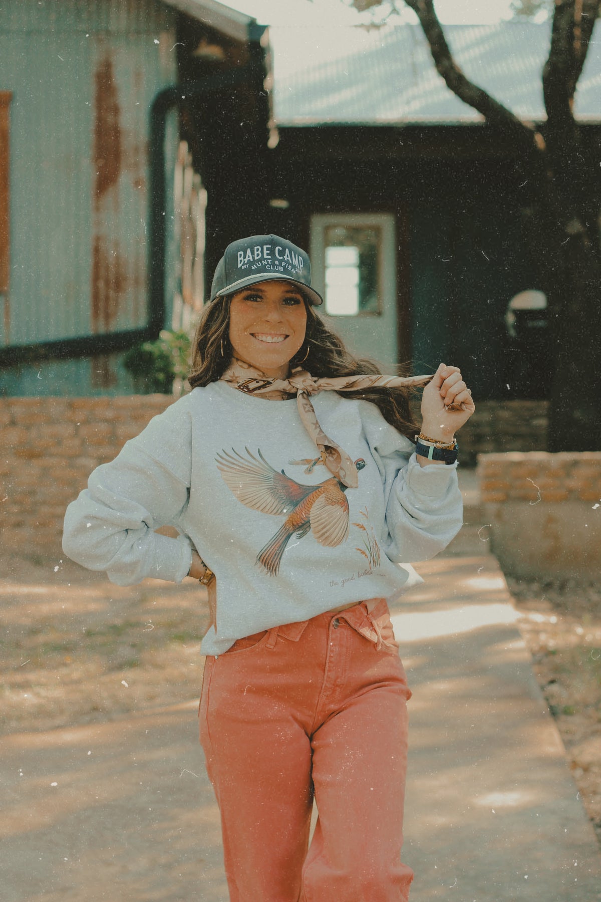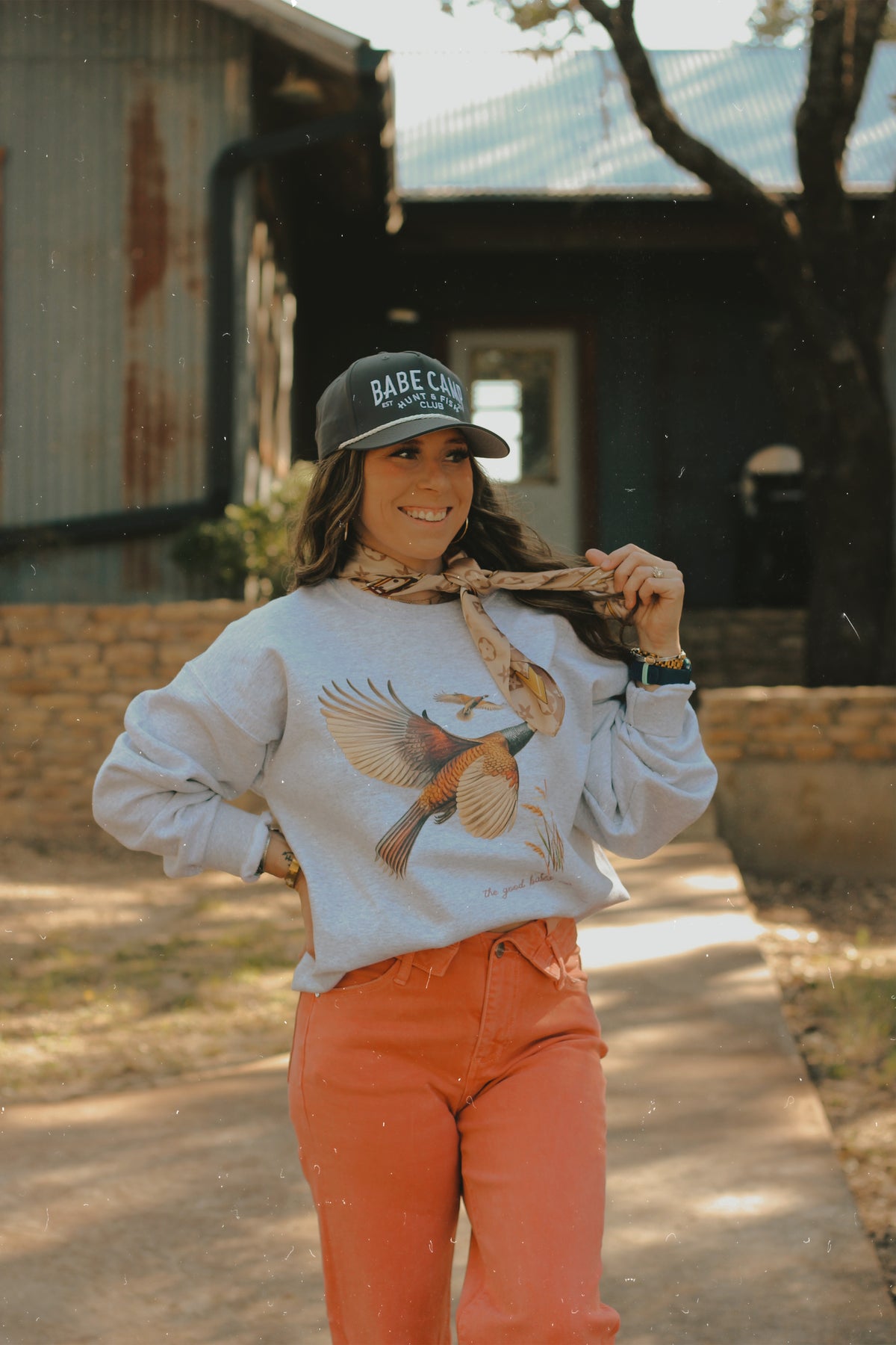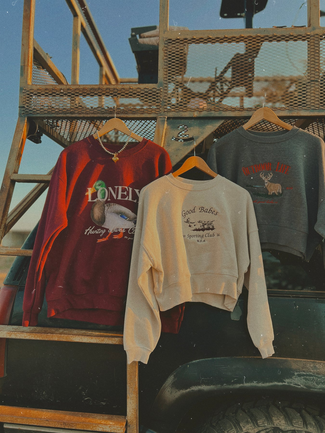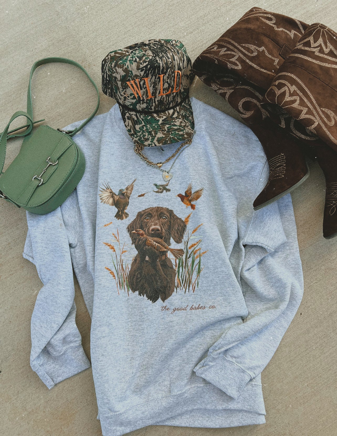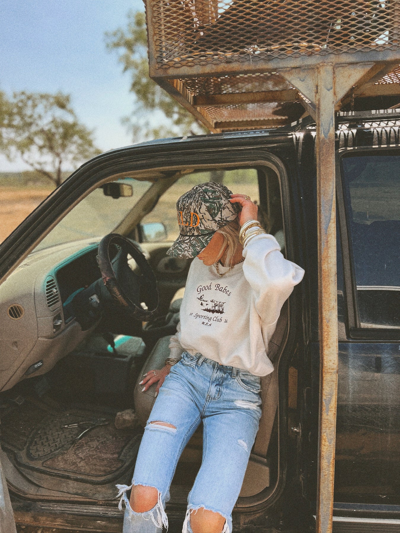 Soft, cropped, and ready for anything. Featuring bold embroidery a good ol' bird dog and Good Babes Sporting Club—a cozy essential with effortless style.