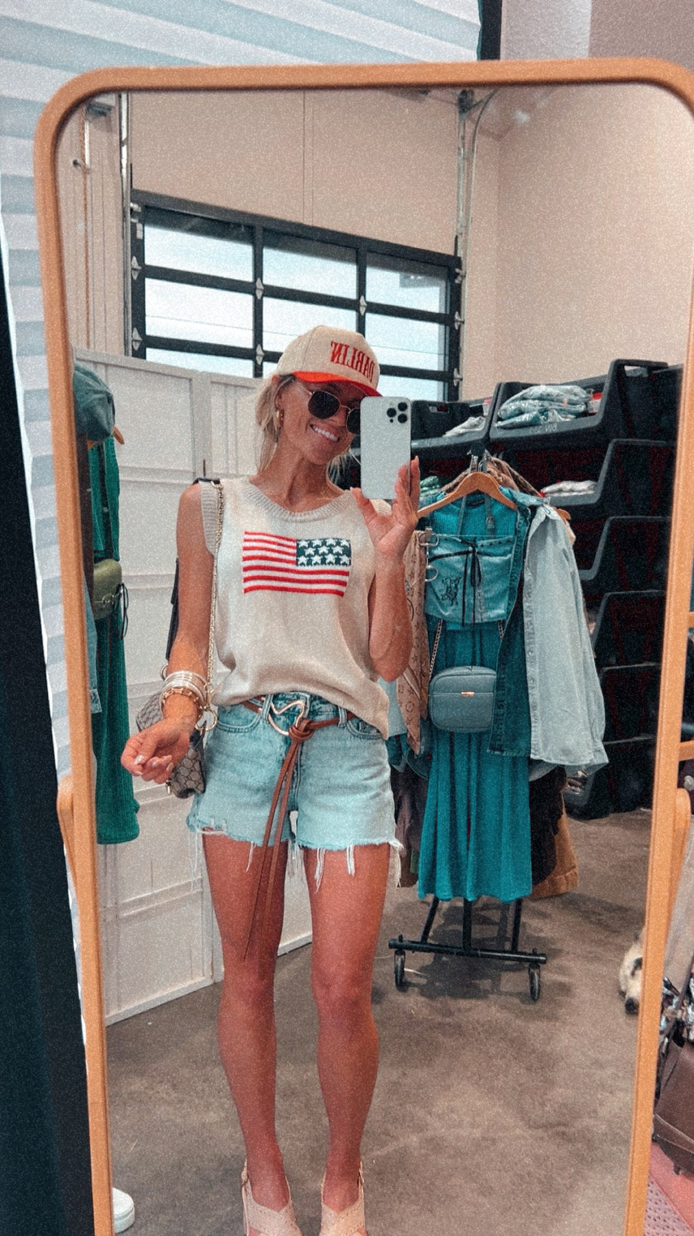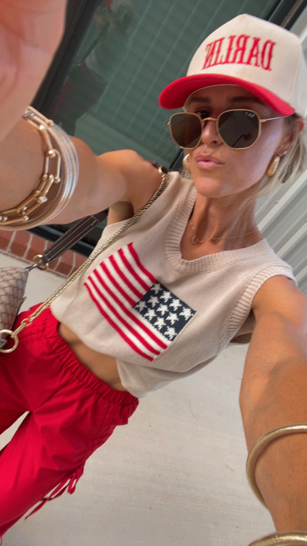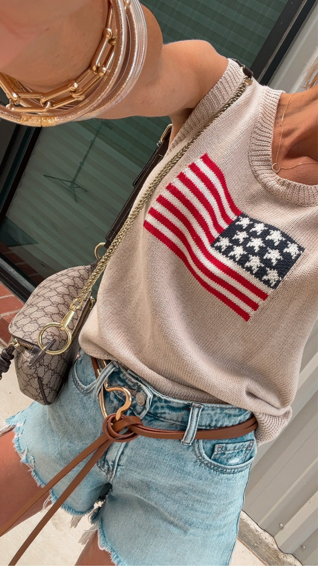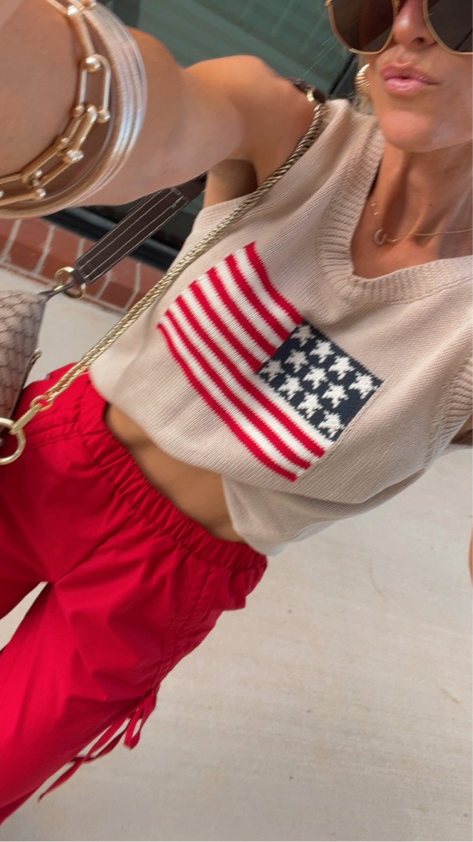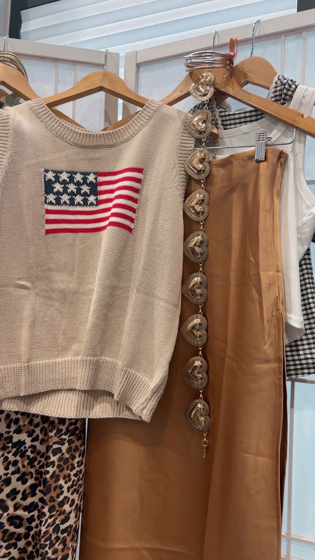 A classic with a patriotic twist. This sleeveless beige knit sweater features a bold American flag design—perfect for layering or wearing solo all season long.