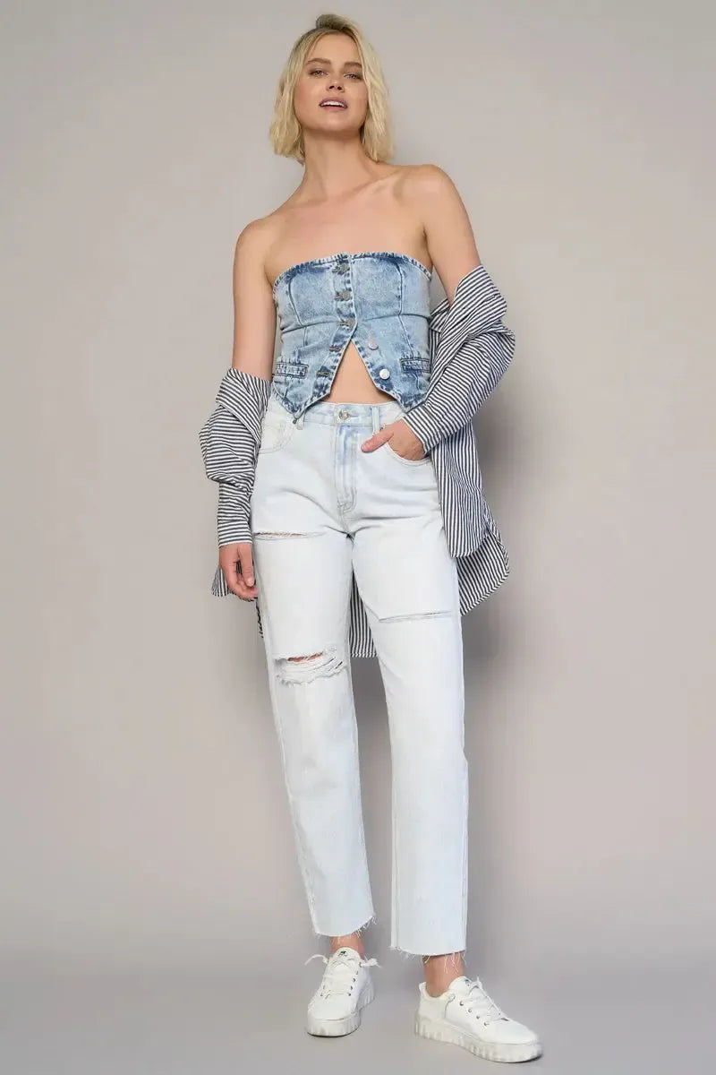 These super high-rise denim shorts feature a flattering fit and a released hem for that perfectly undone finish. Easy to pair, easy to love—your warm-weather staple just leveled up.