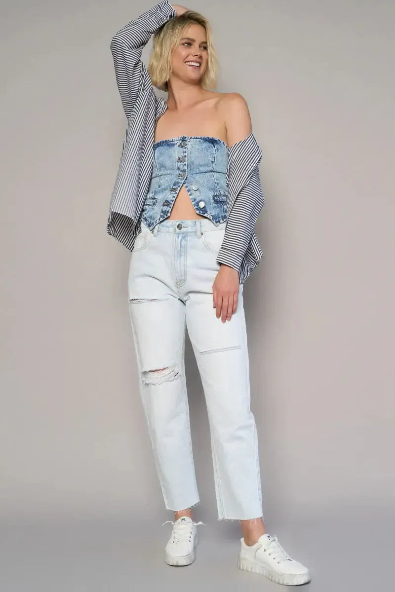 Your new favorite pair of light-wash denim. These ultra high rise 90's style flare feature distressing at the knee, a hidden button fly, and a regular hem. Pair them with a graphic tee for a casual look, or add a blazer and hit the town.