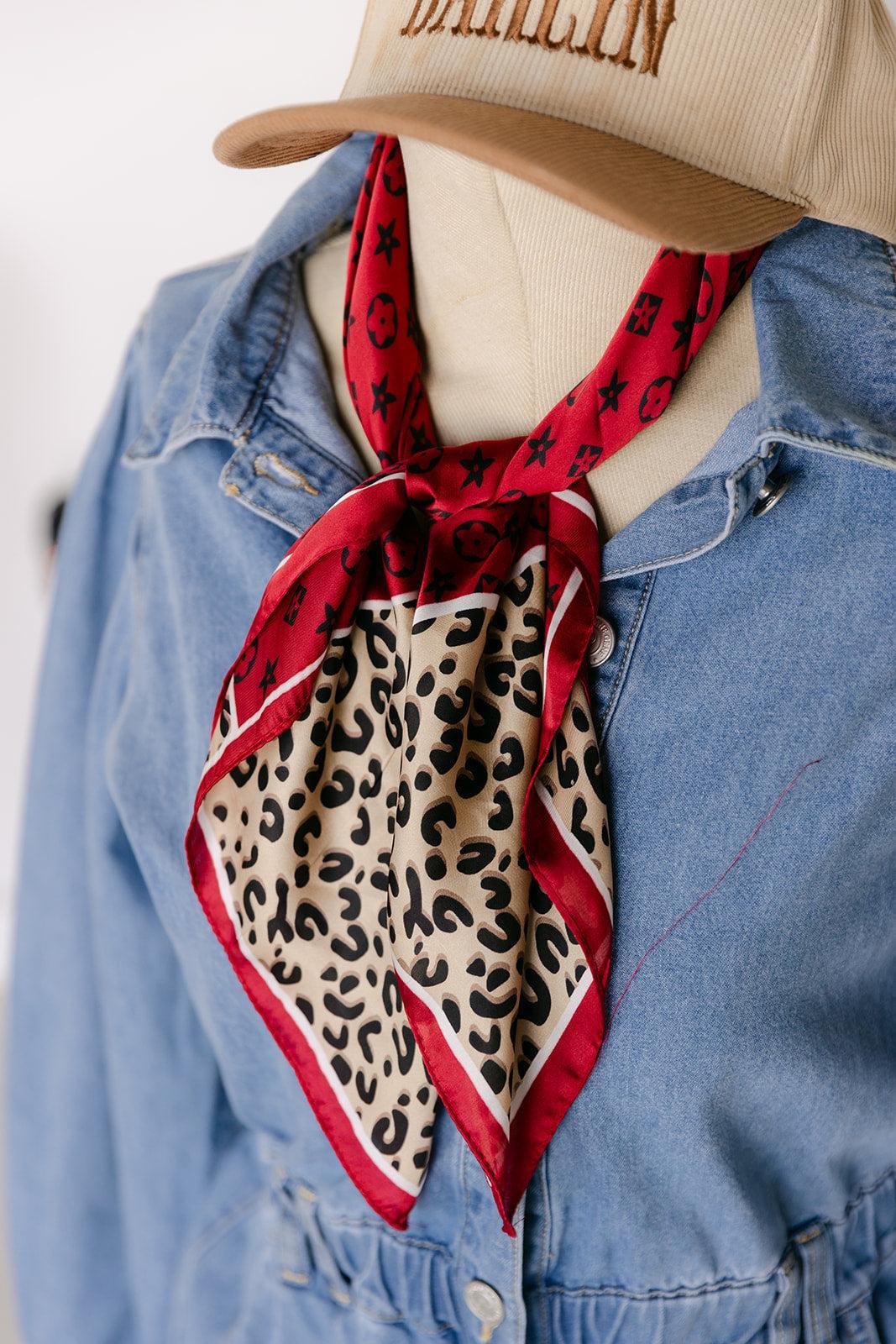 Valentine cherry heart silky bandana. This scarf features a charming pattern of multiple hearts and cherries. Perfect for spreading some love while wearing around your neck, as a headband, or tied on your bag for a chic accent.