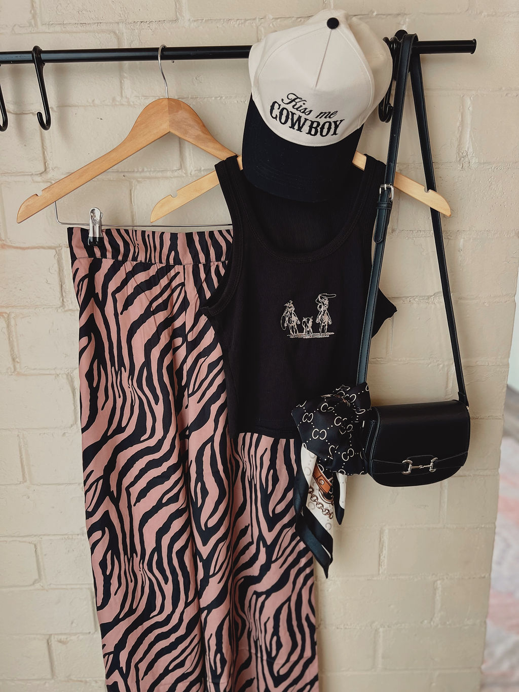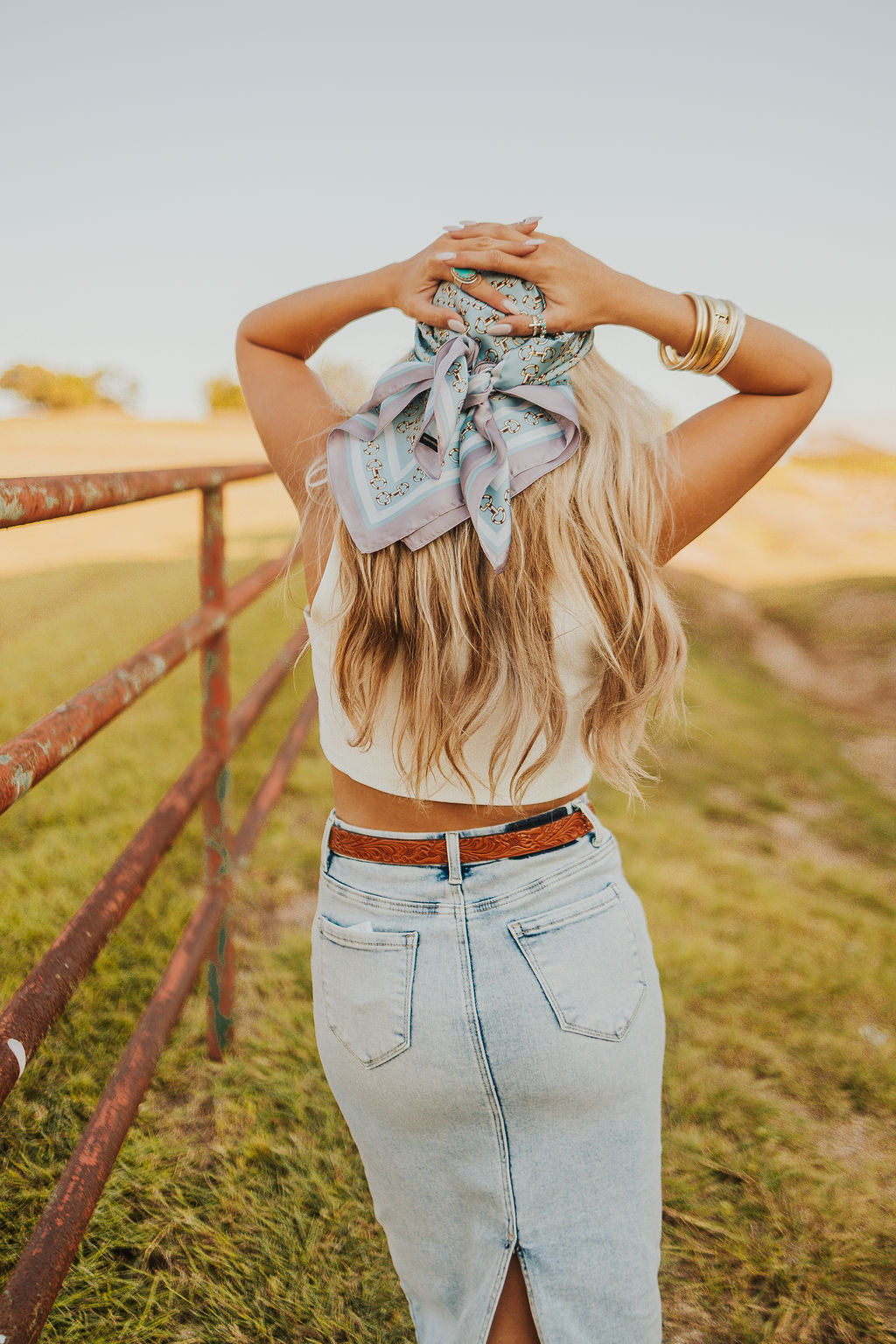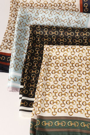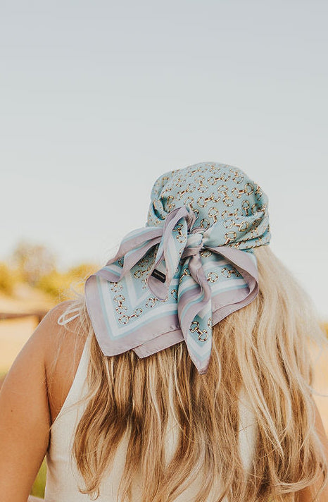 Classic western meets elevated detail. This wild rag features a bold horse bit print that brings a refined, equestrian edge to any look. Wear it around your neck, in your hair, or tied to a bag—versatile, timeless, and made to ride through every season.