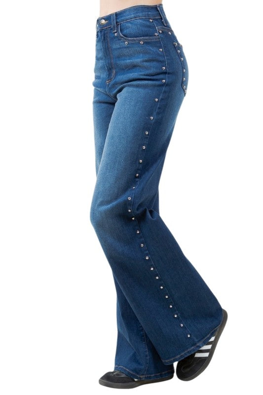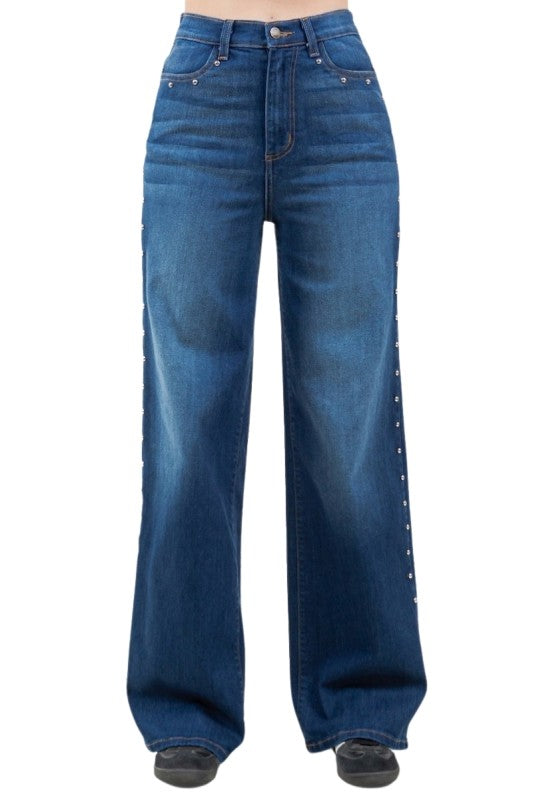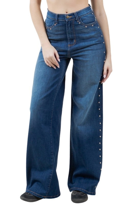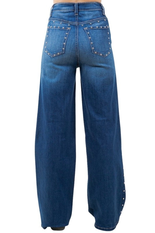 Introducing the Camila Wide Leg Jean! These jeans are made from premium 11 Ounce Soft Stretch Rich denim that offers both durability and comfort. They come with front and back pockets, and a button and zipper closure. The Medium Blue Wash is complemented by delightful whisker details and hand pressed studs through out the garment. Proudly made and washed in the USA, these jeans are the perfect blend of fashion and function!