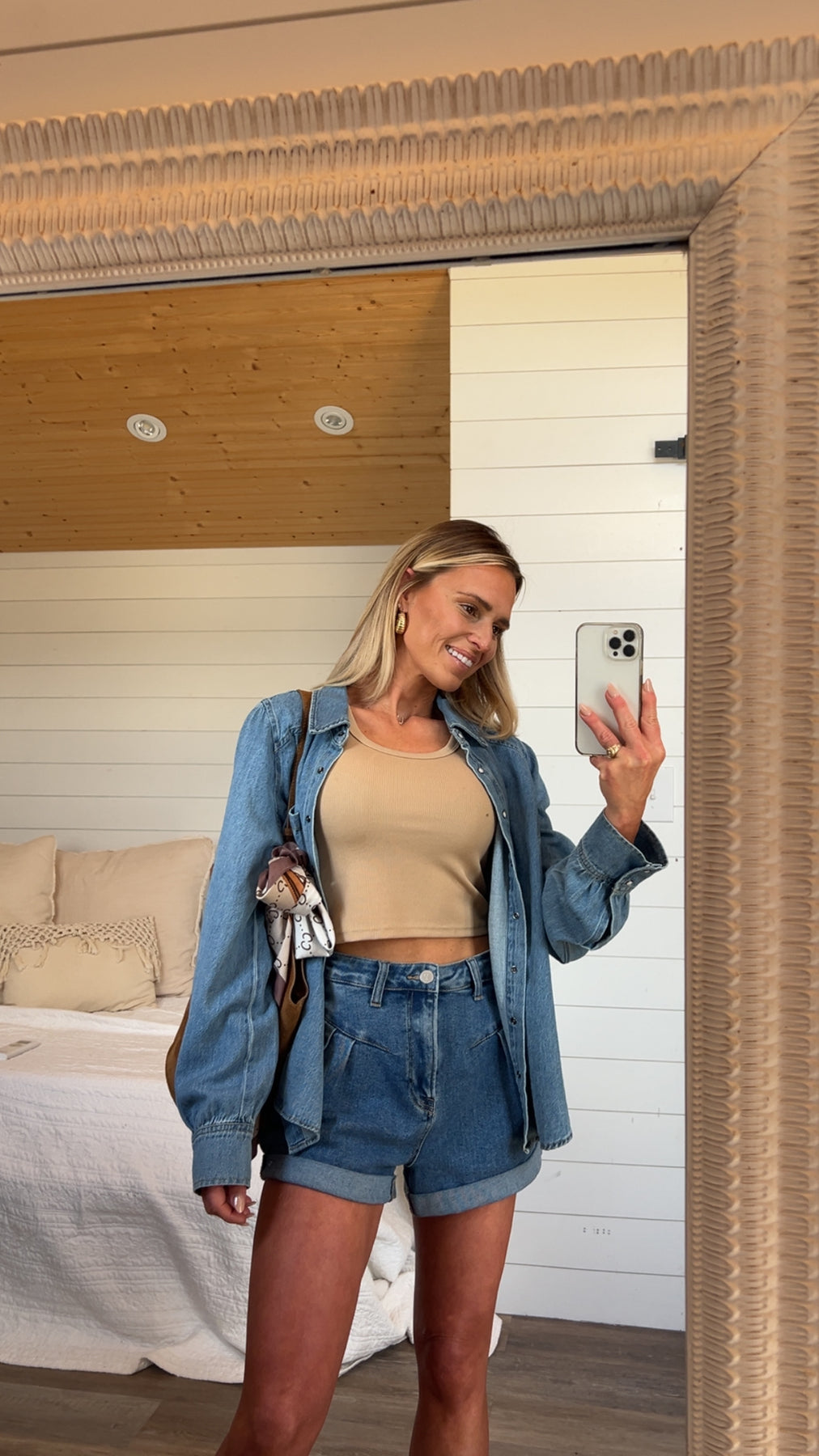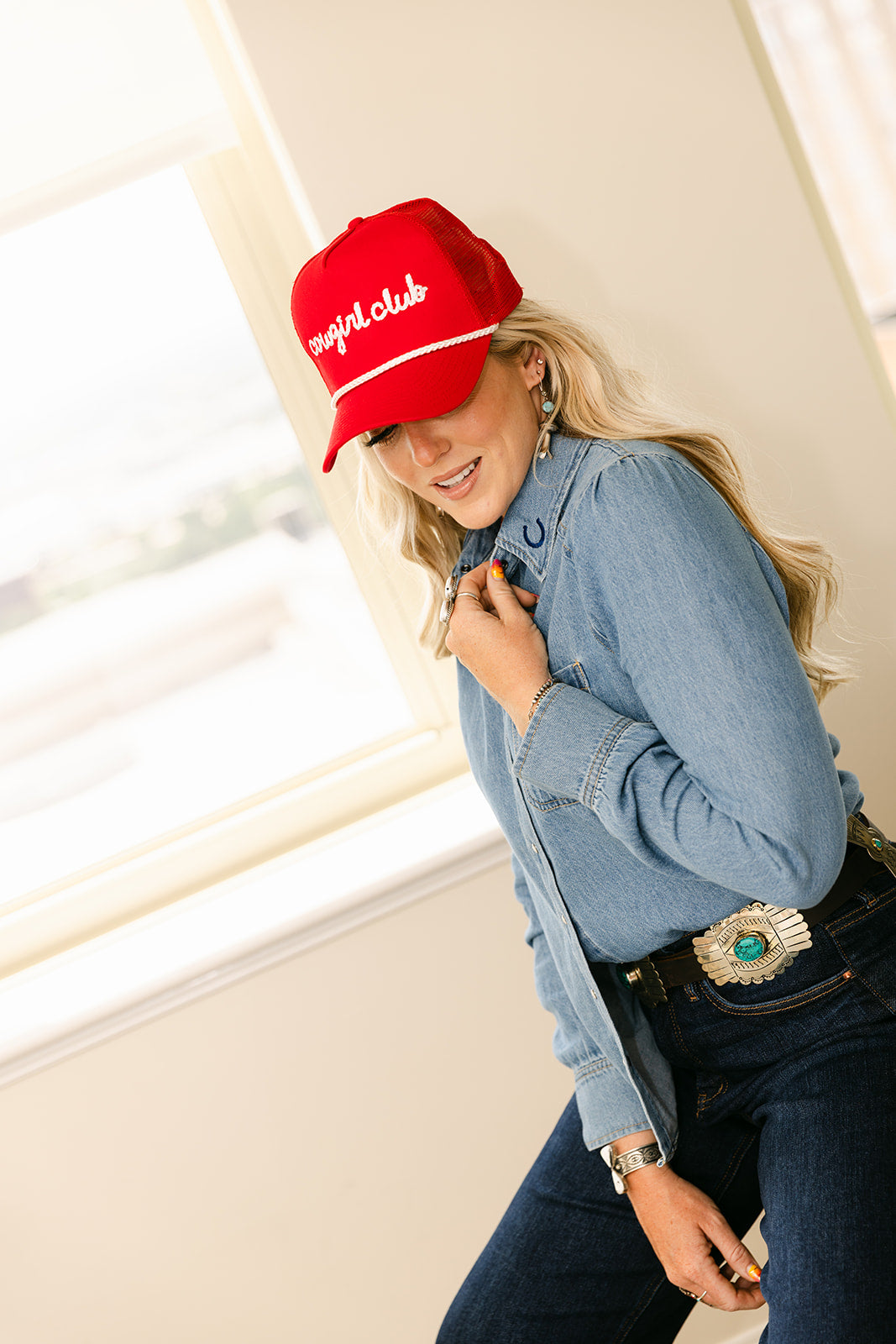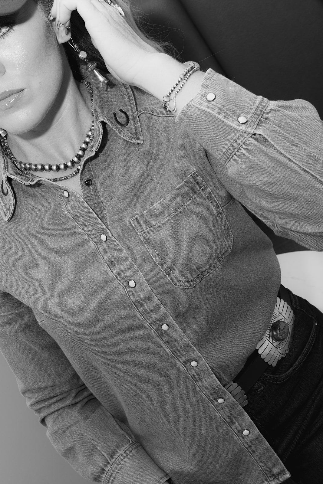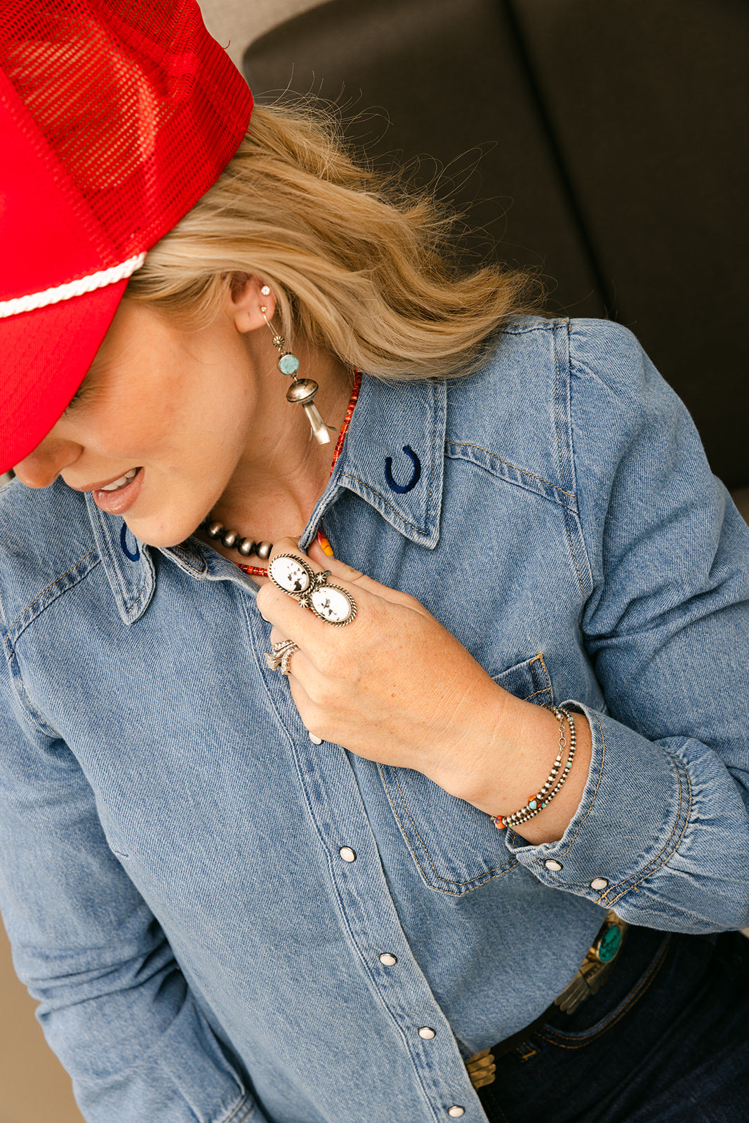 Our Horseshoe Denim Shirt is your new go-to for everything from rodeo nights to weekend brunch. Made from 100% cotton, this button-down beauty brings a soft, breathable fit with a flattering puff sleeve and pearl snap closures for that classic Western touch.