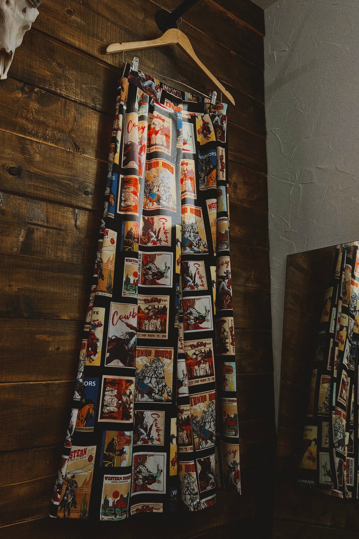A customer favorite. The Roxanne Trouser Pant features an all-over cowboy stamp graphic with a high-waisted, trouser silhouette.